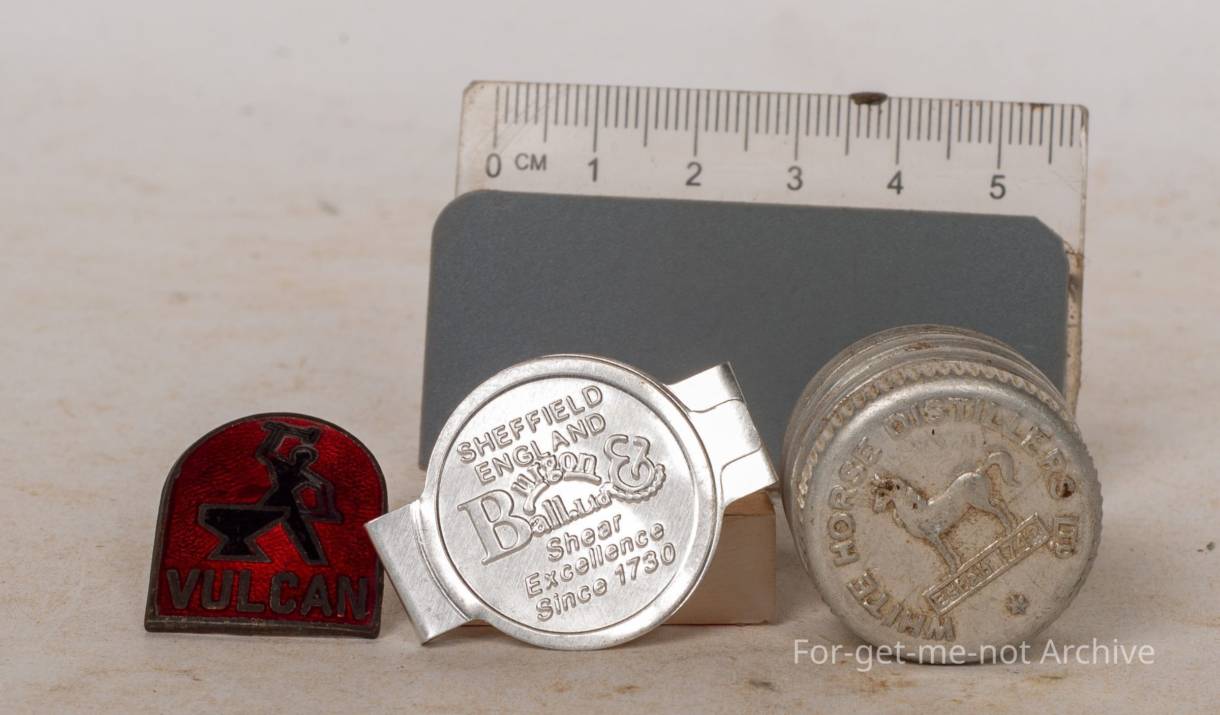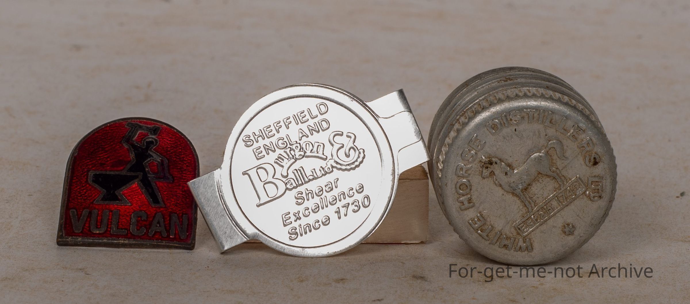 This is the lid from a bottle of light horse distillers, which was whiskey, beautifully embossed in the top, perfect condition. The second piece is the little clasp from Bergen and Ball, blades to keep the blades safely together. Once again, wonderful condition. The 3rd piece is a little enamel sign from Vulcan with a tradesman using an anvil. Lovely piecesCollection