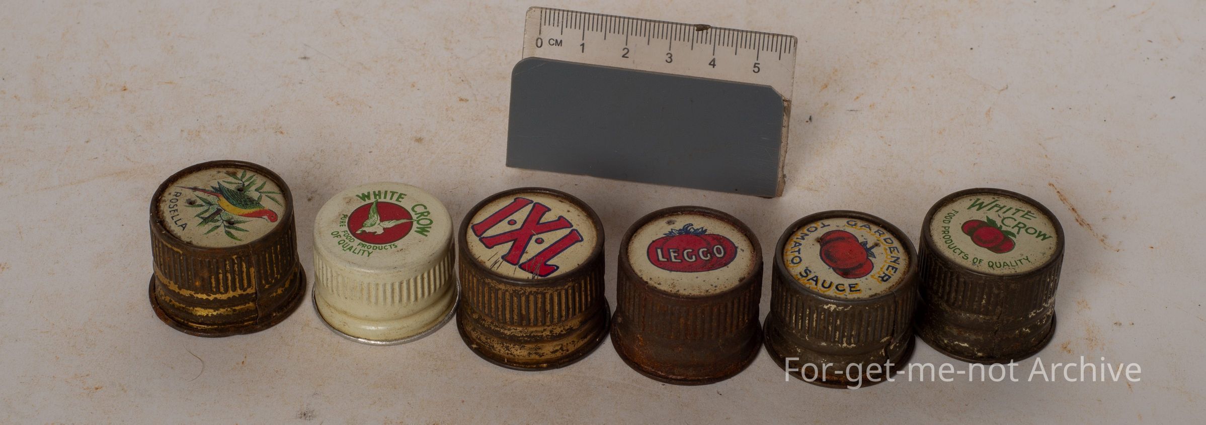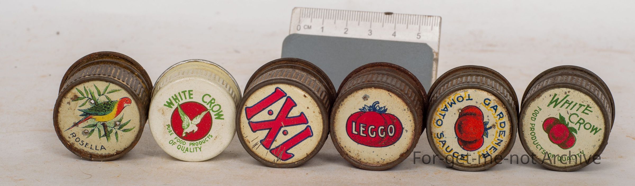 This is a group of 6 lids of tomato sauce bottles advertising. Legos, White Crow, IXL, a different White Crow, Gardner tomato sauce and Rosella. These were commonly used, on other bottles and turned into salt shakers. These 6 are in beautiful condition.Collection