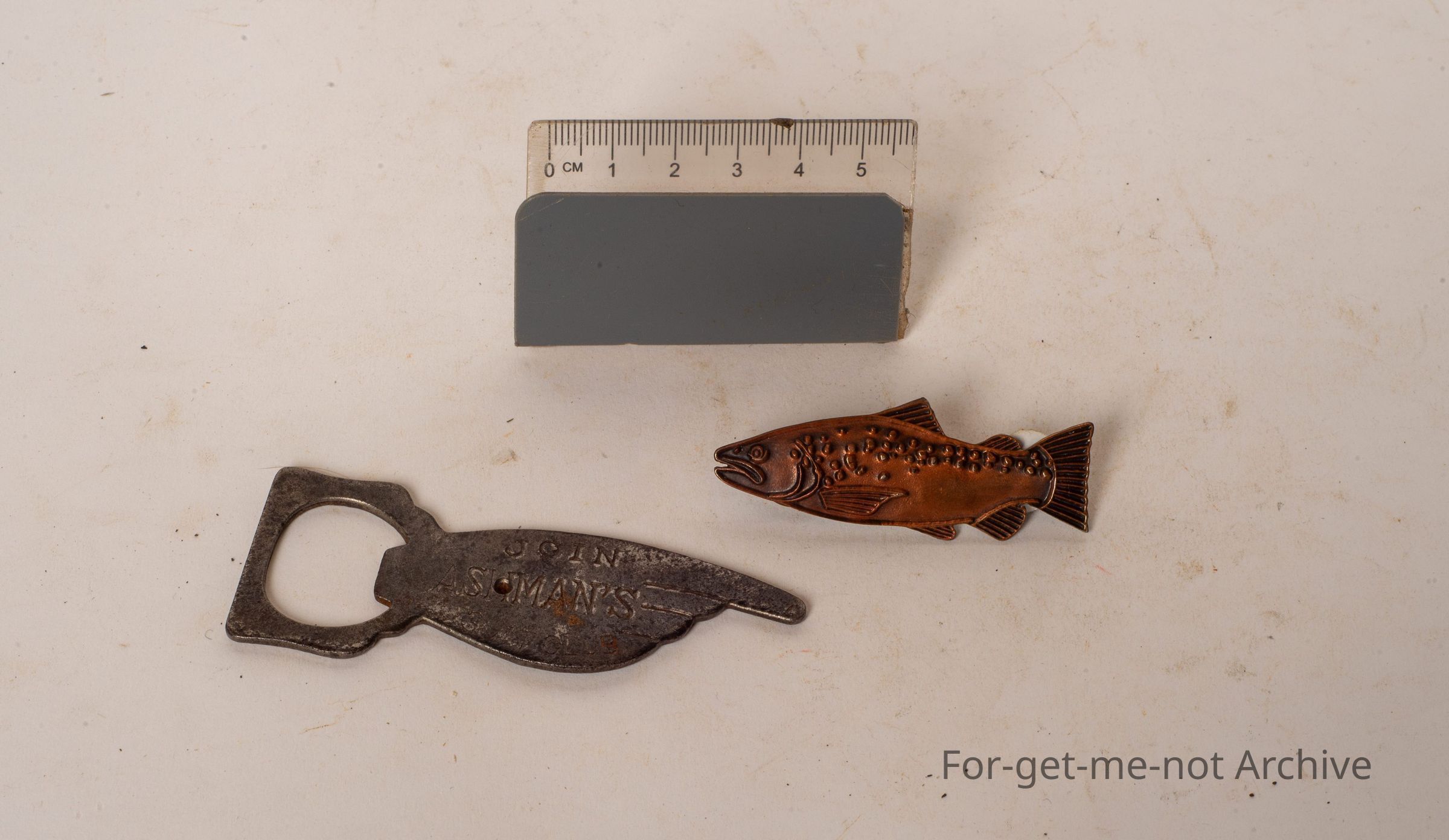 1. is a brown trout hat pin. 2. is a bottle opener which has written on it join Ashman's suit club.