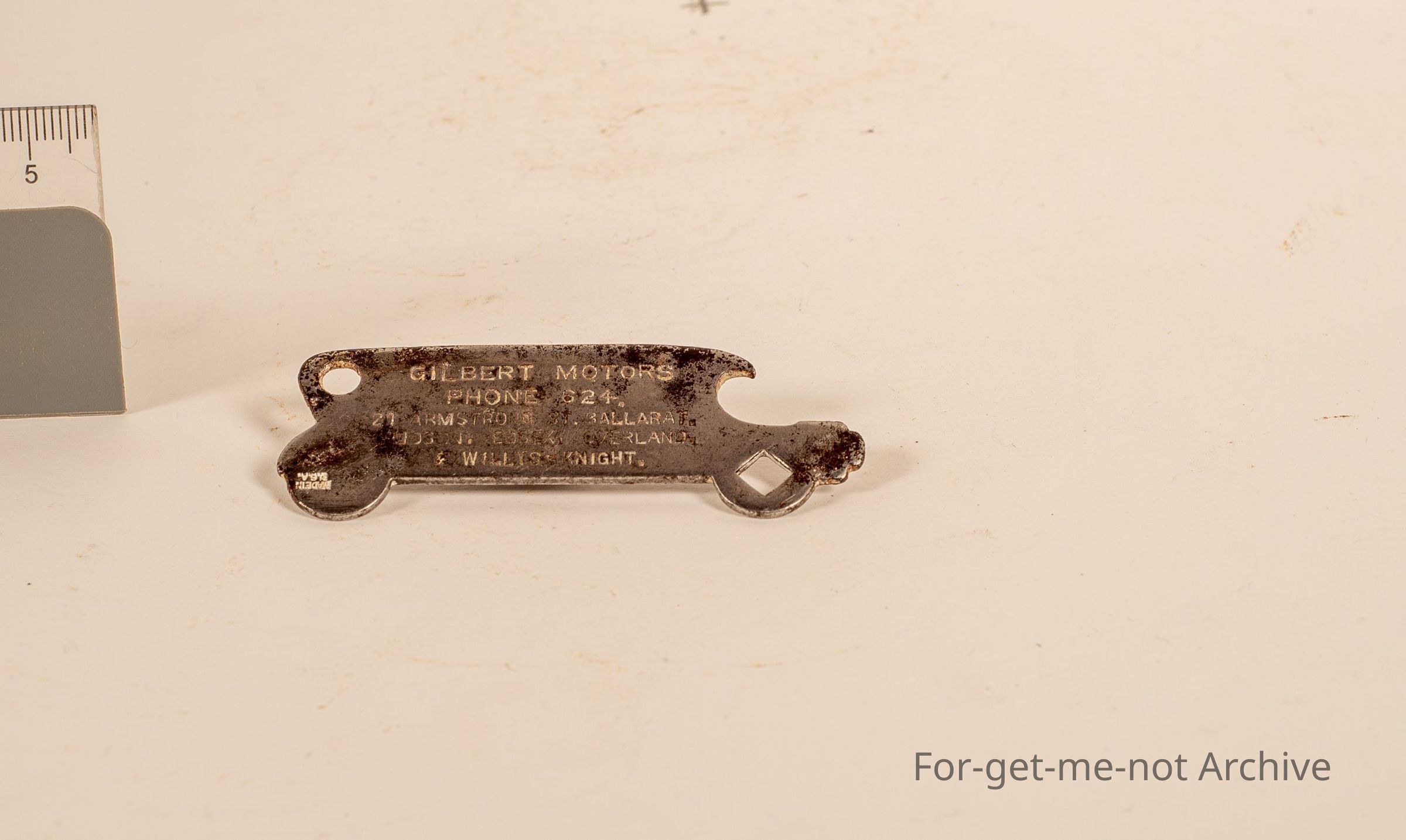 Advertising bottle opener, crown seal opener in the form of a very early bus, advertising Gilbert Motors, phone number, with all the brands they carry