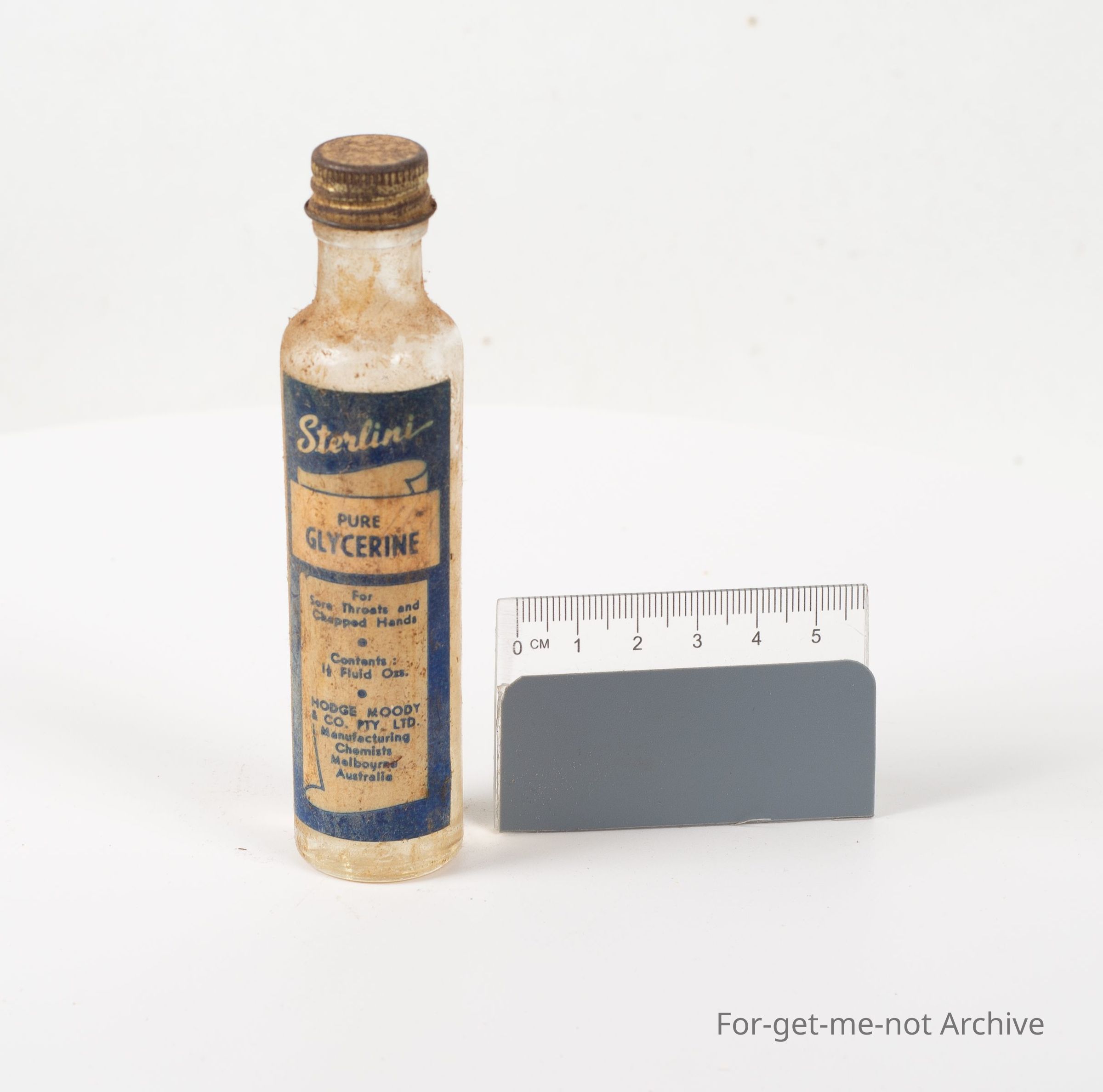 Tall thin glass bottle for Pure Glycerine. Product Name "Steriline". Manufactured in Melbourne Australia.