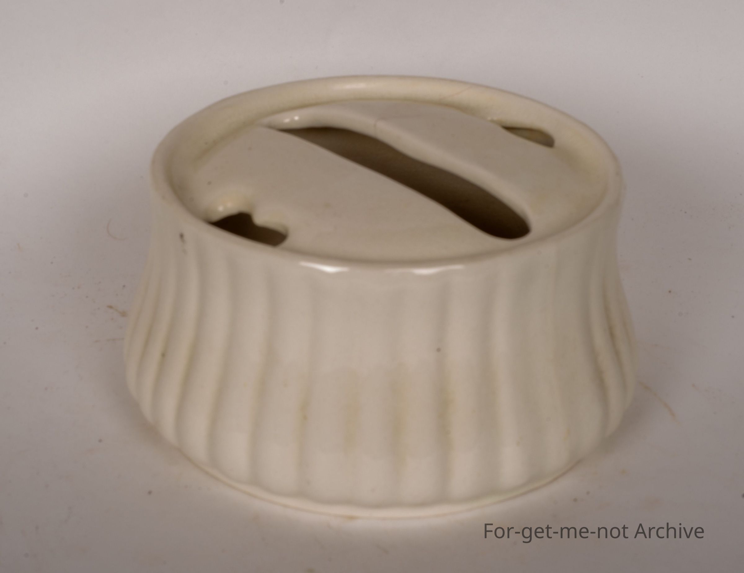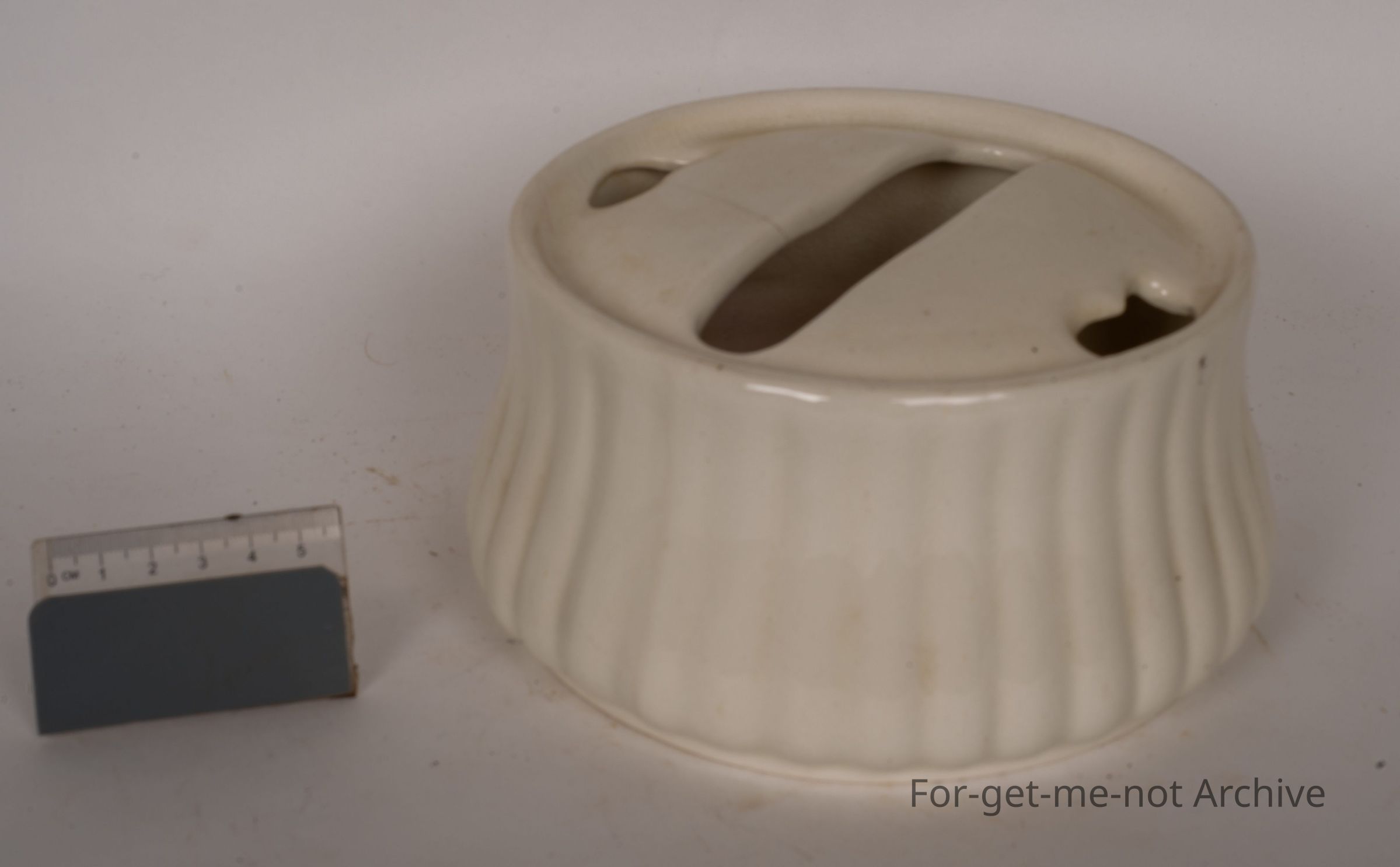 a bowl, with a wide entrance at the top for putting a brush in, fluted all around the outer perimeter. These were used in the days of putting posters on SEC poles or shop frontage advertising events. Not easy to find. This one, slight crack but otherwise in good condition.Collection