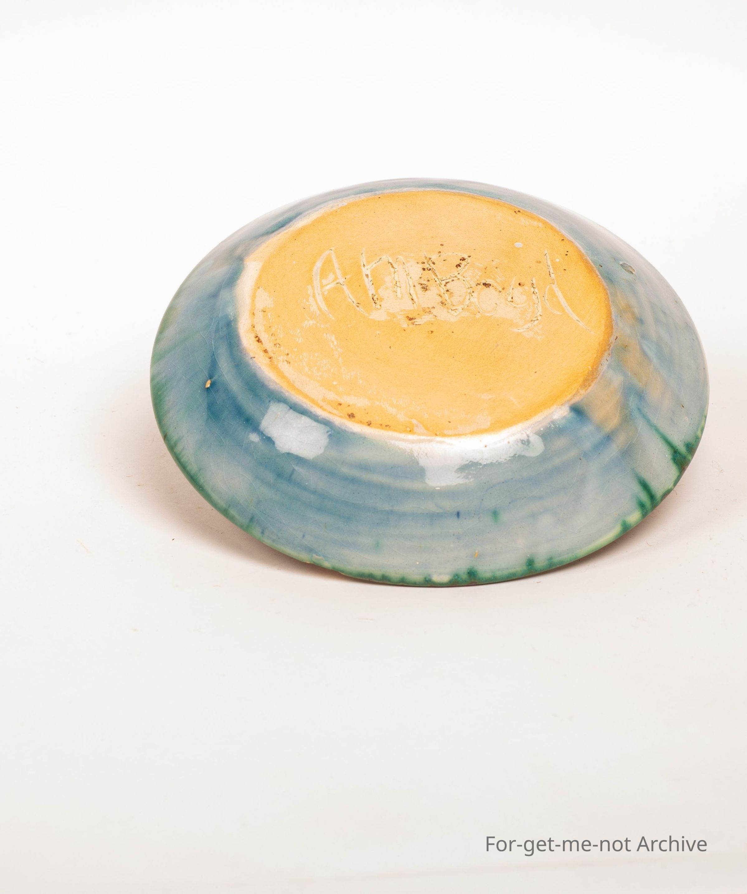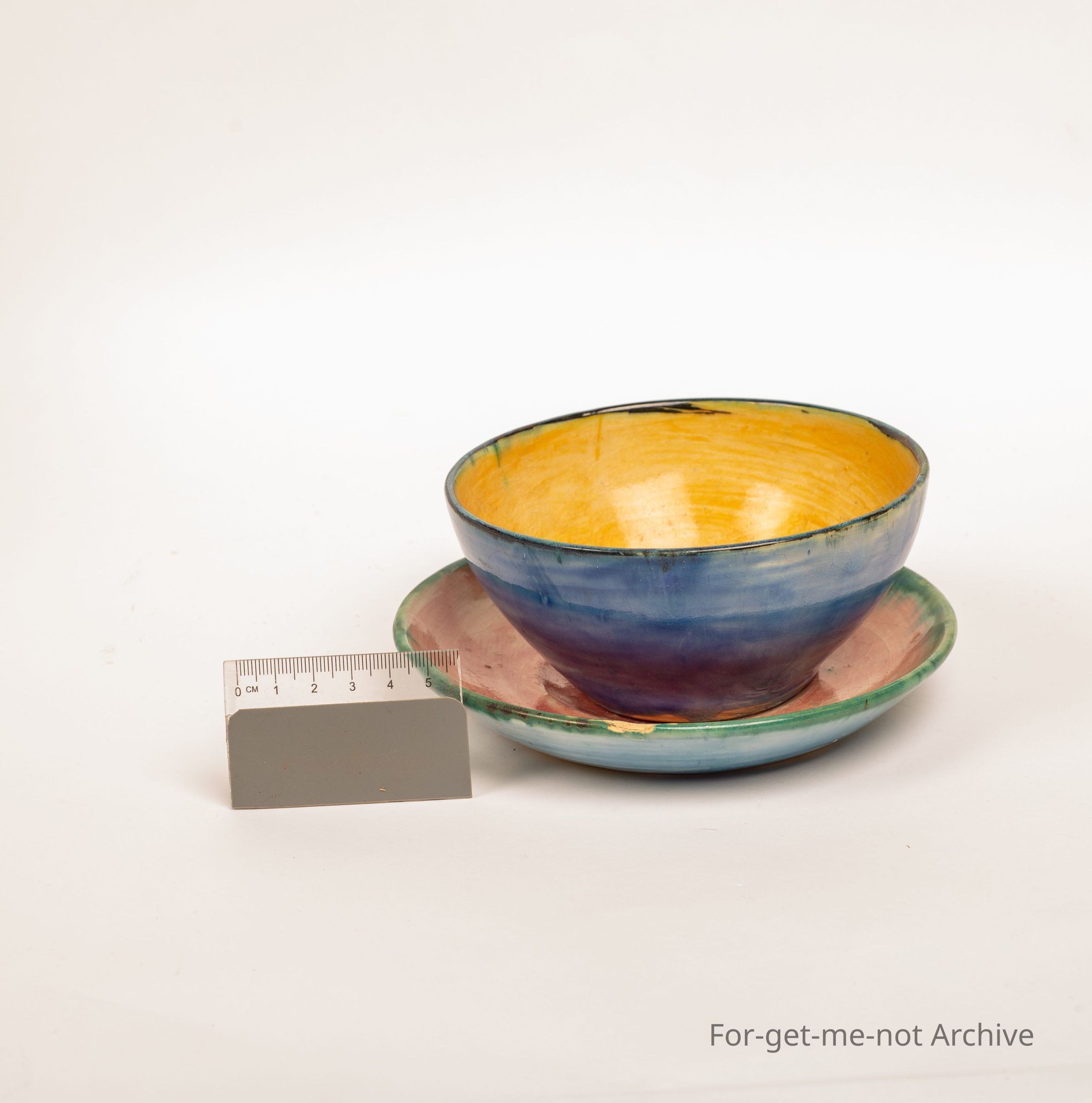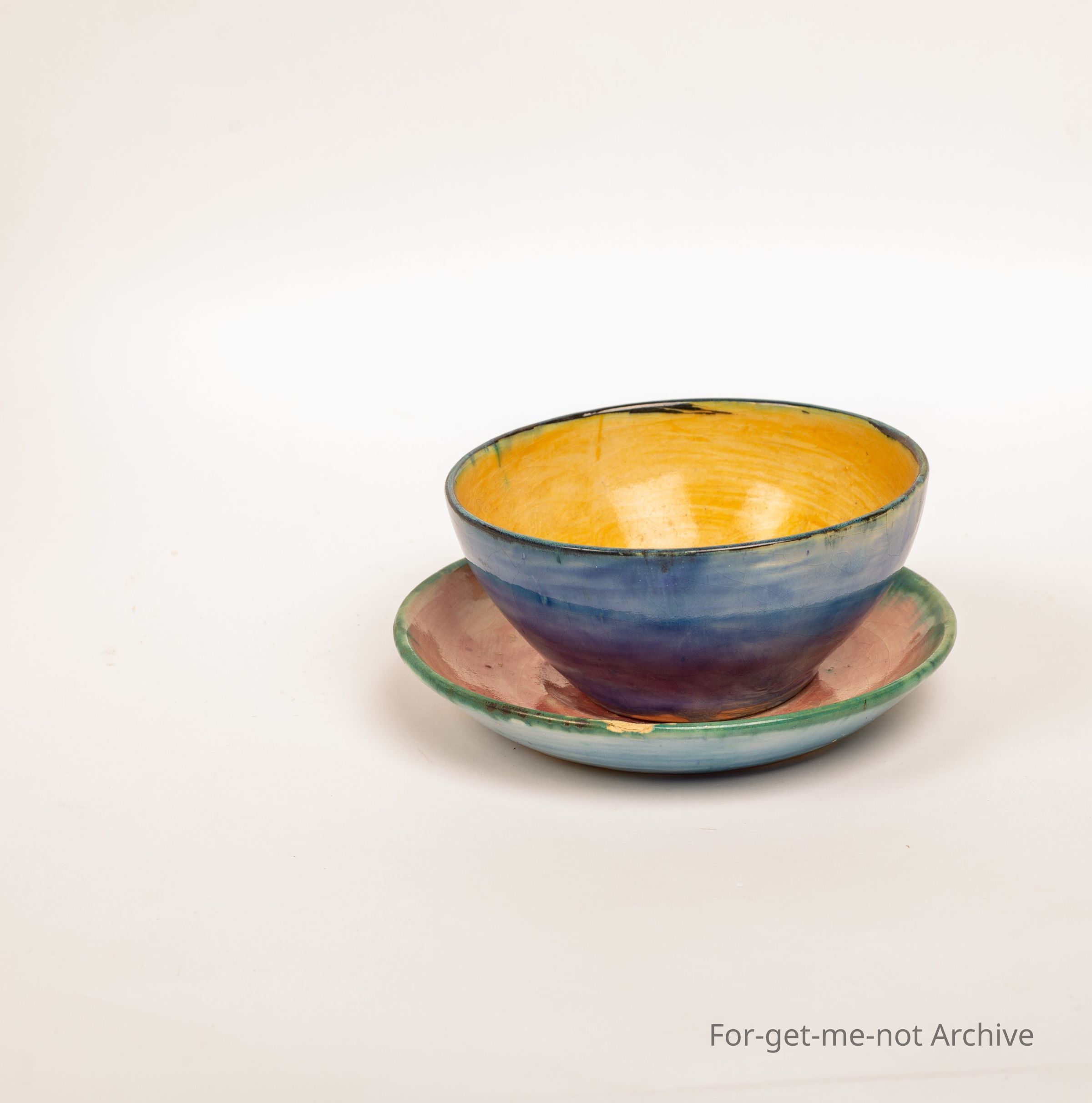 Bowl and saucer. Once again from the combination of Arthur Boyd and John Percival, variable colours, but unique . Signed a and b are the Merrick Boyd.