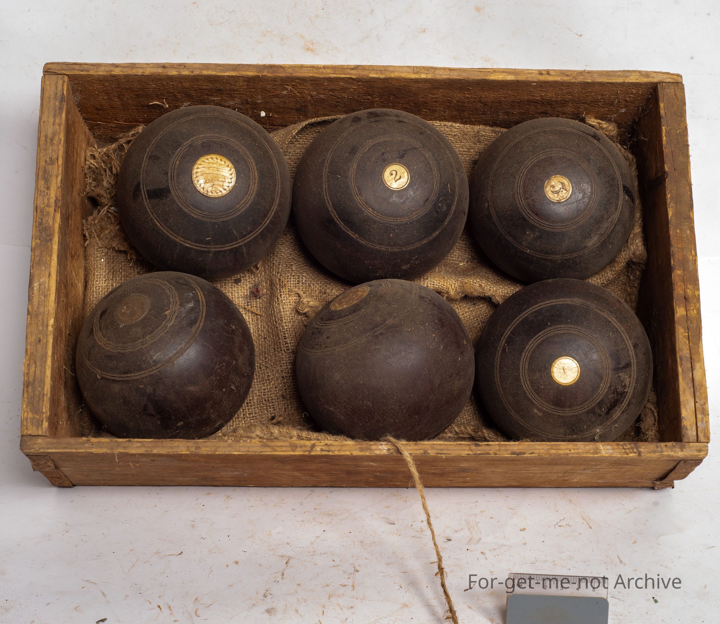 These are a set of 6 wooden bowls balls. The big, main one is also here somewhere. These balls came from Harold Kerr, originally, given to his son, Don, and then handed down to me, a non bowler. These are possibly lingam vitae wood. I know the big one is stamped lingam vitae.Collection