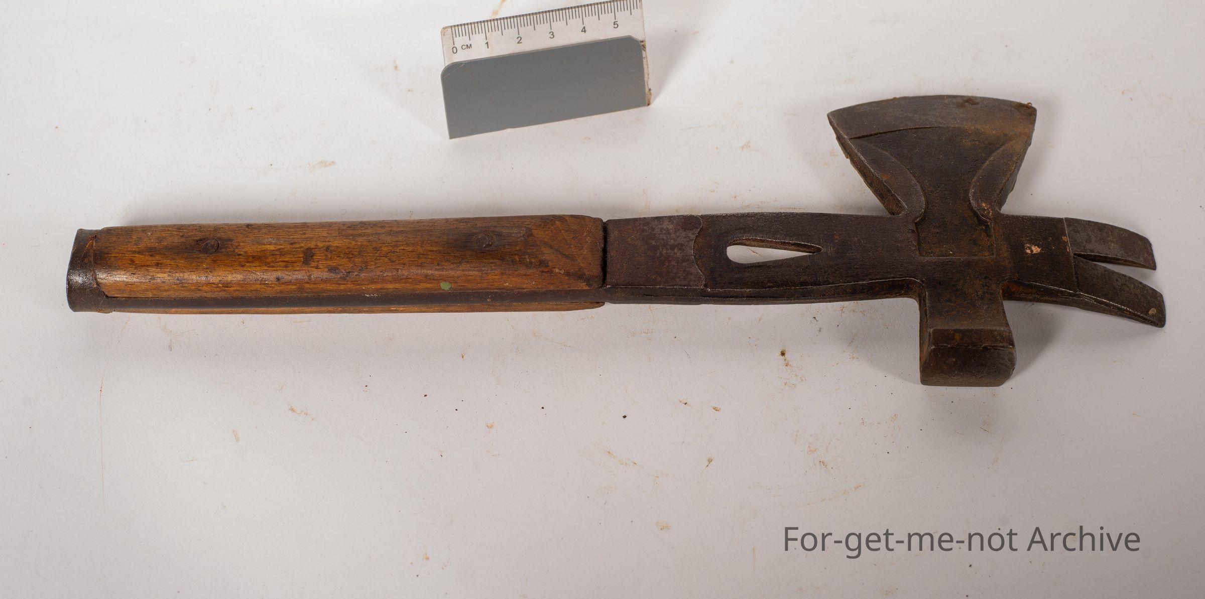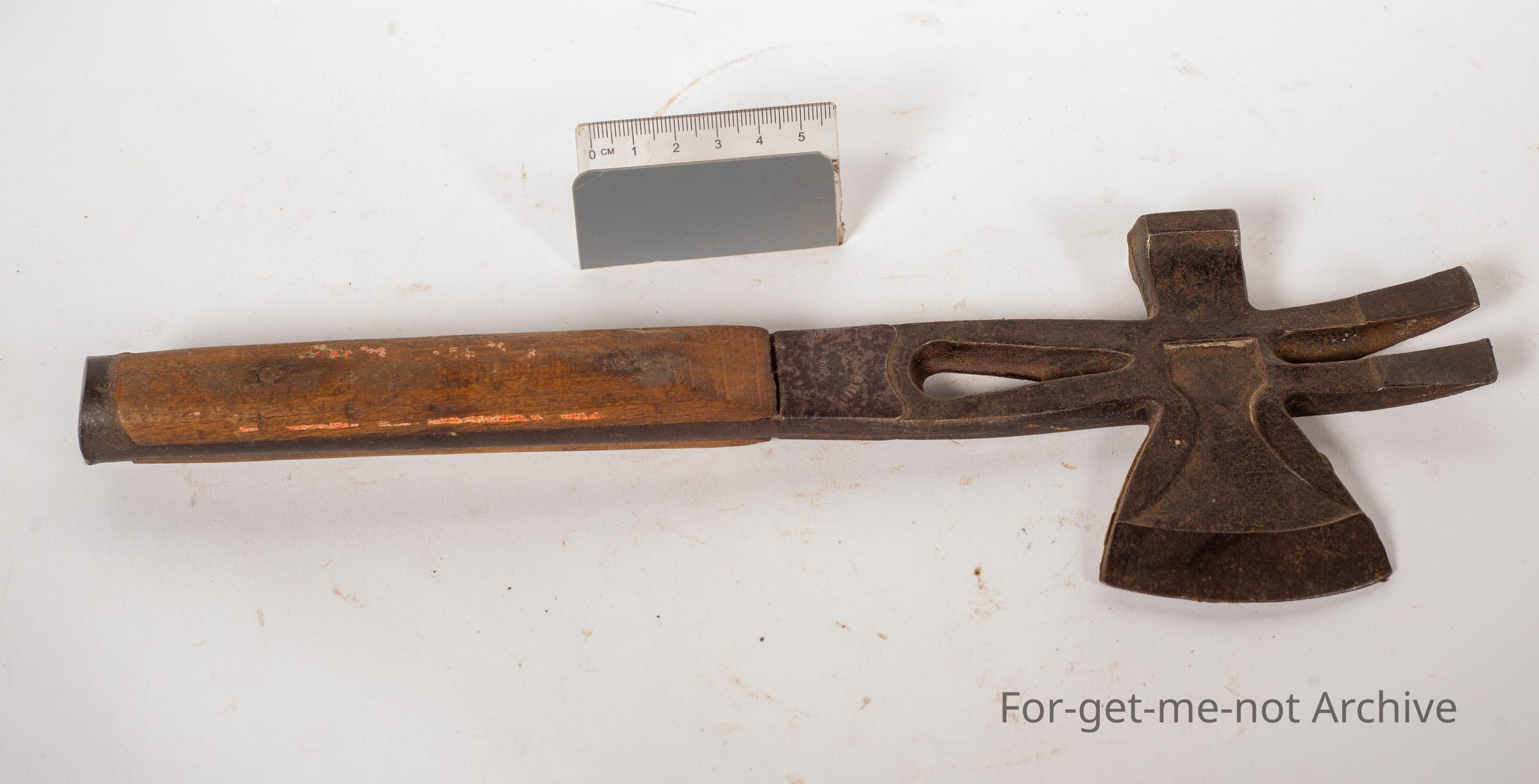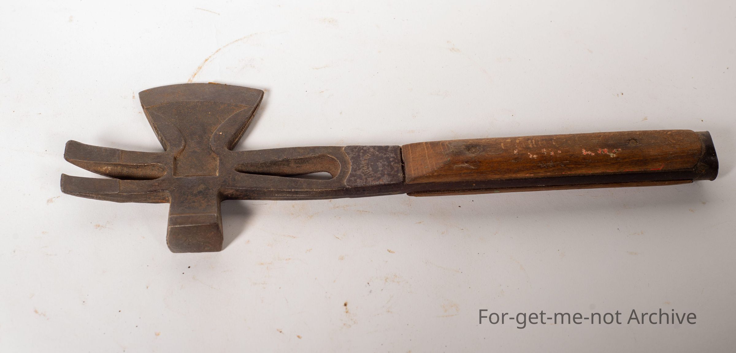 This is a wooden handled, referred to as a box maker's hammer, and axe. It has a hammer, a nail puller, and a blade in excellent condition. I think it's stamped Goodman's. Possibly could have been used for variable trades.Collection