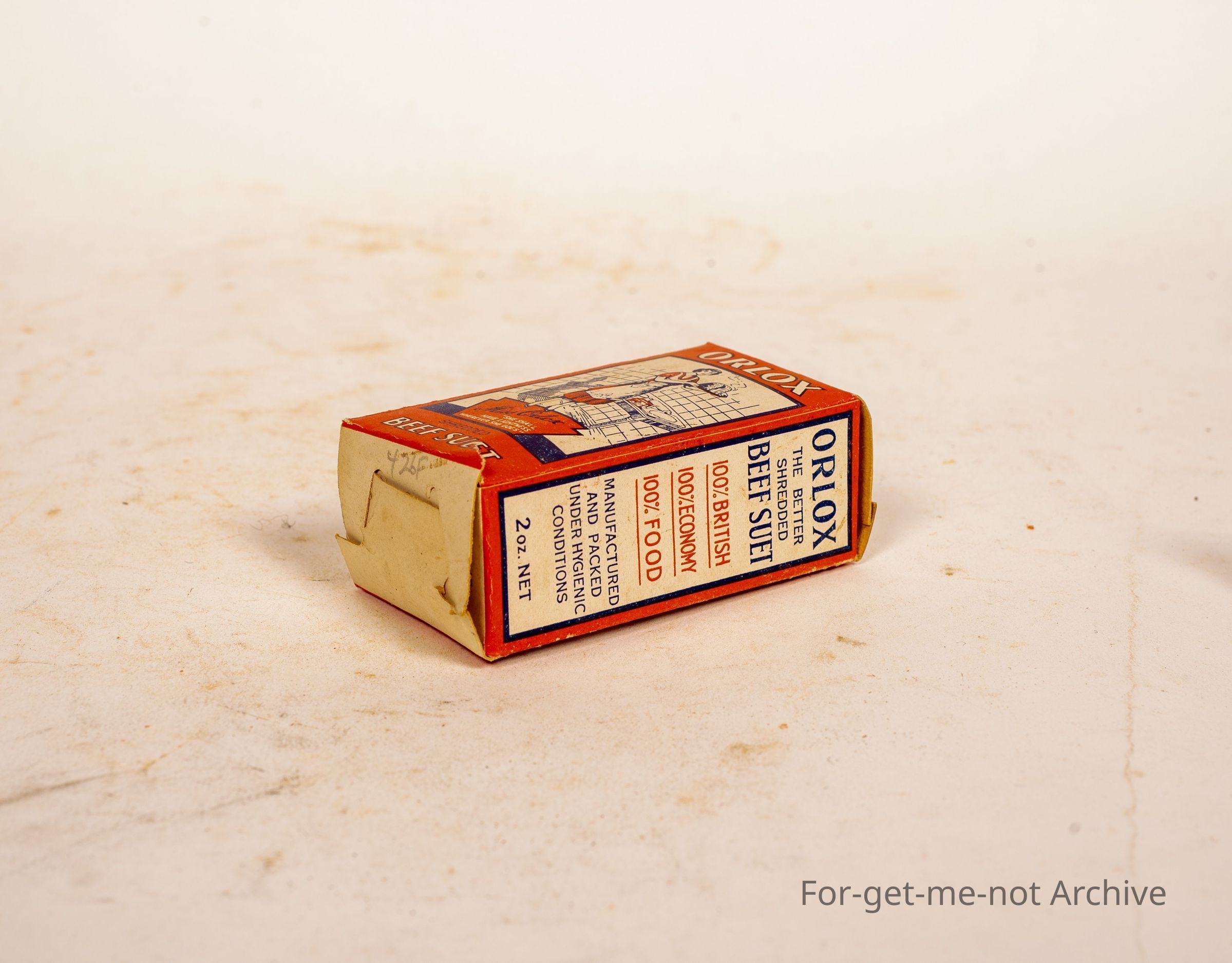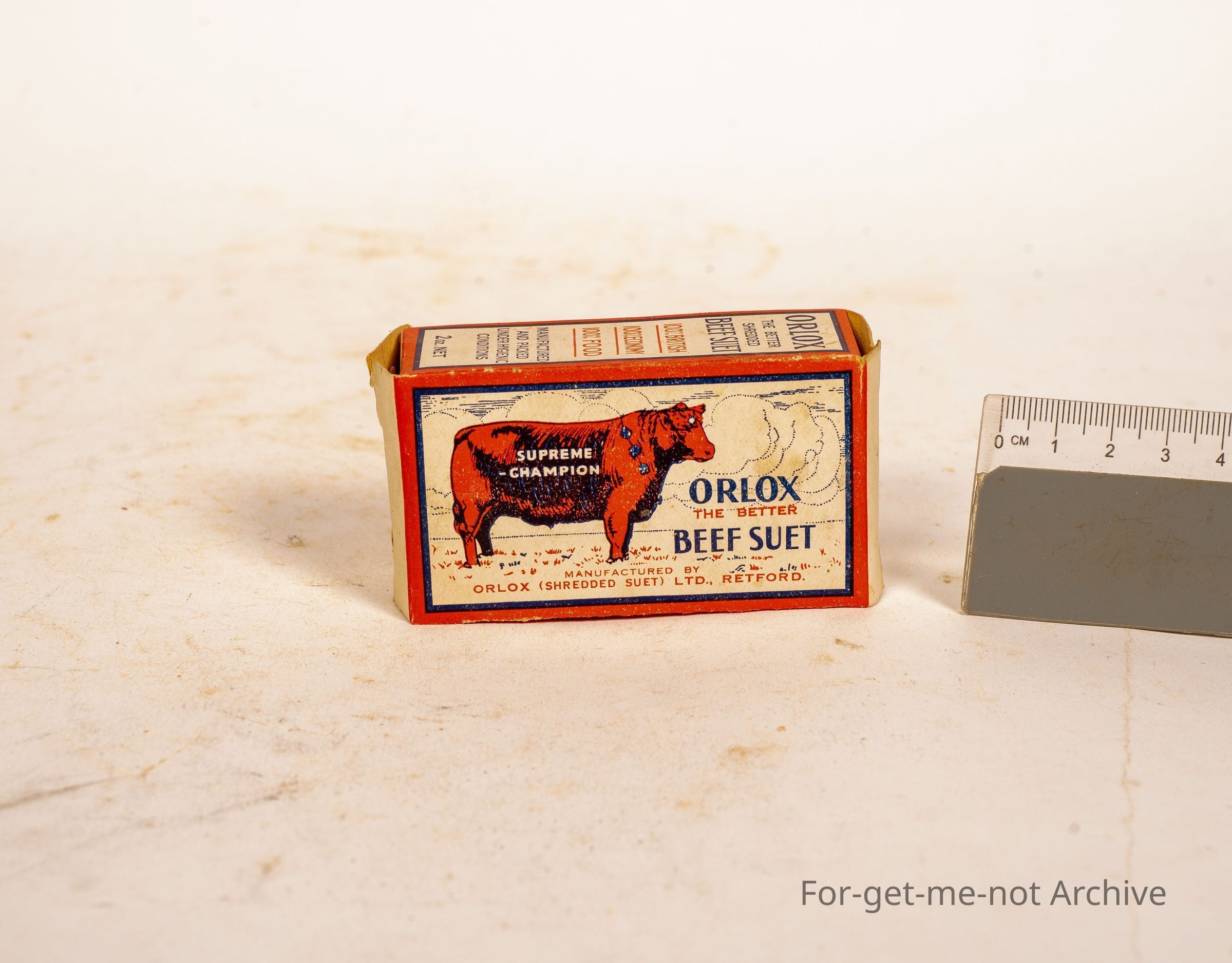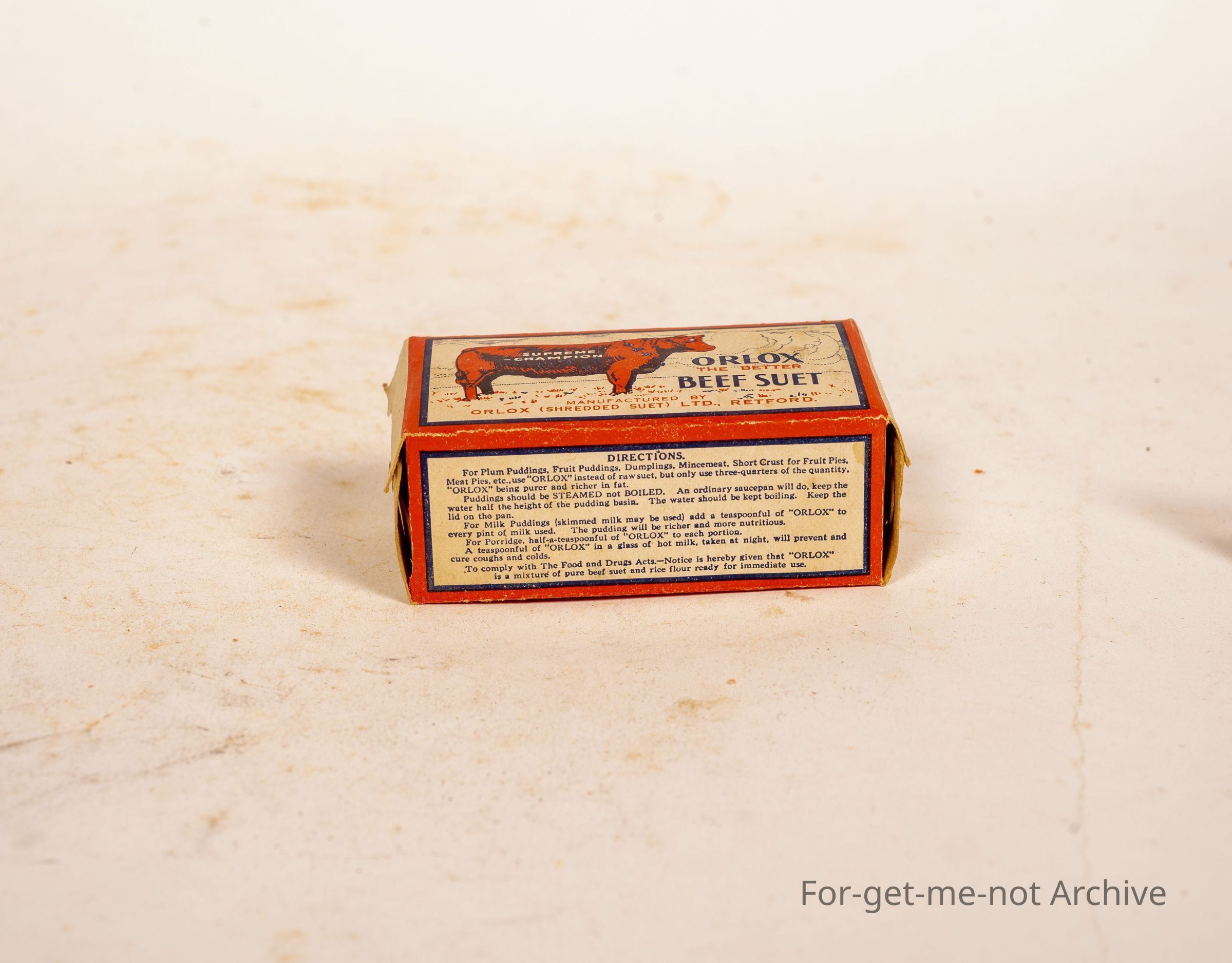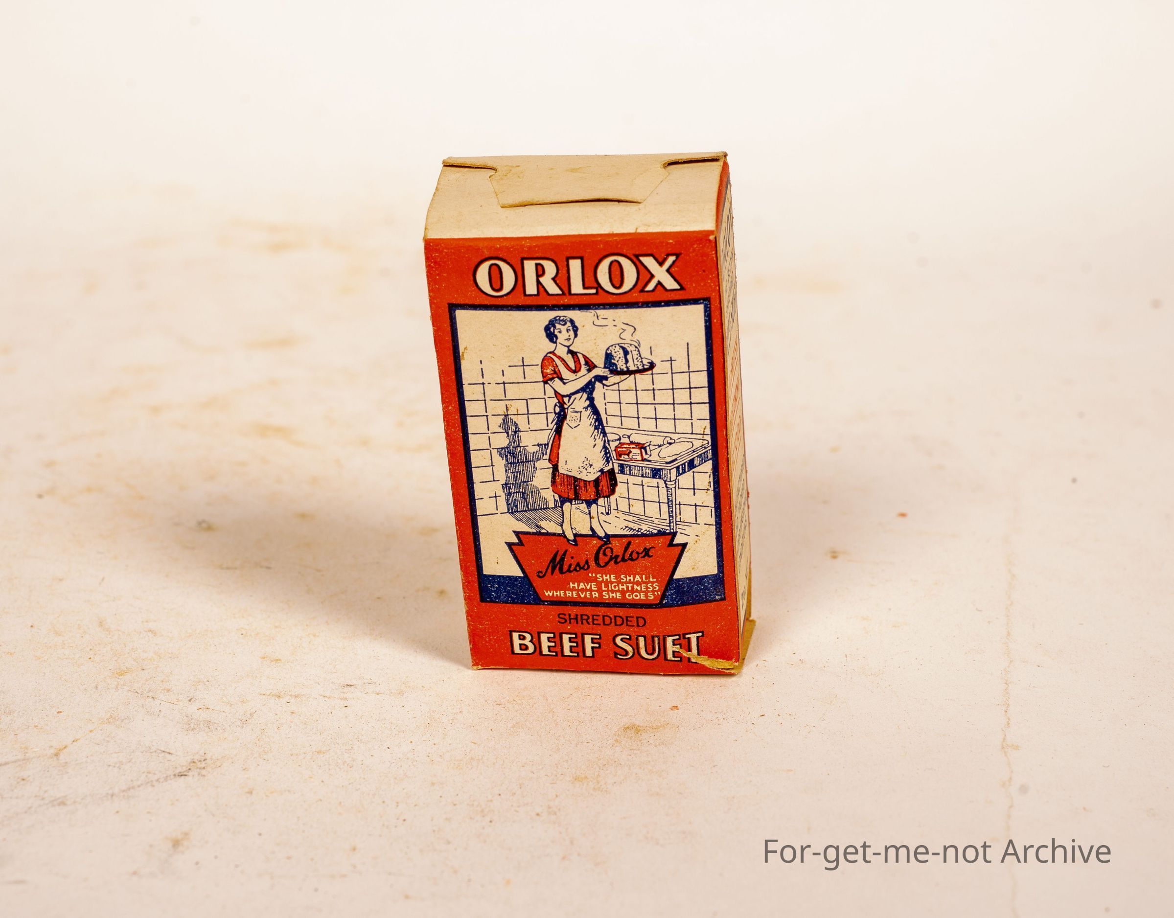 Is a cardboard box of Orlox Beef Suet. Picture of lady cooking in the kitchen. The tin itself is very the box itself is in good condition. Image of a big ox on the back.Collection