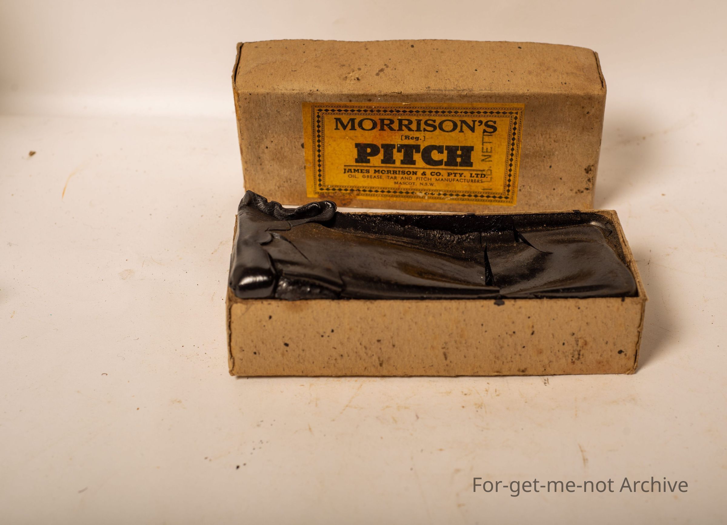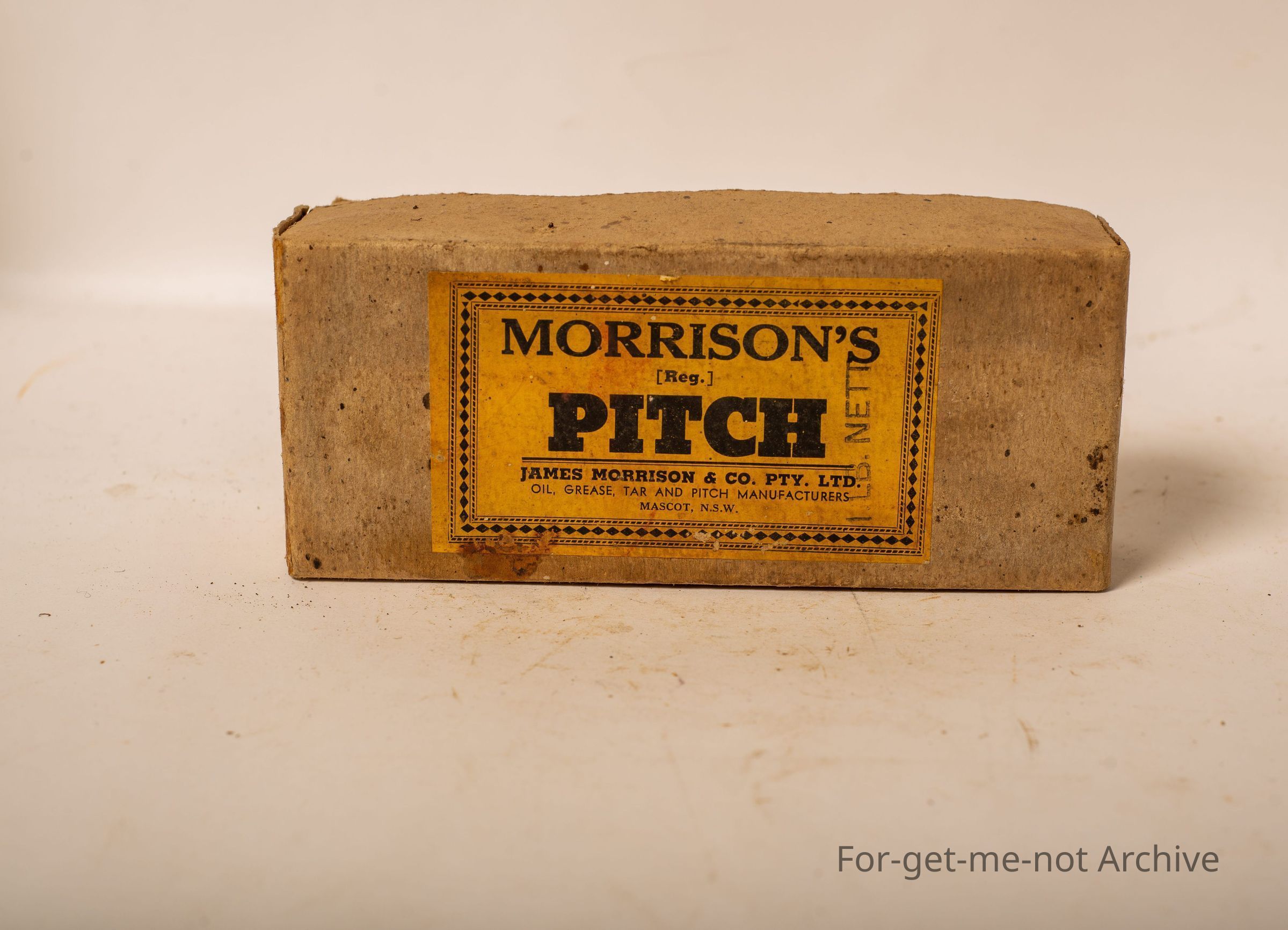Cardboard box of Morrison's pitch. James Morrison, pitch manufacturer's mascot, New South Wales. 1 pound weight with the contents of a block of pitch.
