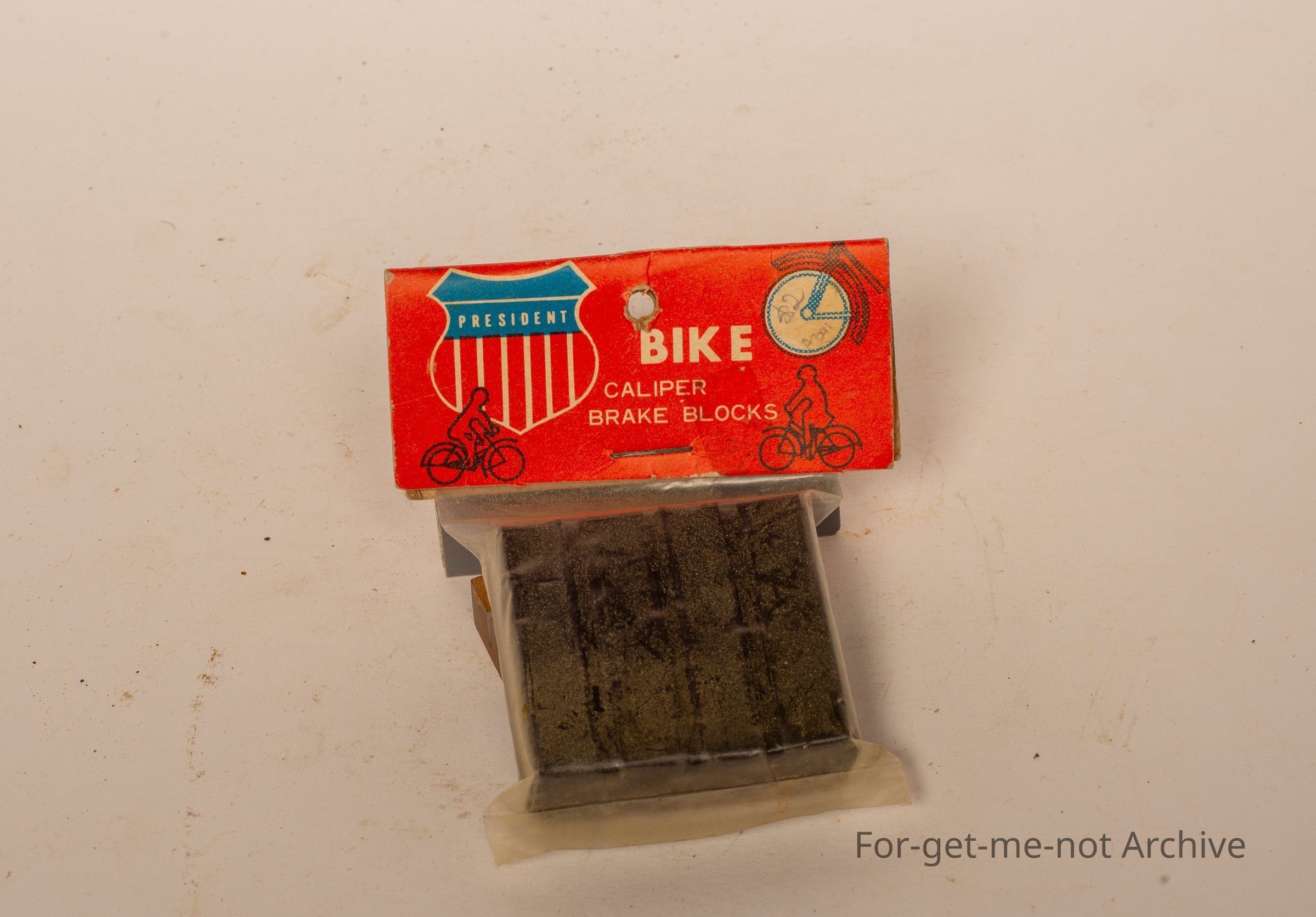 An unopened packet of brake blocks for a push bike. this is from President Company, for Bicycle Calliper Brake Blocks. A full set of blocks in the little bag made in Taiwan.