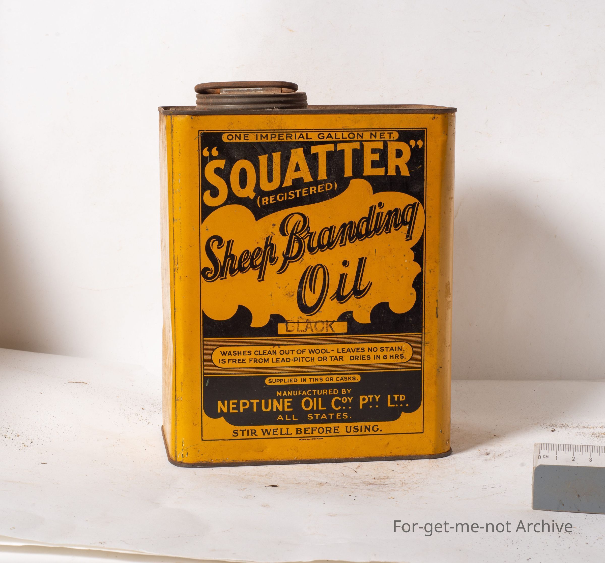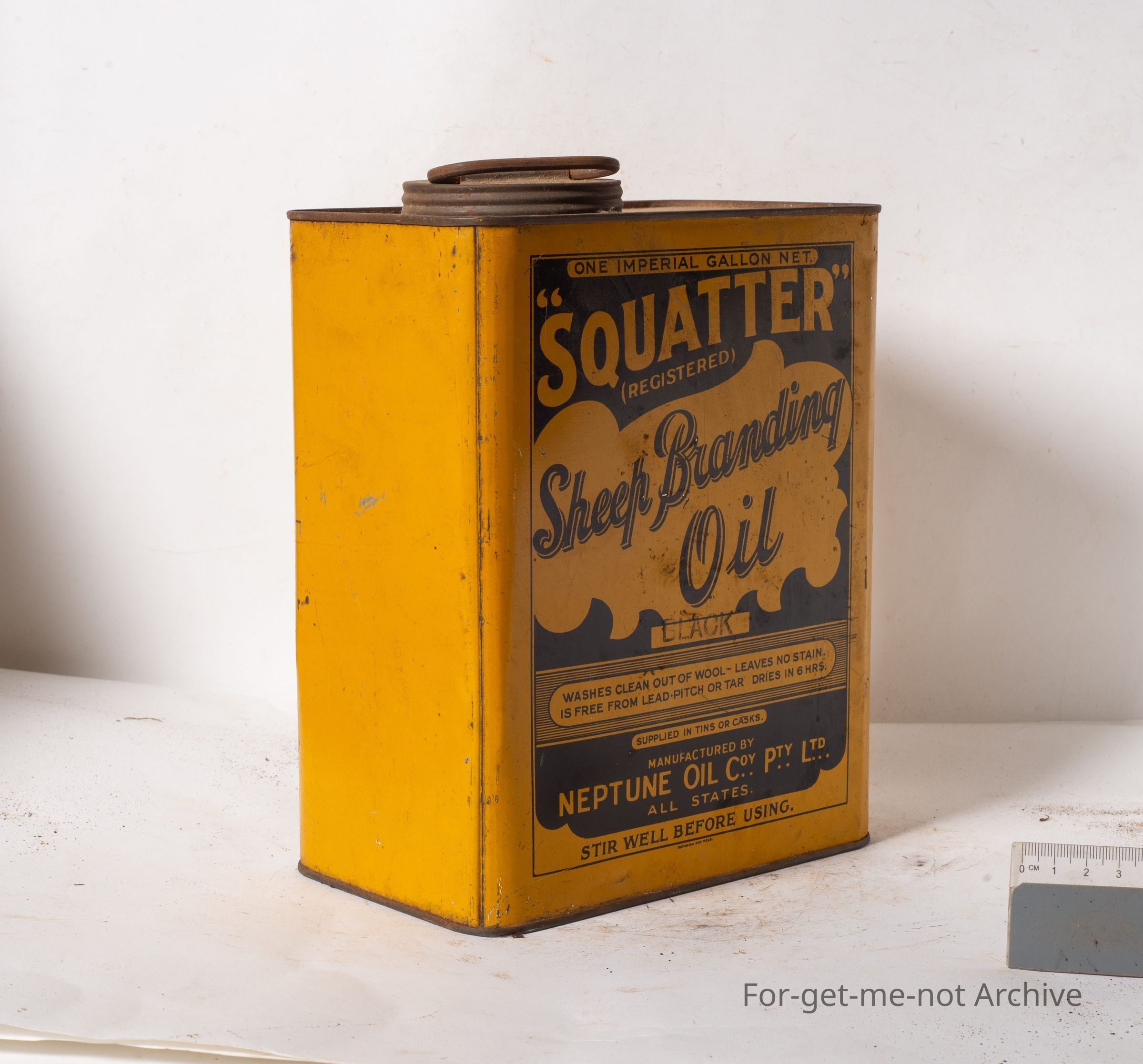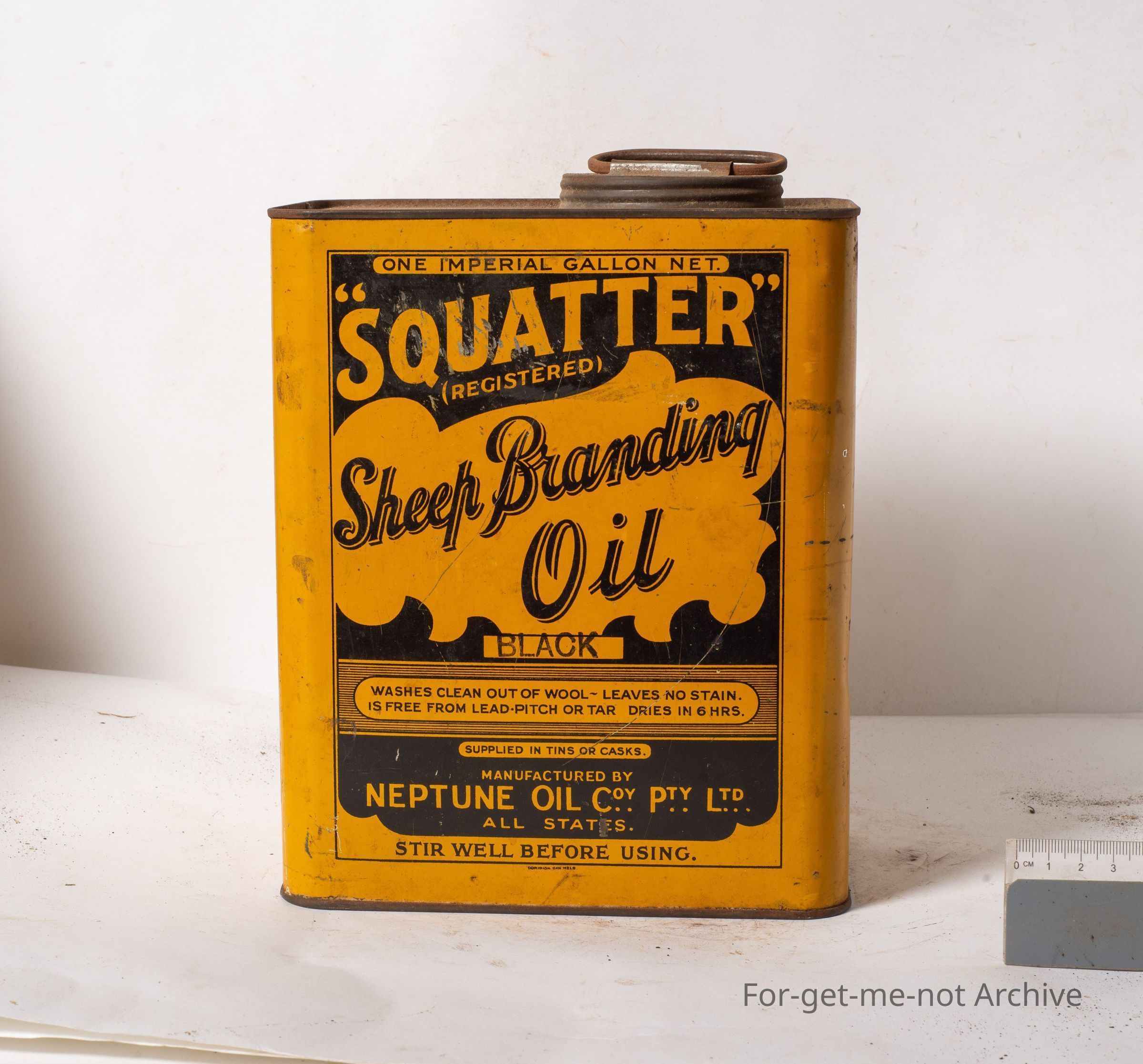 This is a 1 Imperial Gallon Tin of Squatter Sheep Branding Oil, Black, made by the Neptune Oil Company. This tin is in remarkable order, all around. Still has the contents. Never been opened.Collection