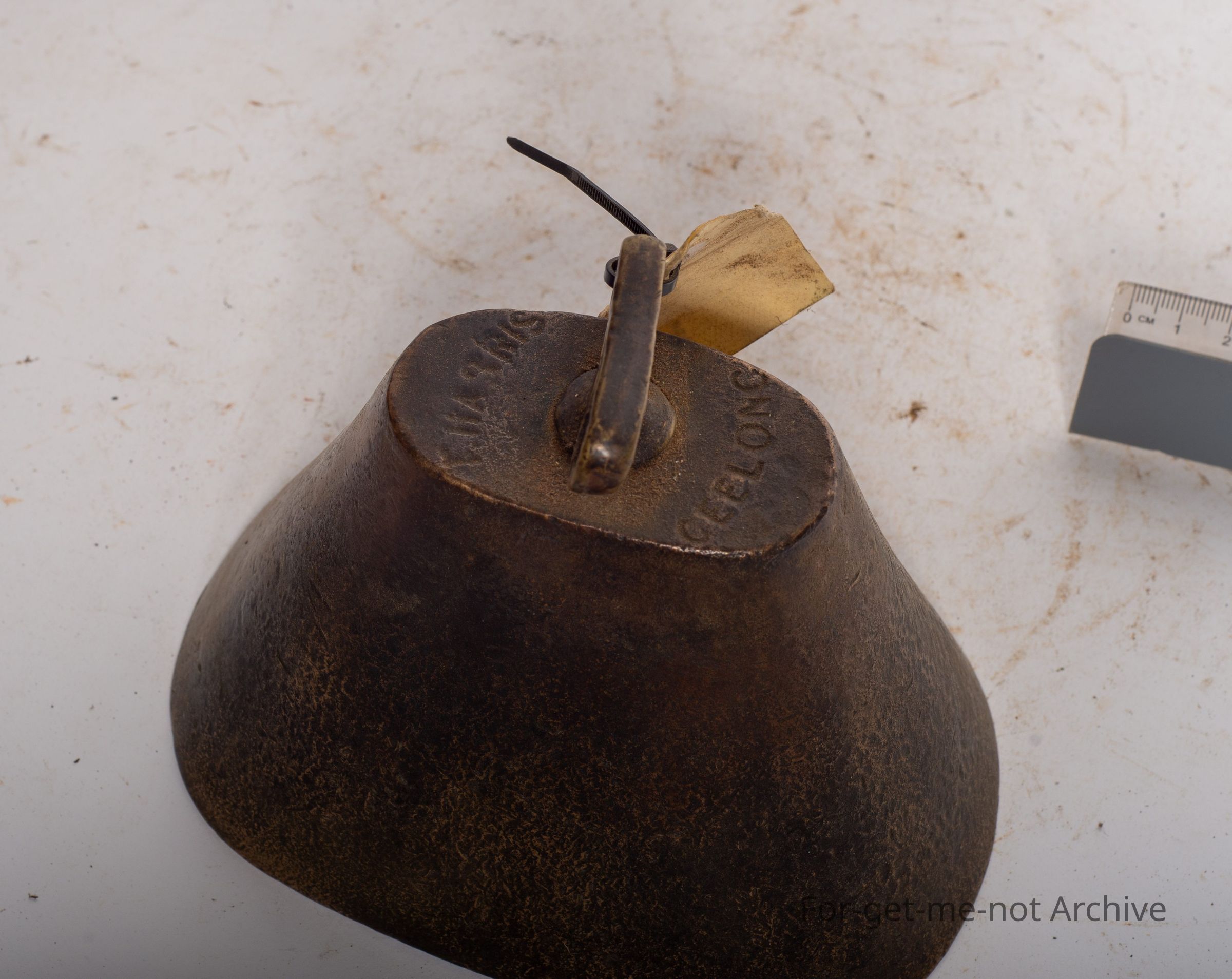 This is a cast brass bell from Geelong in Victoria. The name t Harris is embossed in the top. Harris was a coal and timber merchant from Geelong. The founder is unknown but a very unusual shape. This spell comes in a series of 3 with 3 different advertising names in the top. All extremely hard to find.Collection