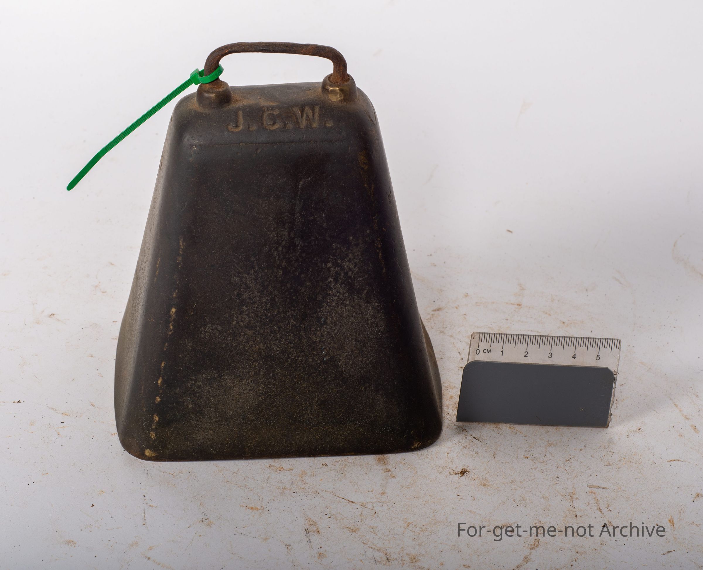 This one, embossed with JCW. This stood for John C Wilson, from Whitechapel. He was a bell founder who made or did the casting of bells for other people other than himself, so there are a lot of these bells in a similar pattern but not with his name. This is quite a he made a series of bells in different sizes. This is the largest one.Collection