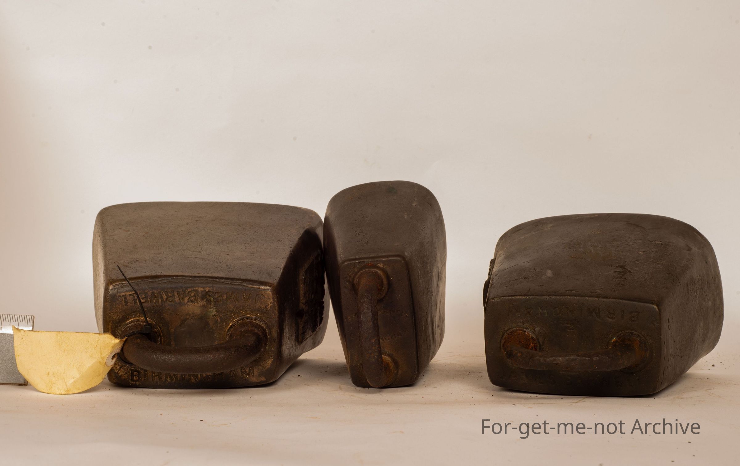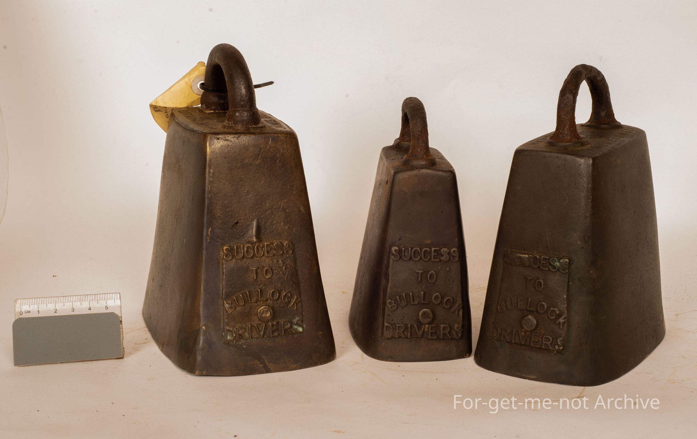 These are 3 cast brass bullock bells cast by James Barwell Birmingham. These are known as plucked bells, with the plaque referring to success to bullock teams.