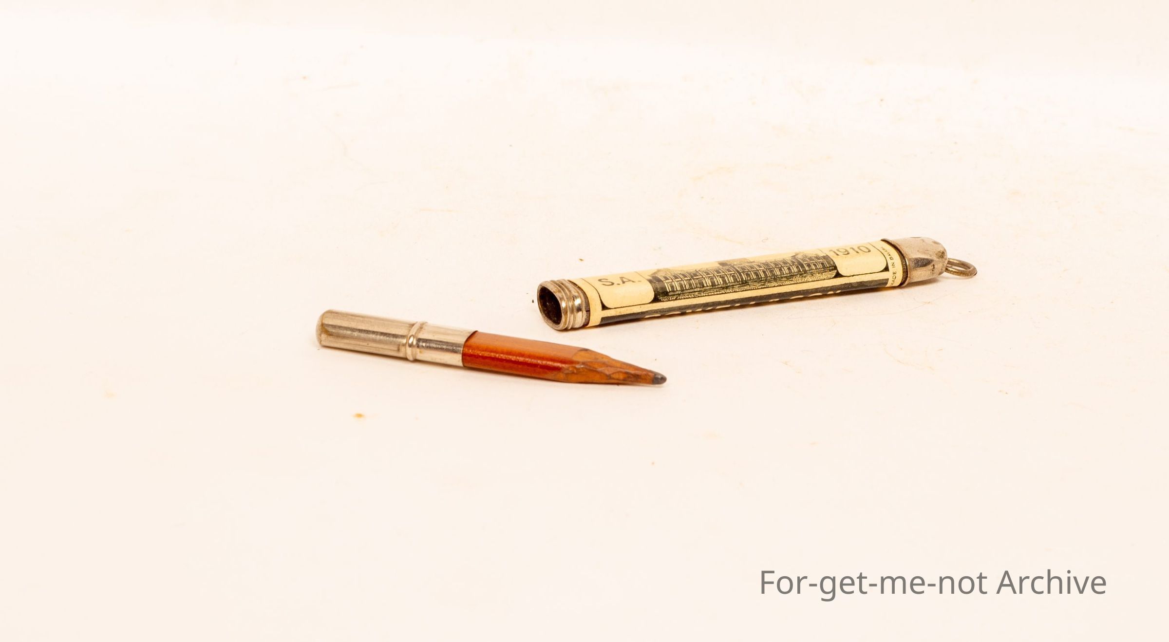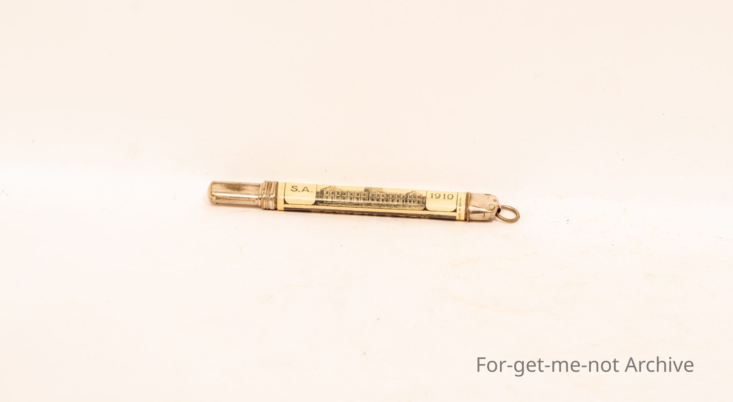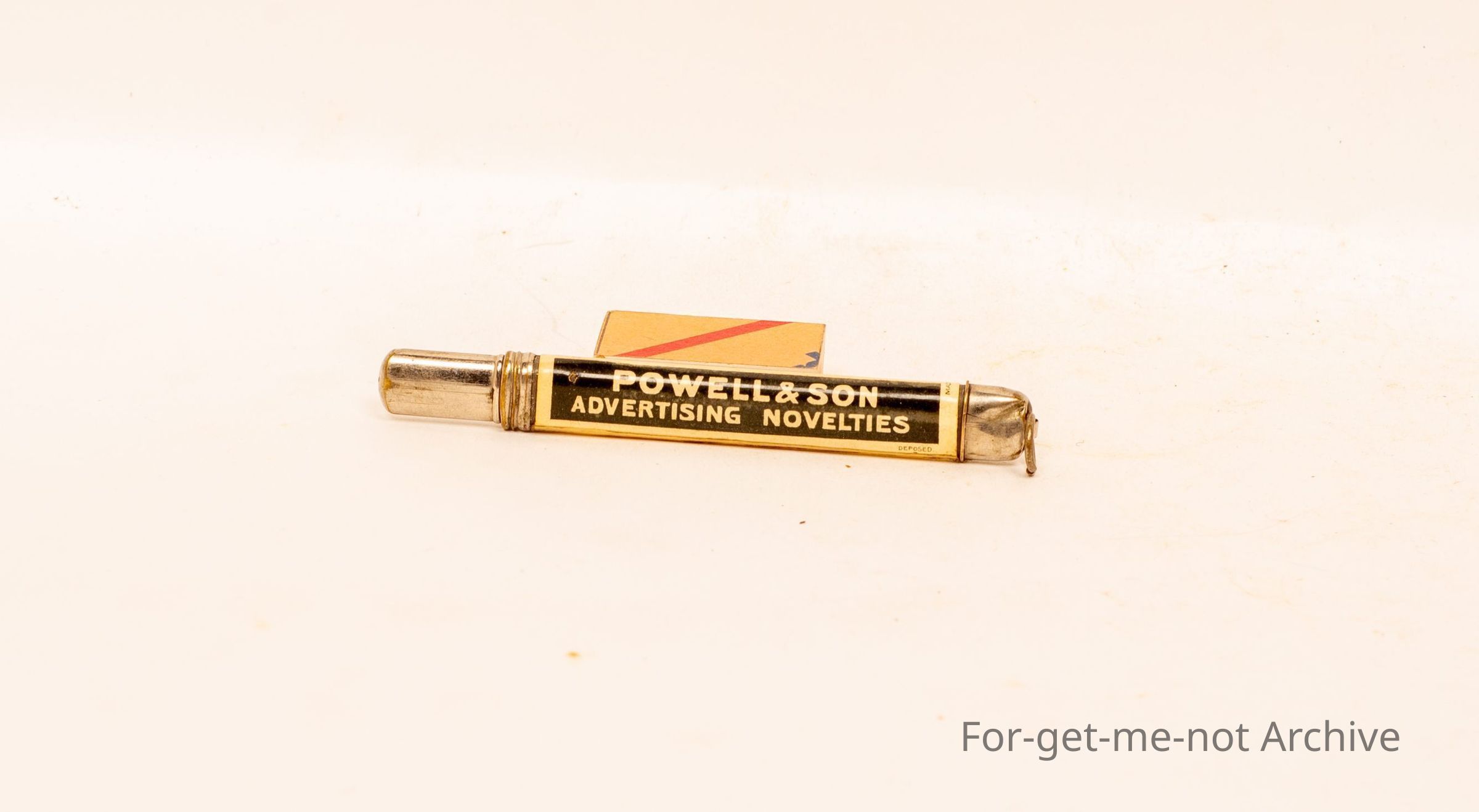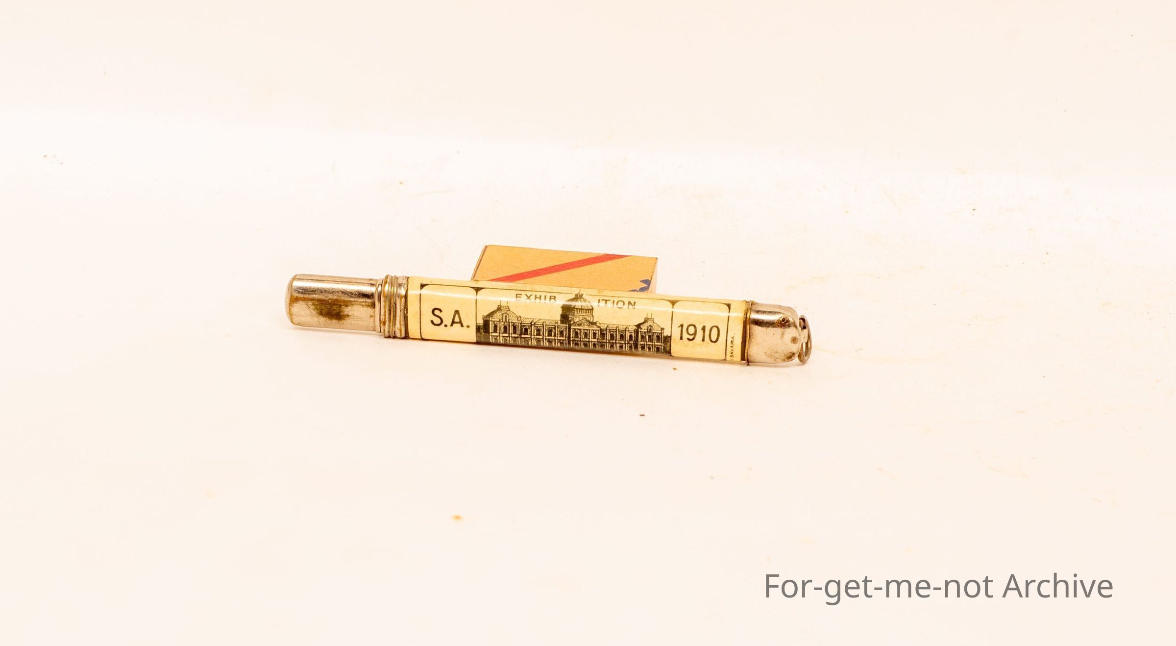 Small, brass holder of a ladies manicure set in the shape of a pen