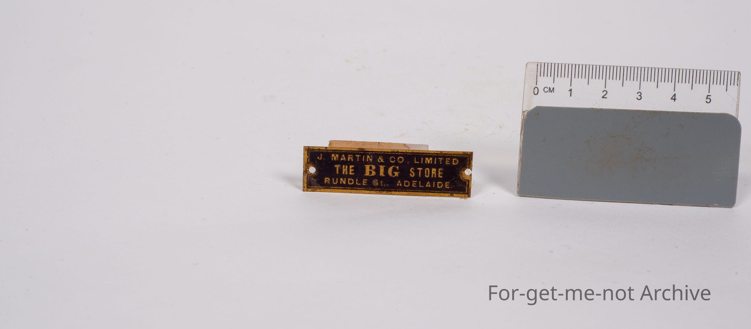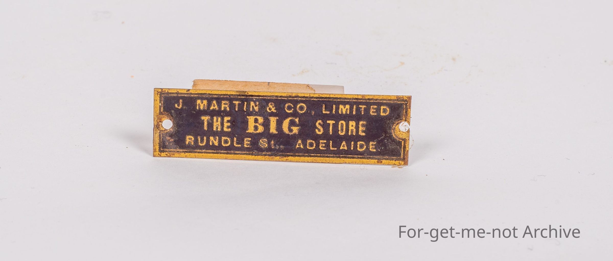 An interesting, but very small brass plaque from J Martin and Co, the big store, Rundle Street, Adelaide. A beautiful little piece of advertising from a very well known Adelaide, store.Collection