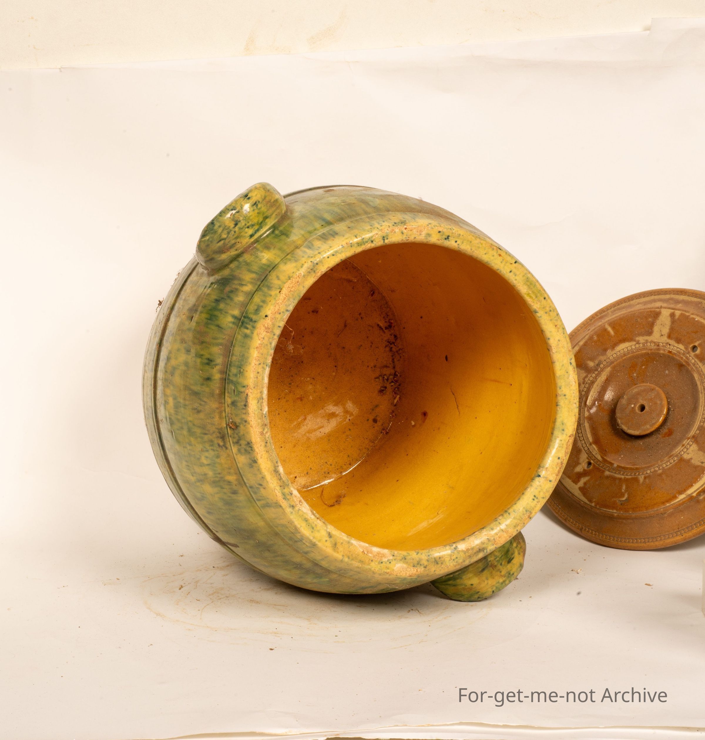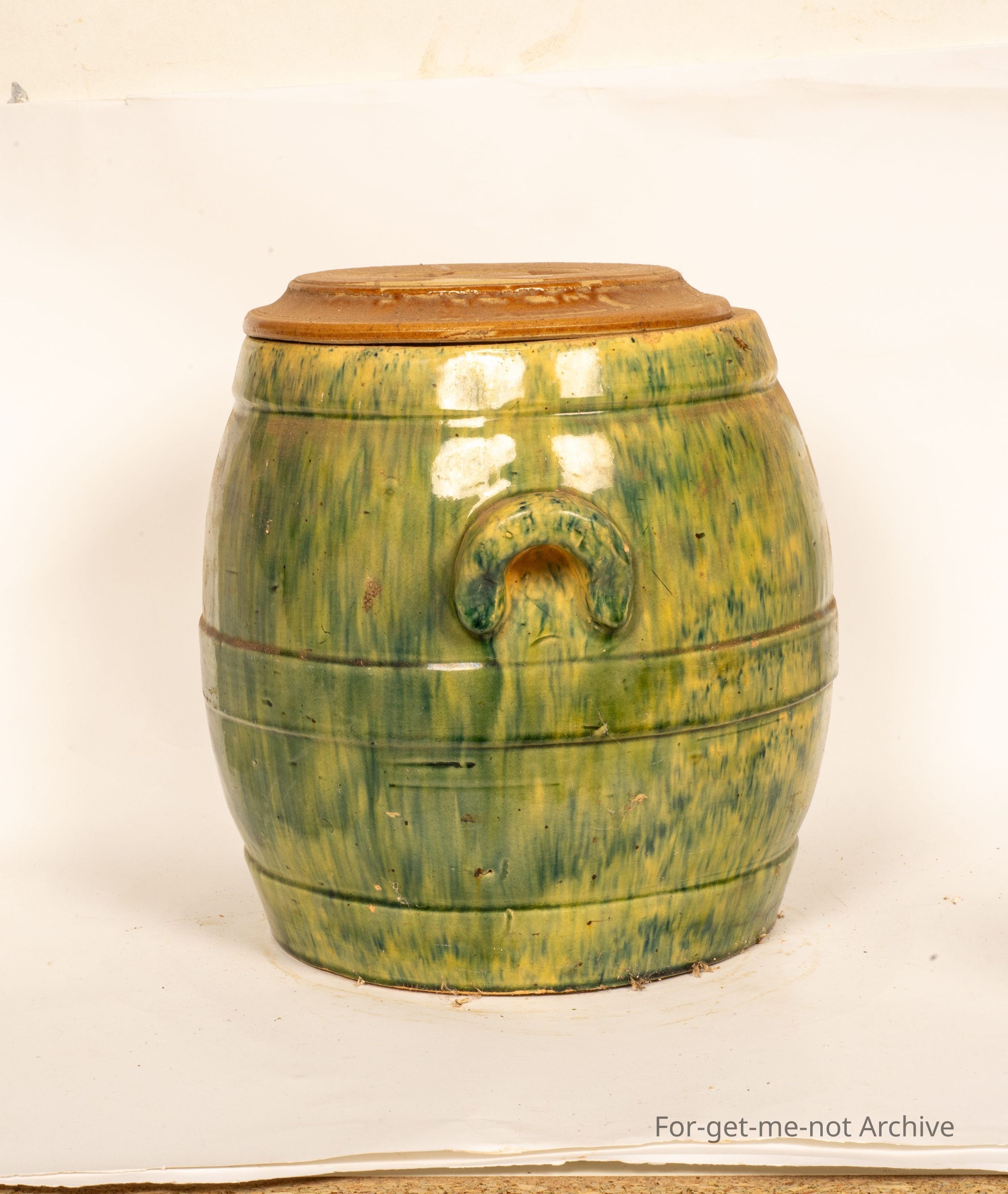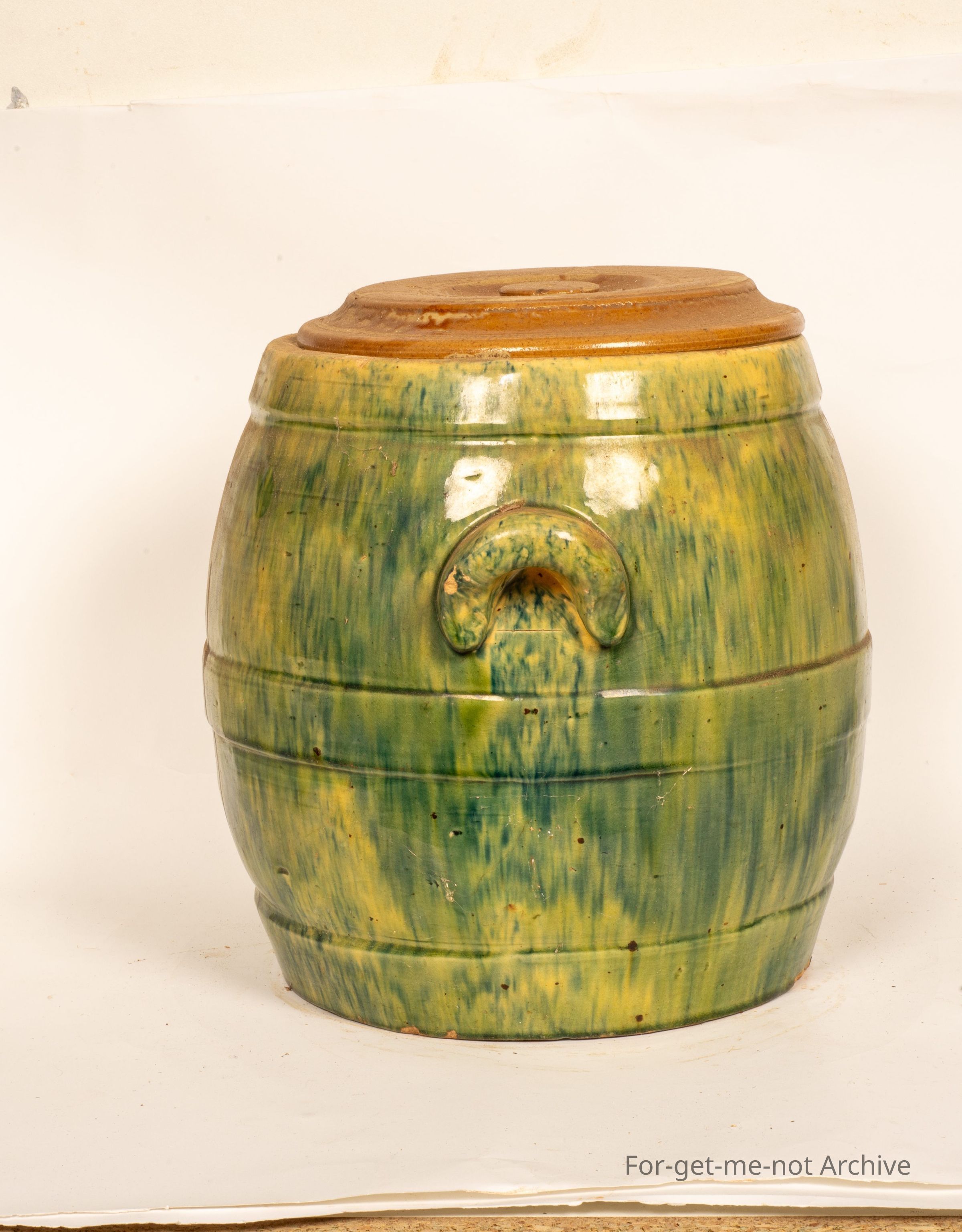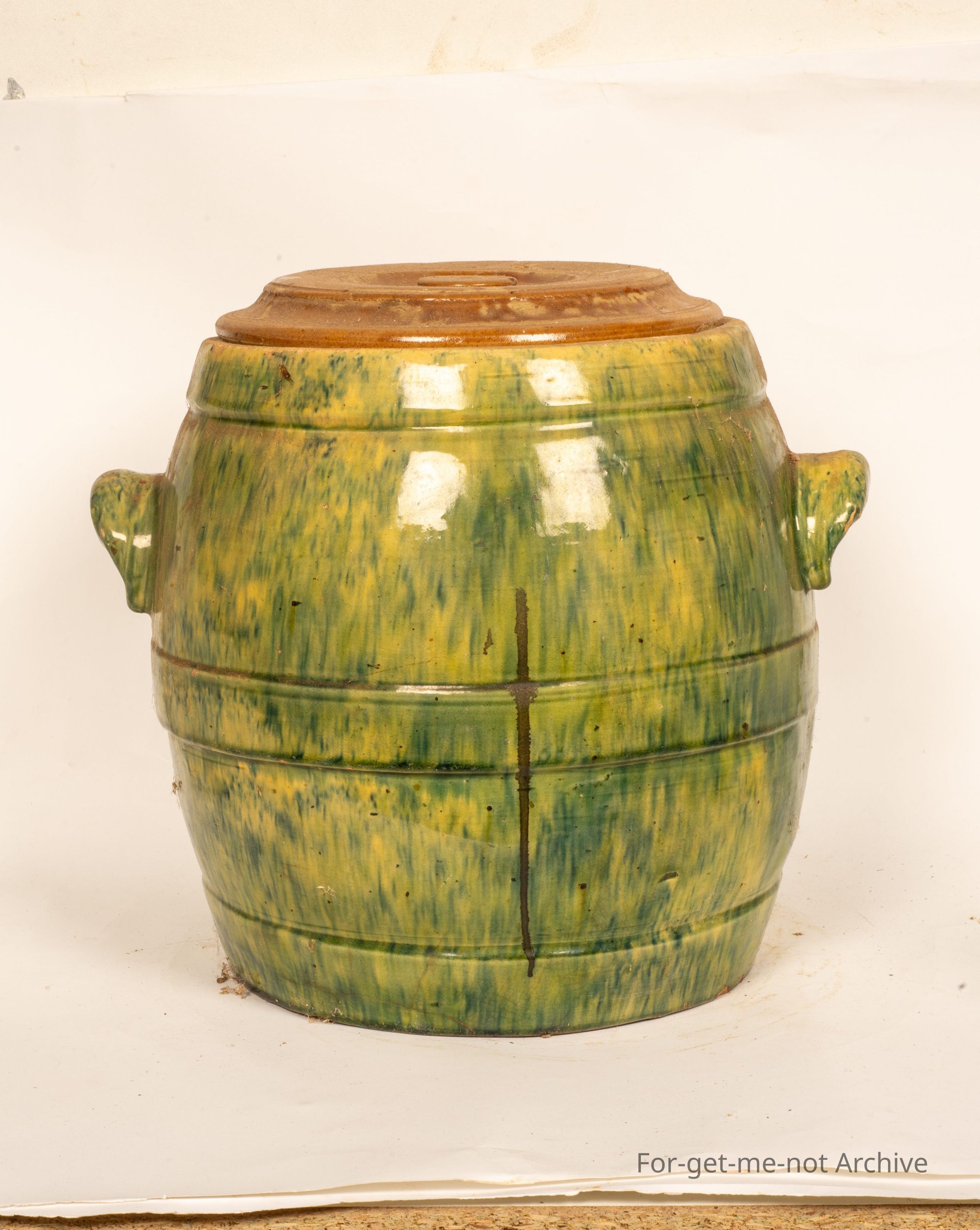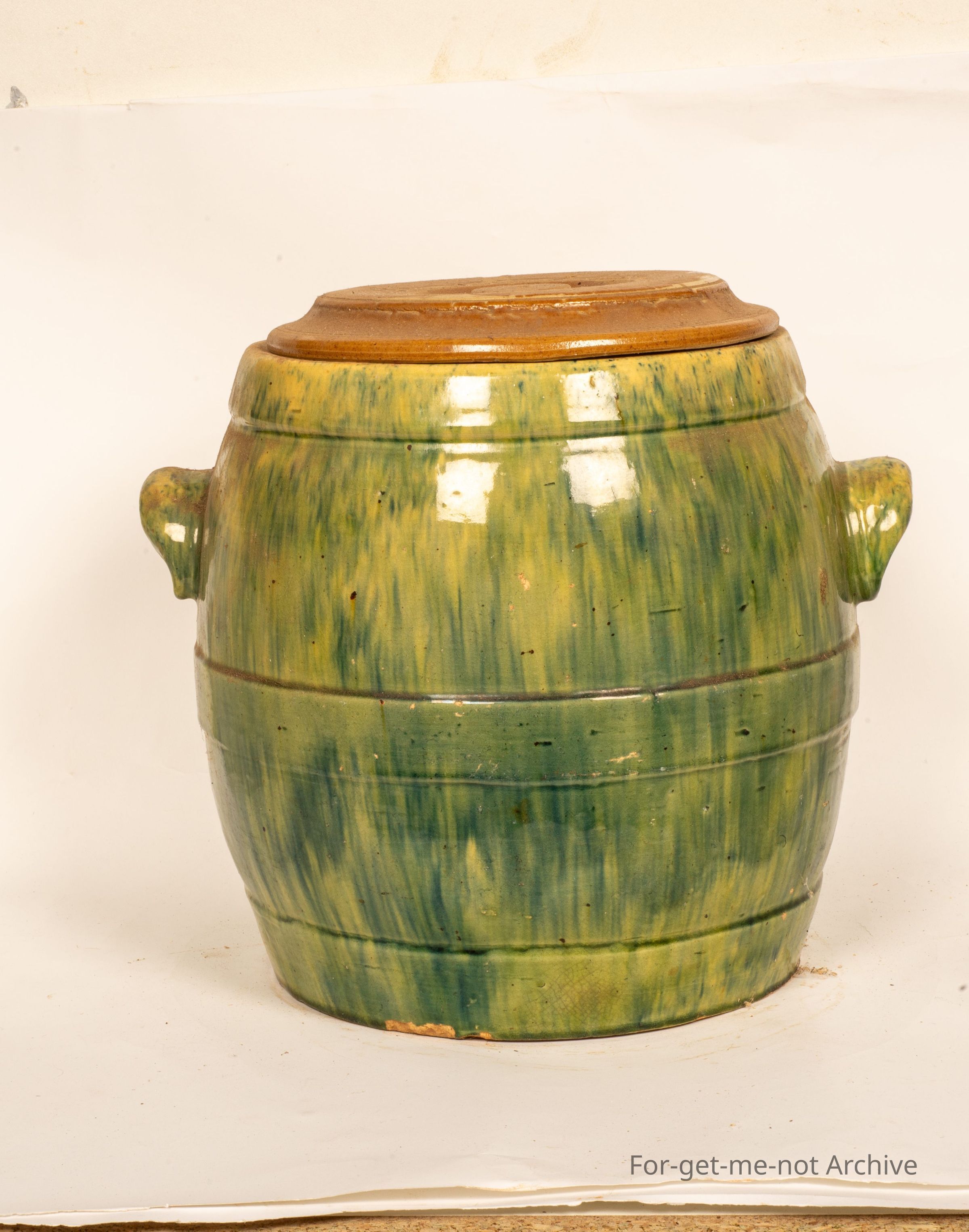 stoneware, bread crock, believe this is, Bendigo pottery in a nice, green and cream majolica type glaze. Non original lid. Condition wise, the handles, no great deal of chips, really in very good condition.Collection