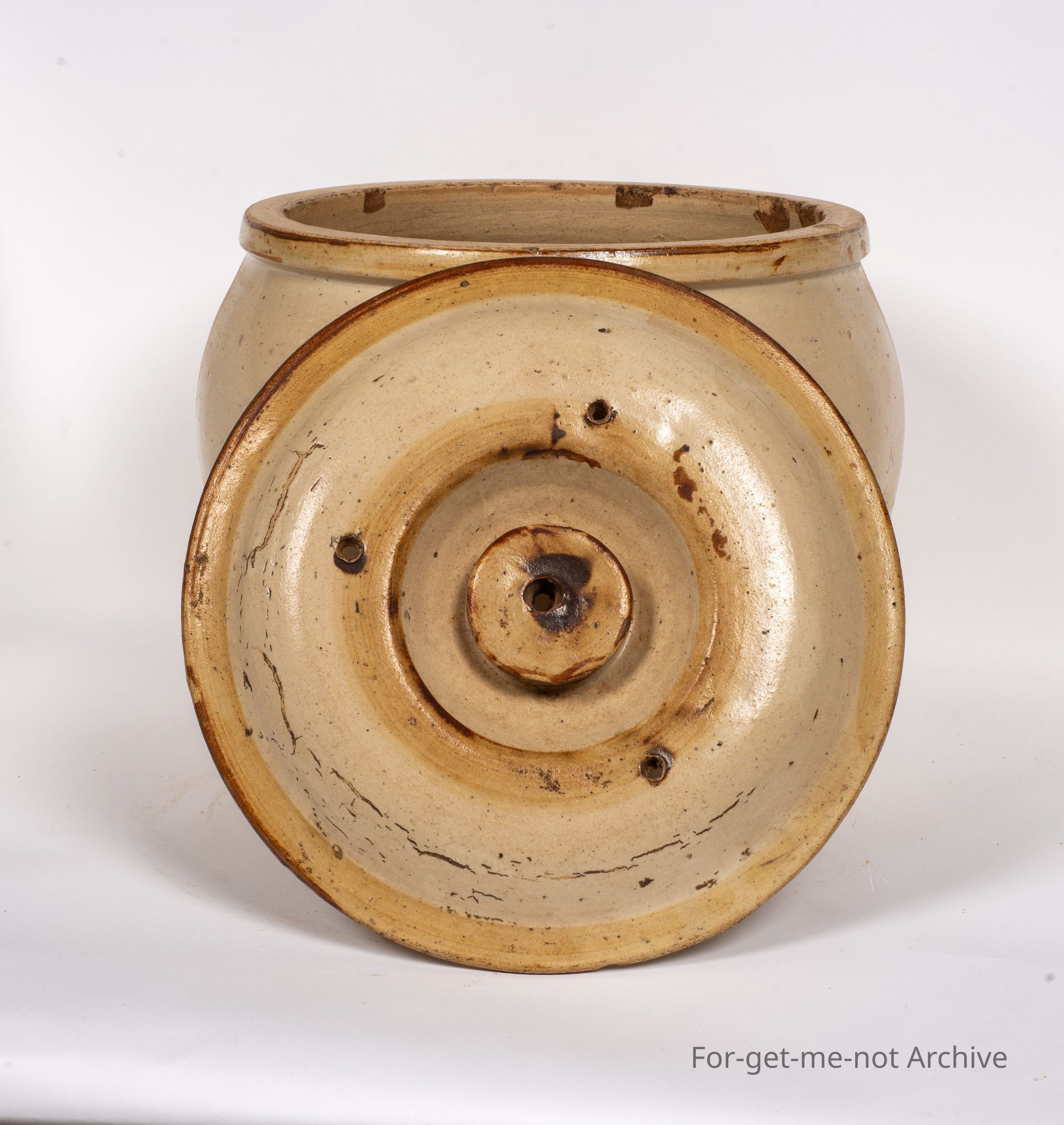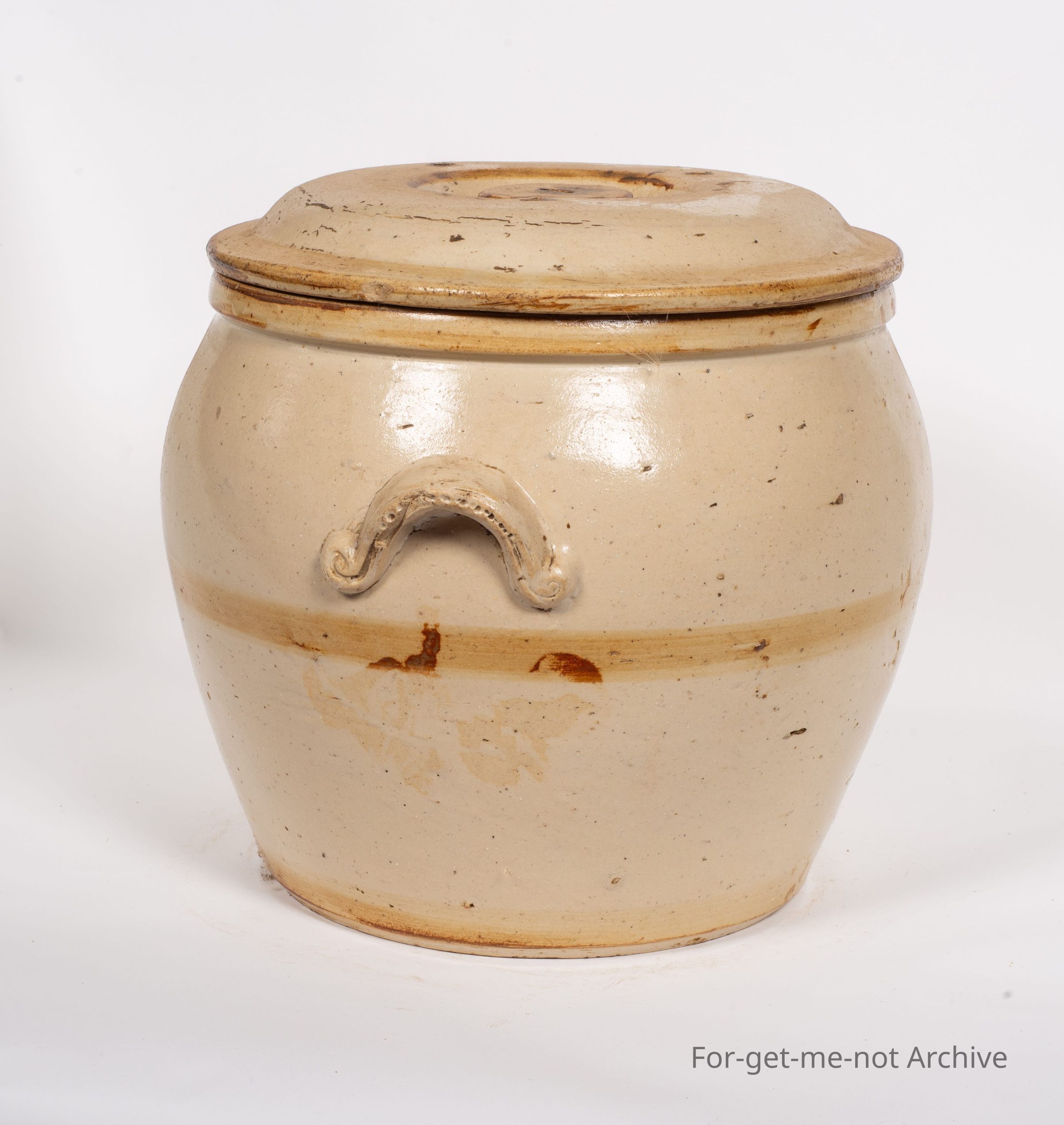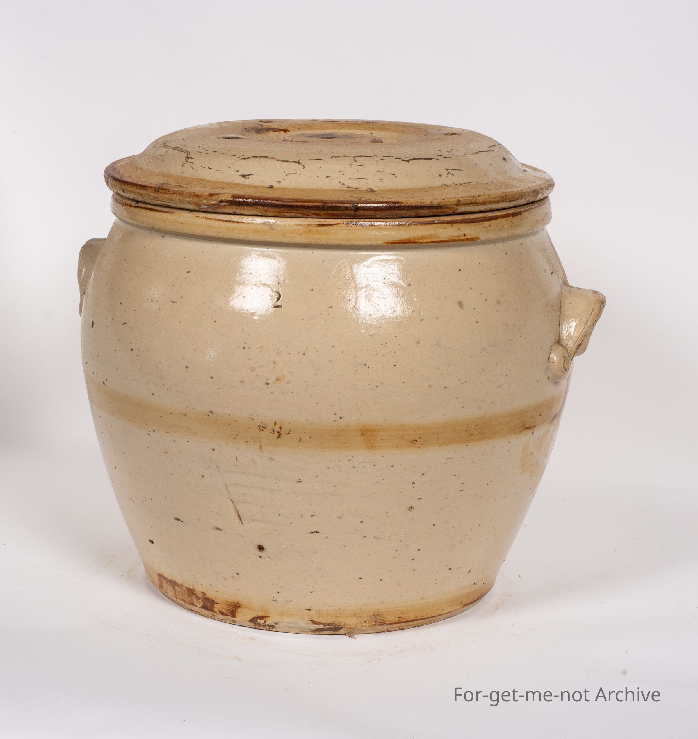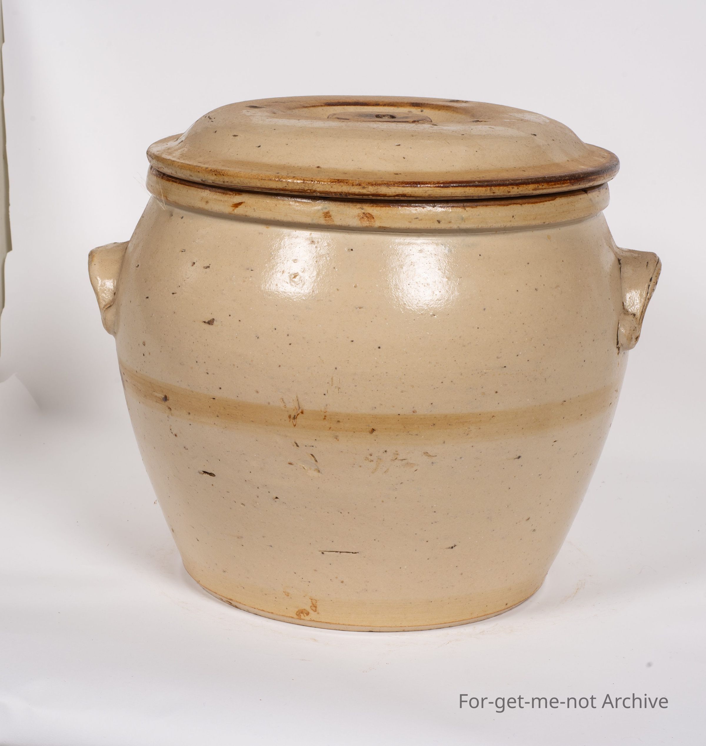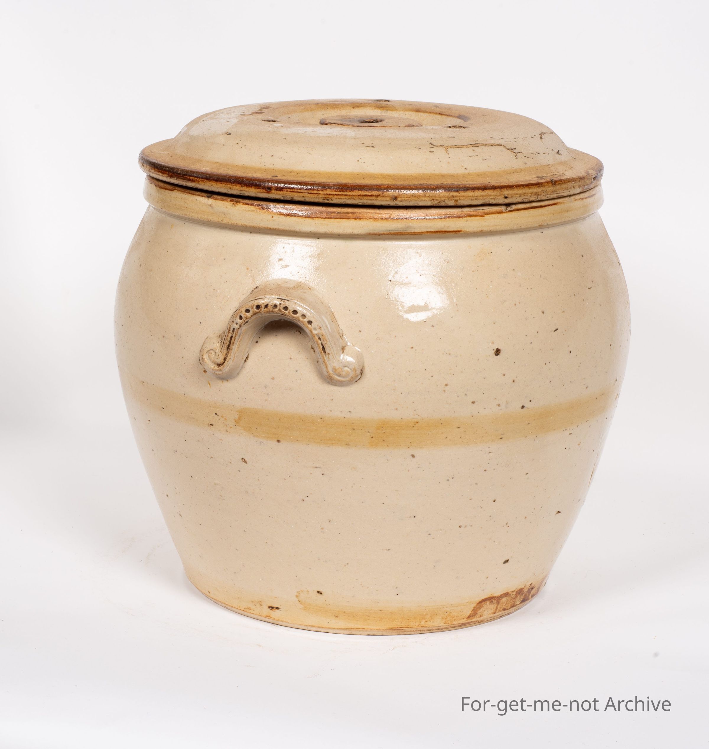 Stoneware section. This is a bread crock with original lid made by Cornwall Brunswick Pottery in Melbourne. This has been banded with a darker glaze which has faded from the lid and the side. It has the distinctive Cornwall handles with dimples in them. A nice piece in good condition.Collection