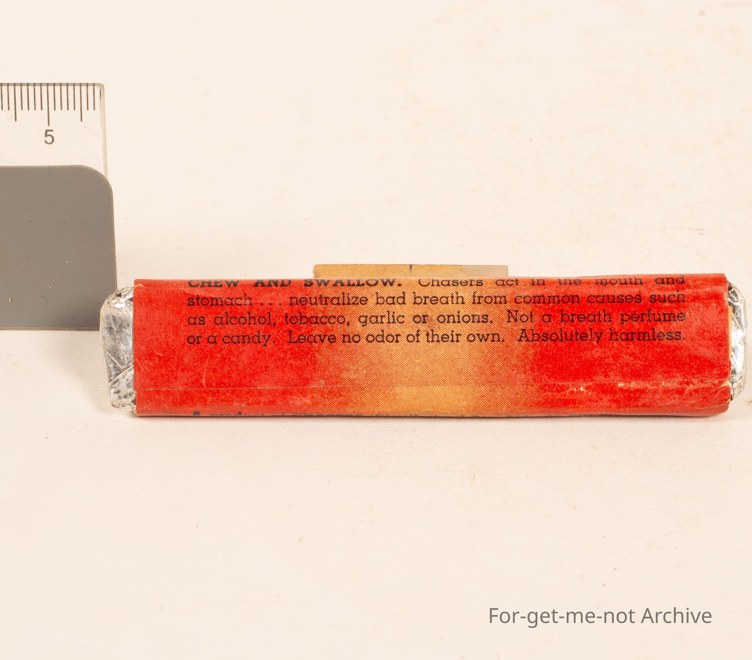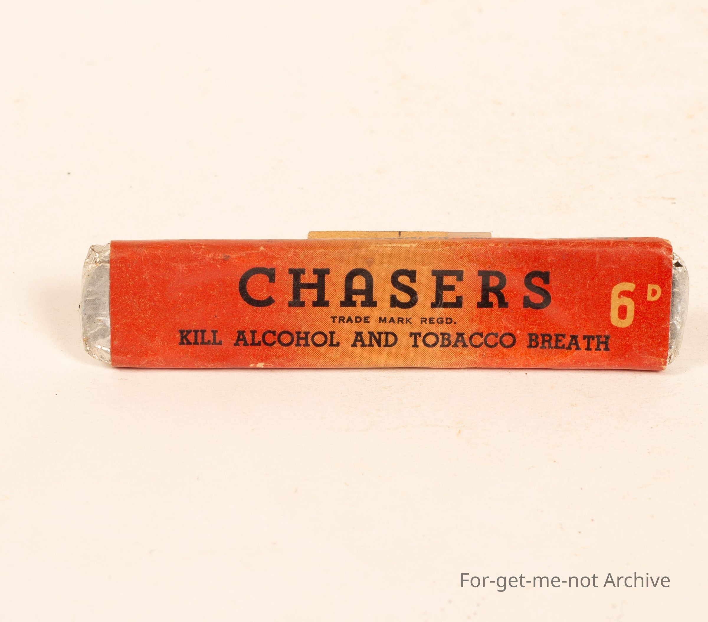 A foil wrapped, piece of chewing Gum? called "Chasers, kill alcohol and Tobacco Breath", 6pence. To freshen up your breath when it stinks with tobacco.
