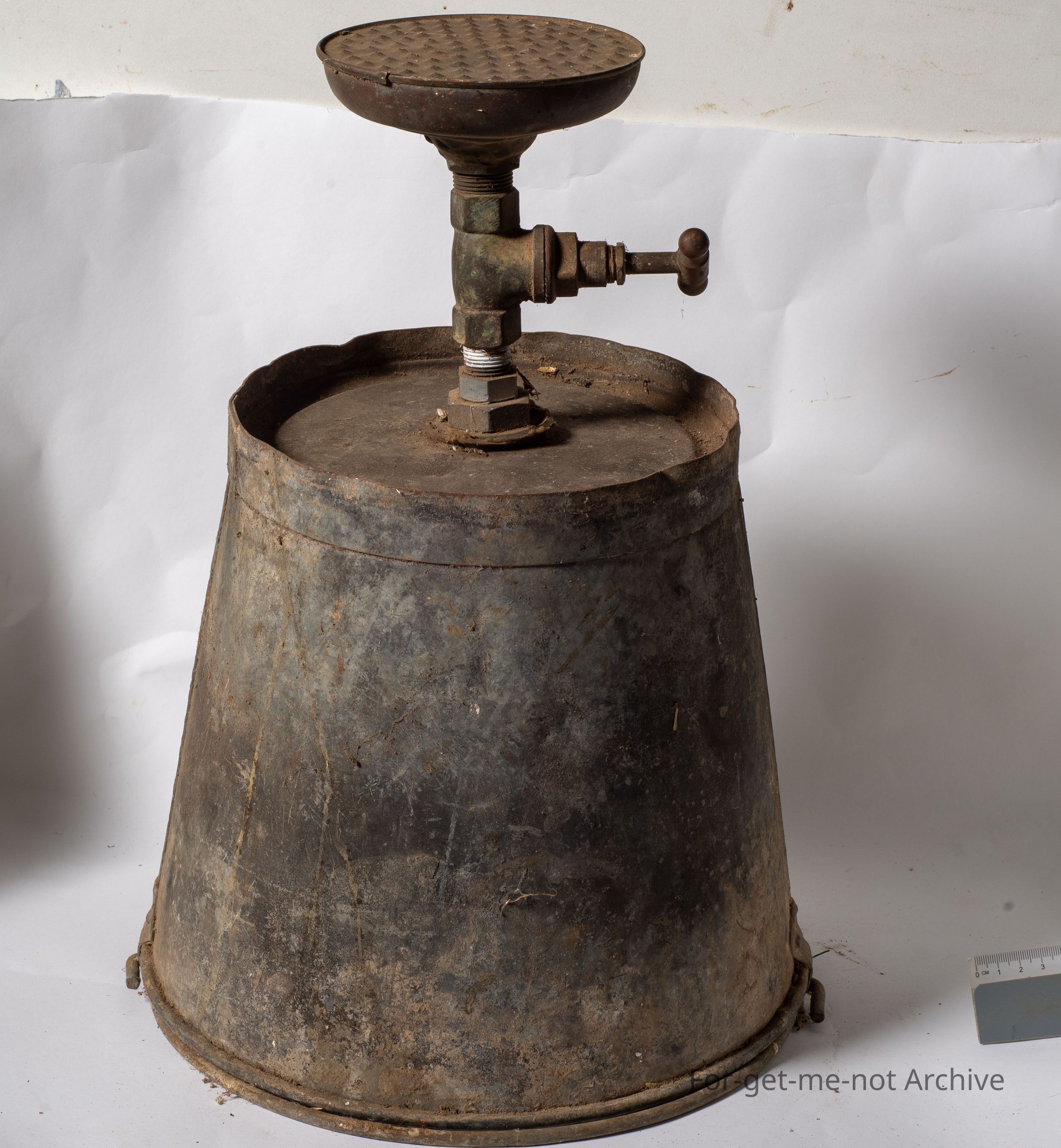 this is a tin bucket with a handle. It is a shower rose fitted on the bottom with a tap. This would have hung under a tree or somewhere filled with water to give the user a quick shower out in the bush.Collection