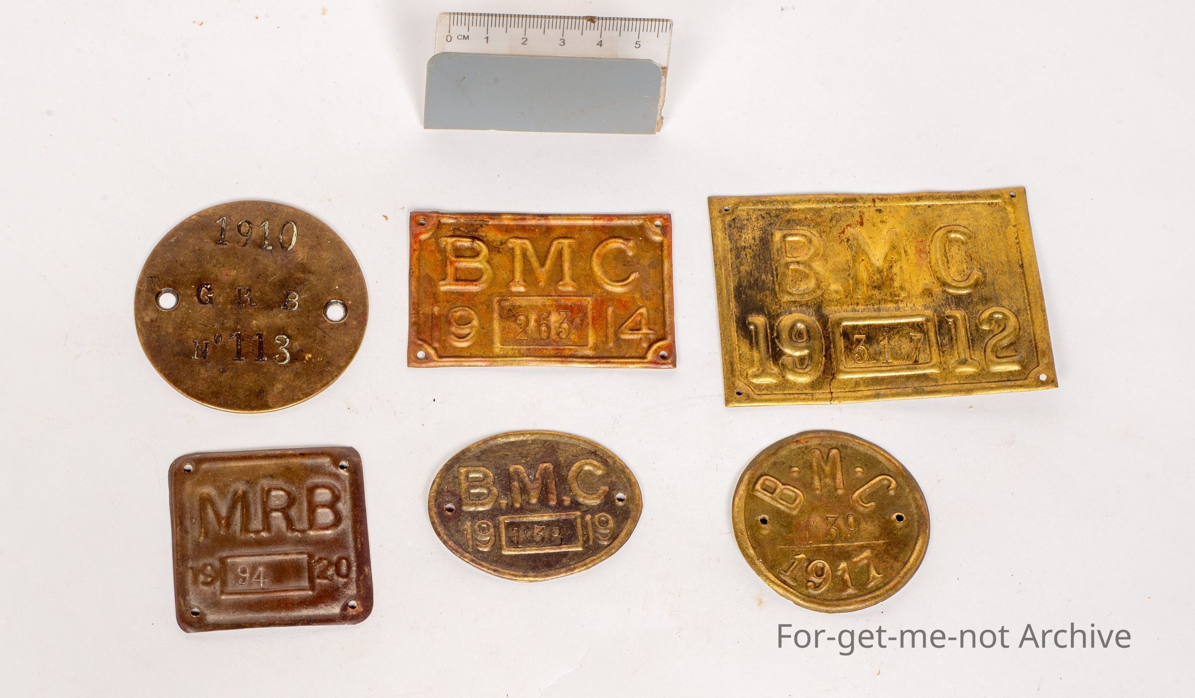 This is a group of, brass registration plates from Western Australia for horse drawn wagons. Different shapes, different sizes, all from roughly not long after the turn of the century, 1910, 1912, 1914. Once again, very hard to get,Collection