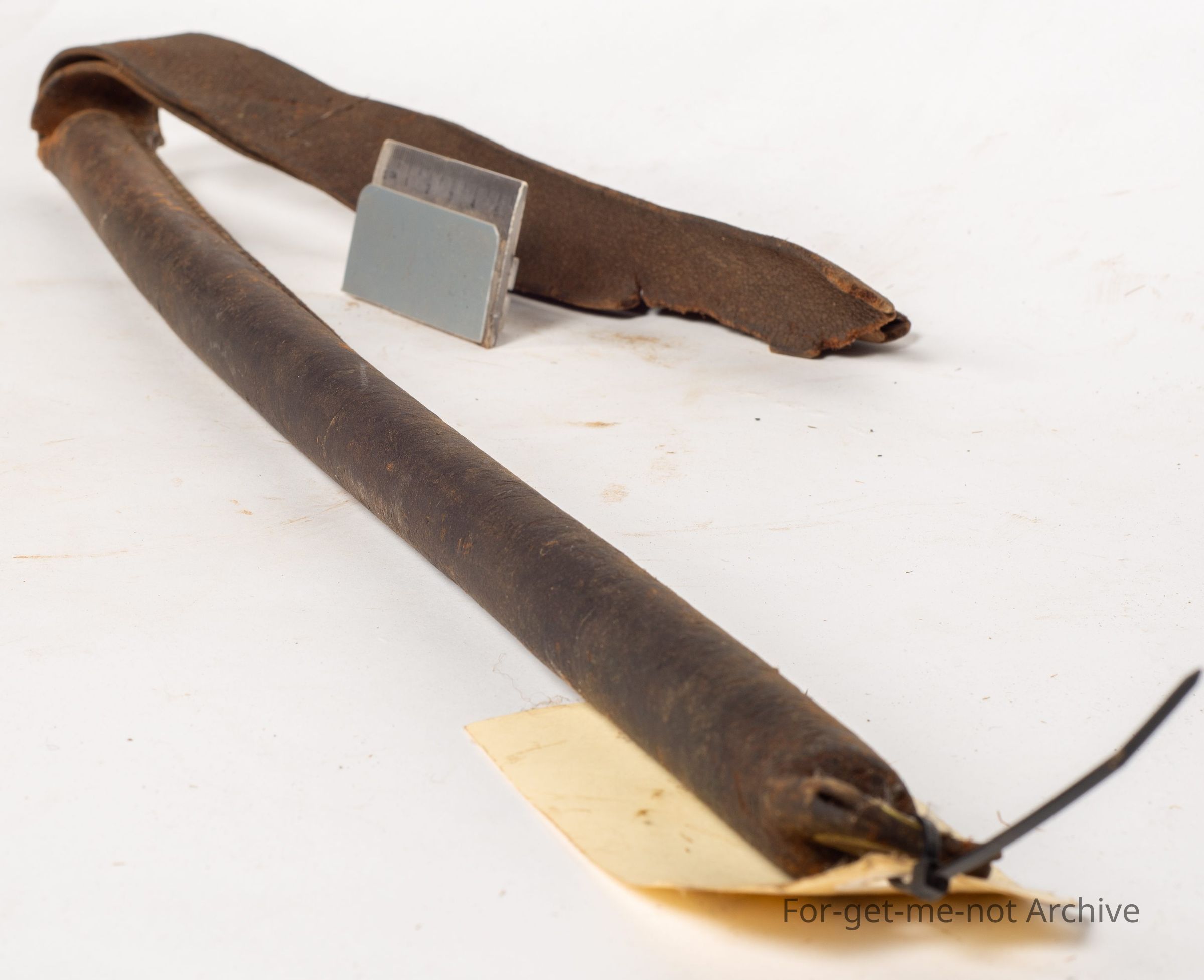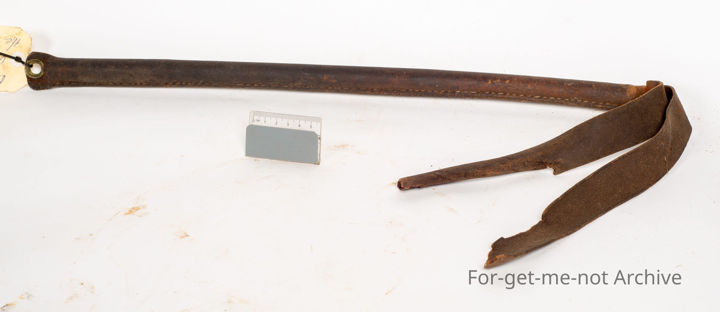This is referred to as a bullocky's flapper. This is a short handled whip with heavy strands of broad leather. These were only used during the harnessing procedure of putting a team together. They were used to make them go backwards, not as a punishment whip, but just to indicate where they wanted them to move. Not many of these left today. A nice early relic.Collection