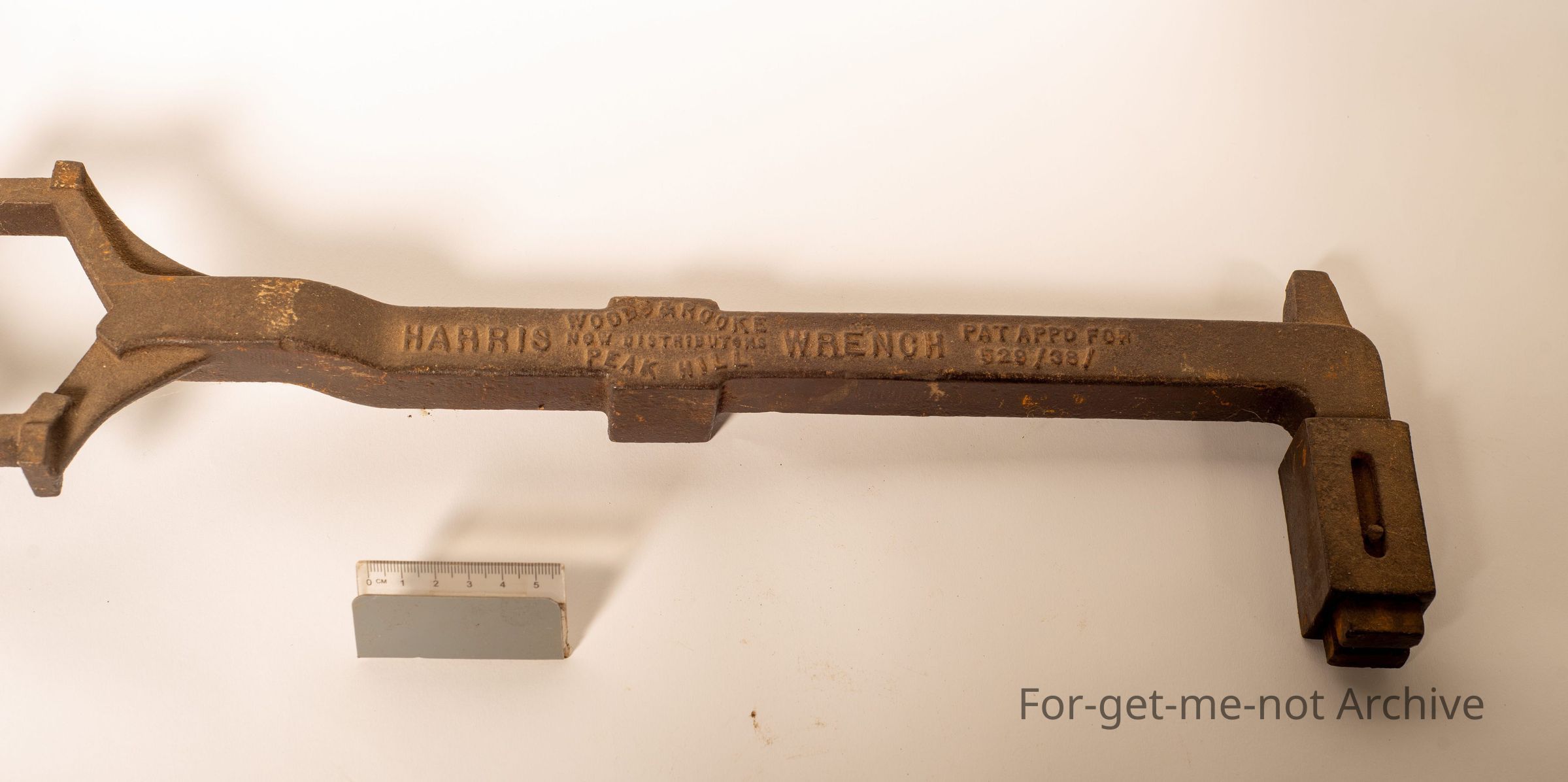This is a bung remover, made it's called the Harris wrench. It was, made in Peak Hill, New South Wales. Patent date of 1938. Manufactured by Wood and Brooks. Brook. Quite a rare tool. Variable size bungs.Collection