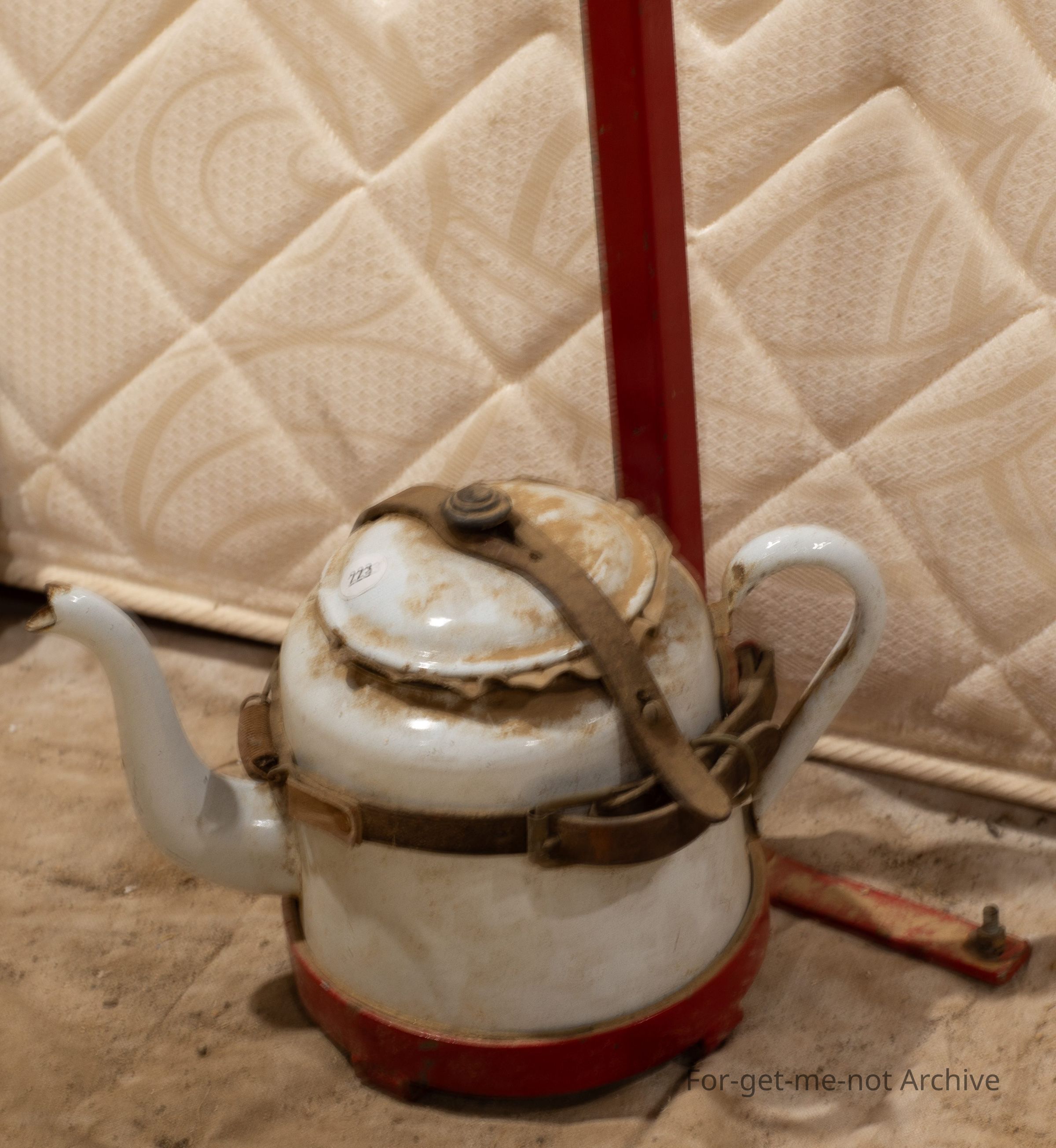 white enamel kettle with a leatejer collar locking it onto a frame possibly off a 1950s CFA truck