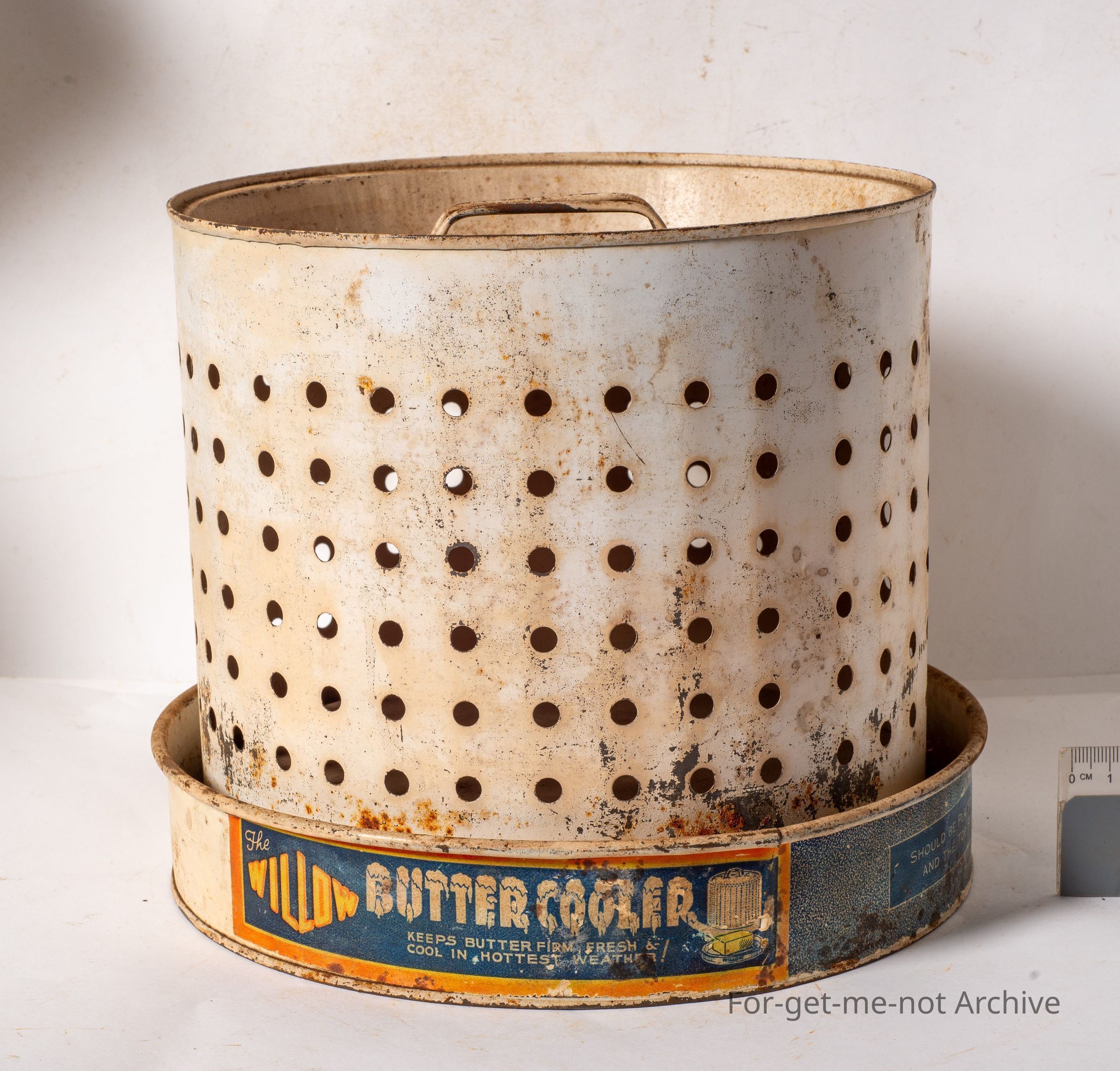 This is a metal butter cooler, made by Willow. It keeps butter firm and fresh and healthy. Has a water catcher on the bottom. Would have had a cloth, wetted with water to keep it cool through evaporation . Very good order.Collection