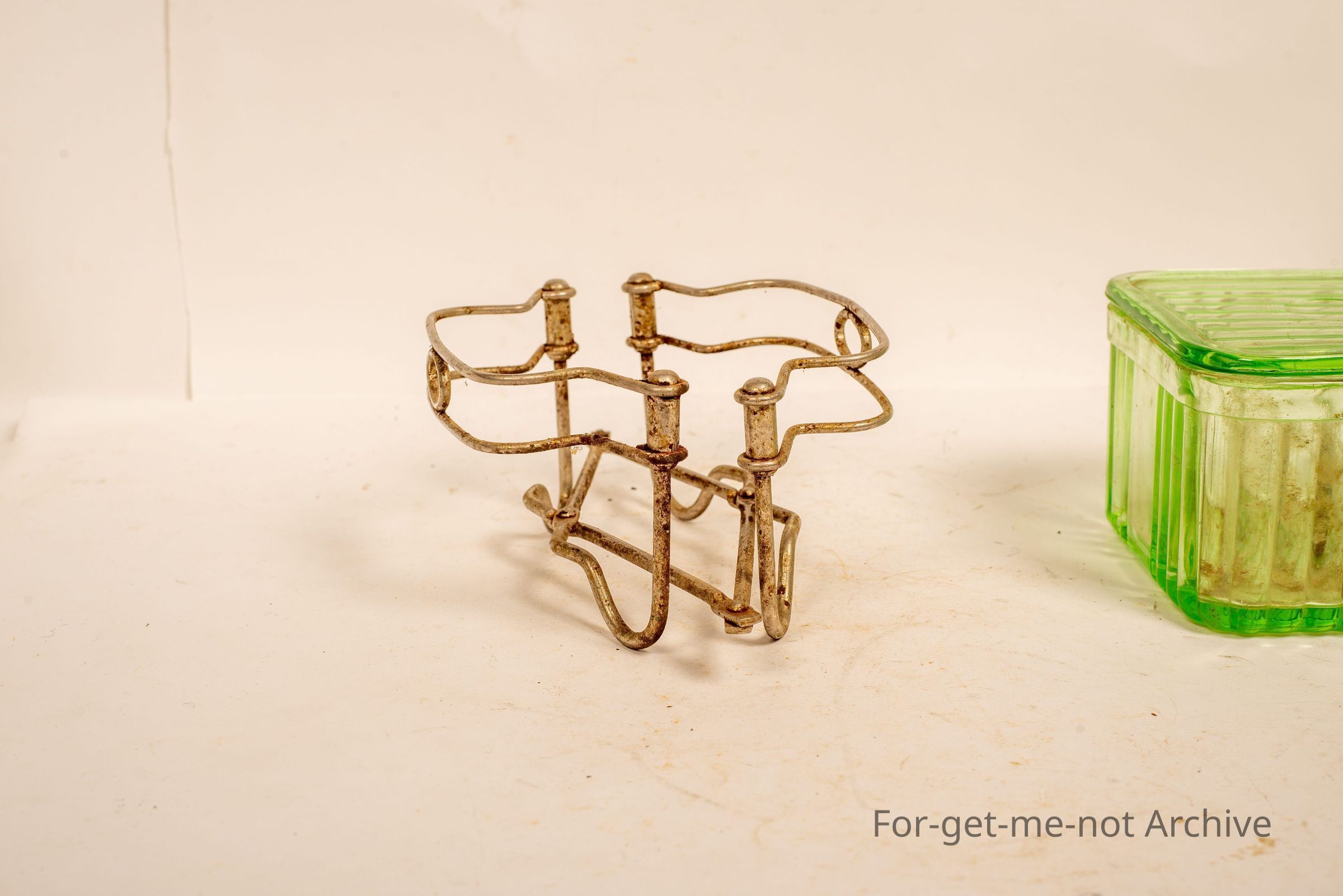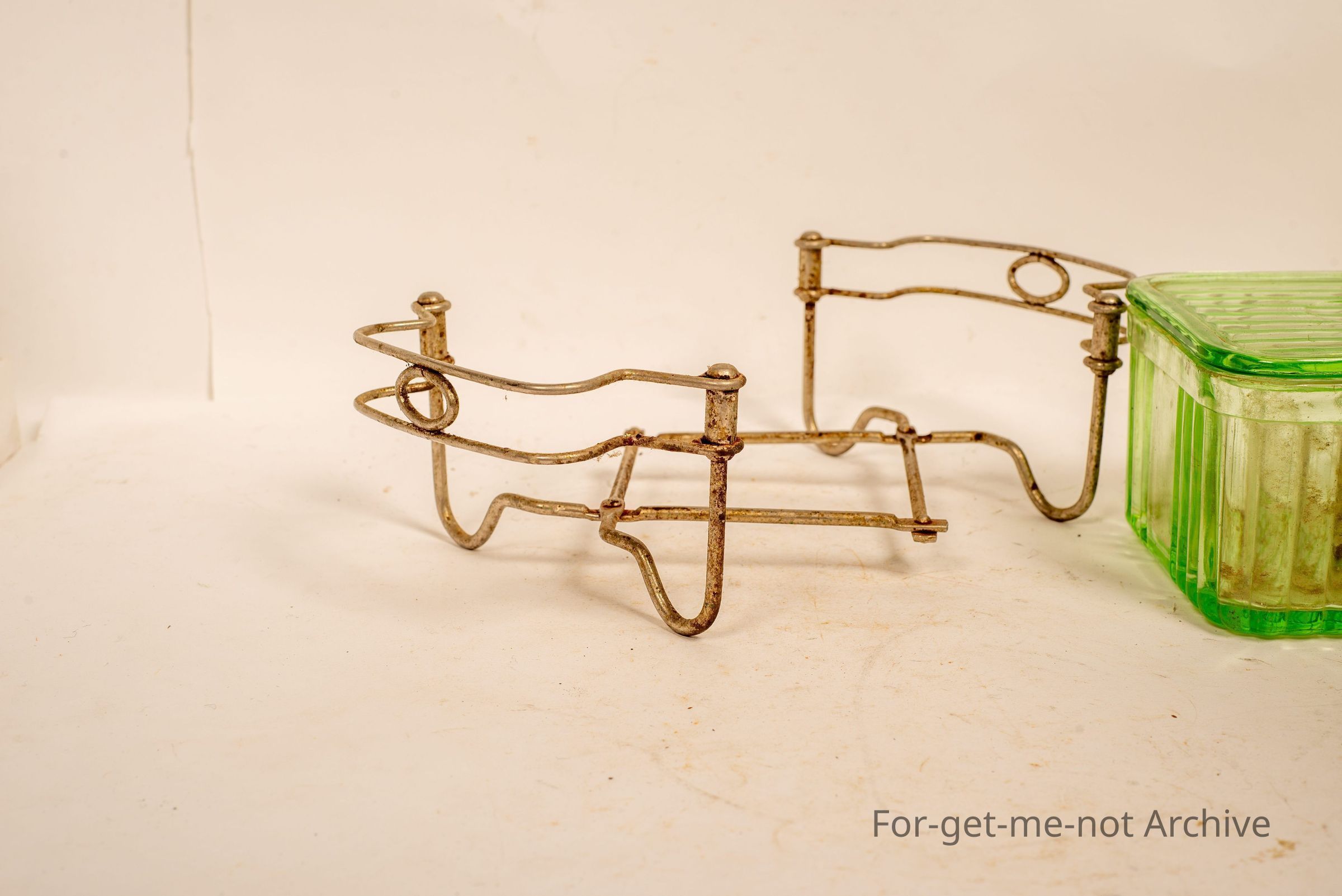 Is a butter dish of depression glass, green. The holder for this is expandable from the small size to the large size. It is all hinged. The the base is all made of metal. The base is the hard part to find.Collection