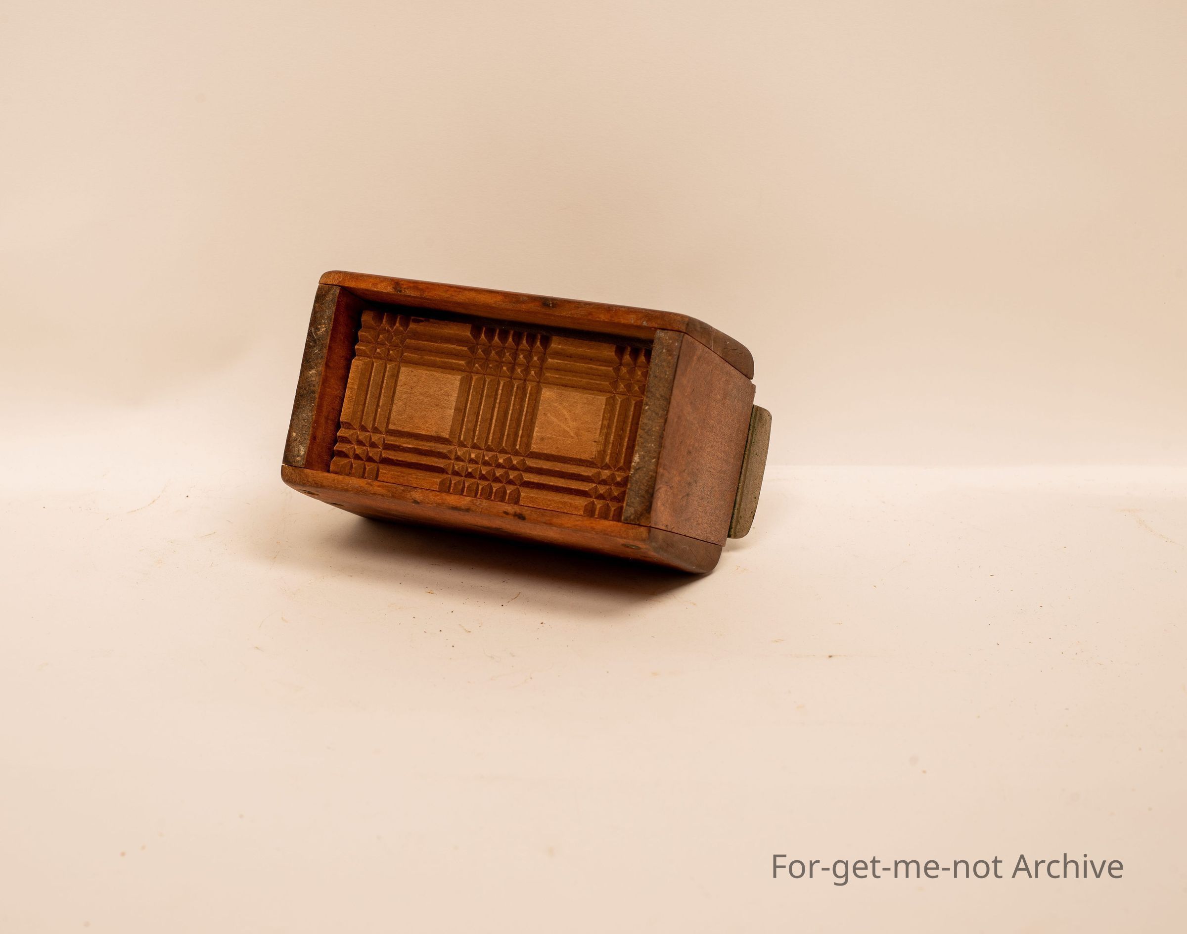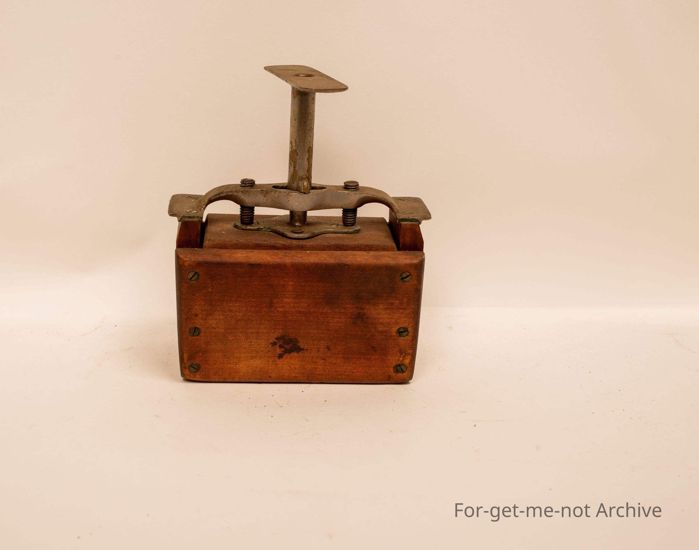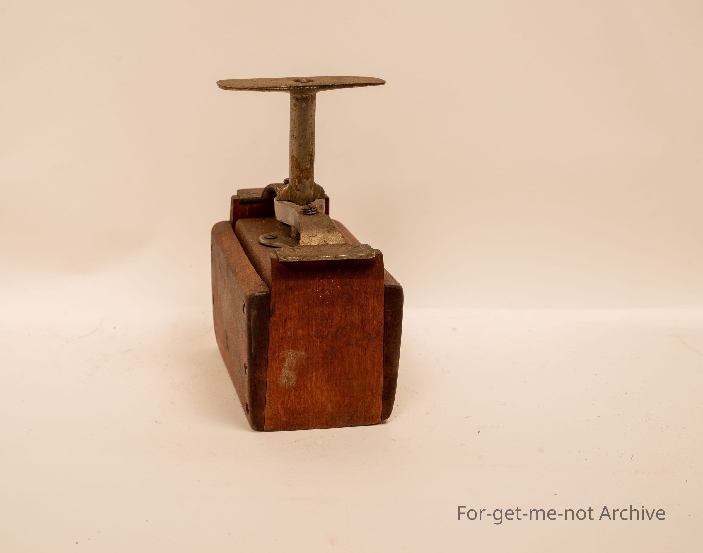 Wooden mechanized butter press with cross hatch pattern on the inside.