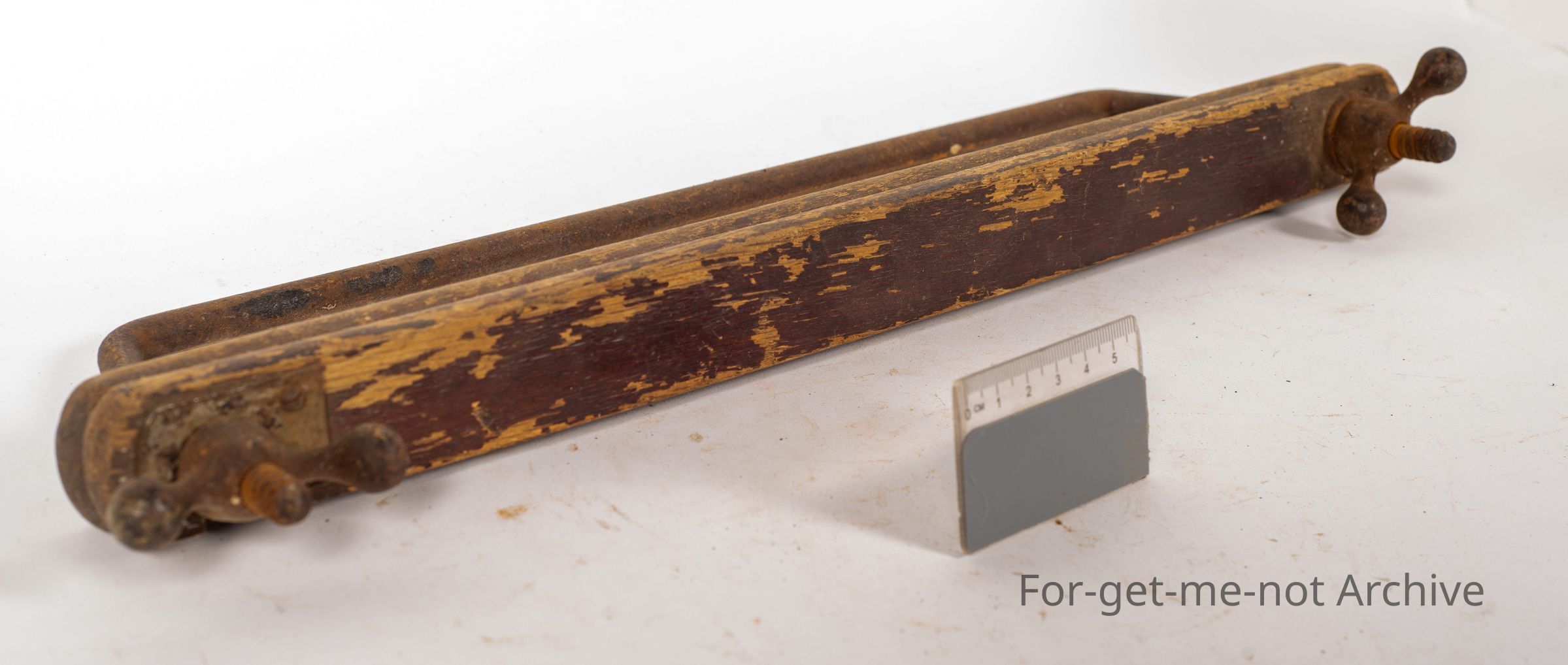 This is 2 pieces of wood with a rod that separates the 2 butterfly screw either end to create a clamp between the 2 pieces of wood. No stamping or identification but very well made. It will have to go to the what is it? It may be identified at some stage.Collection