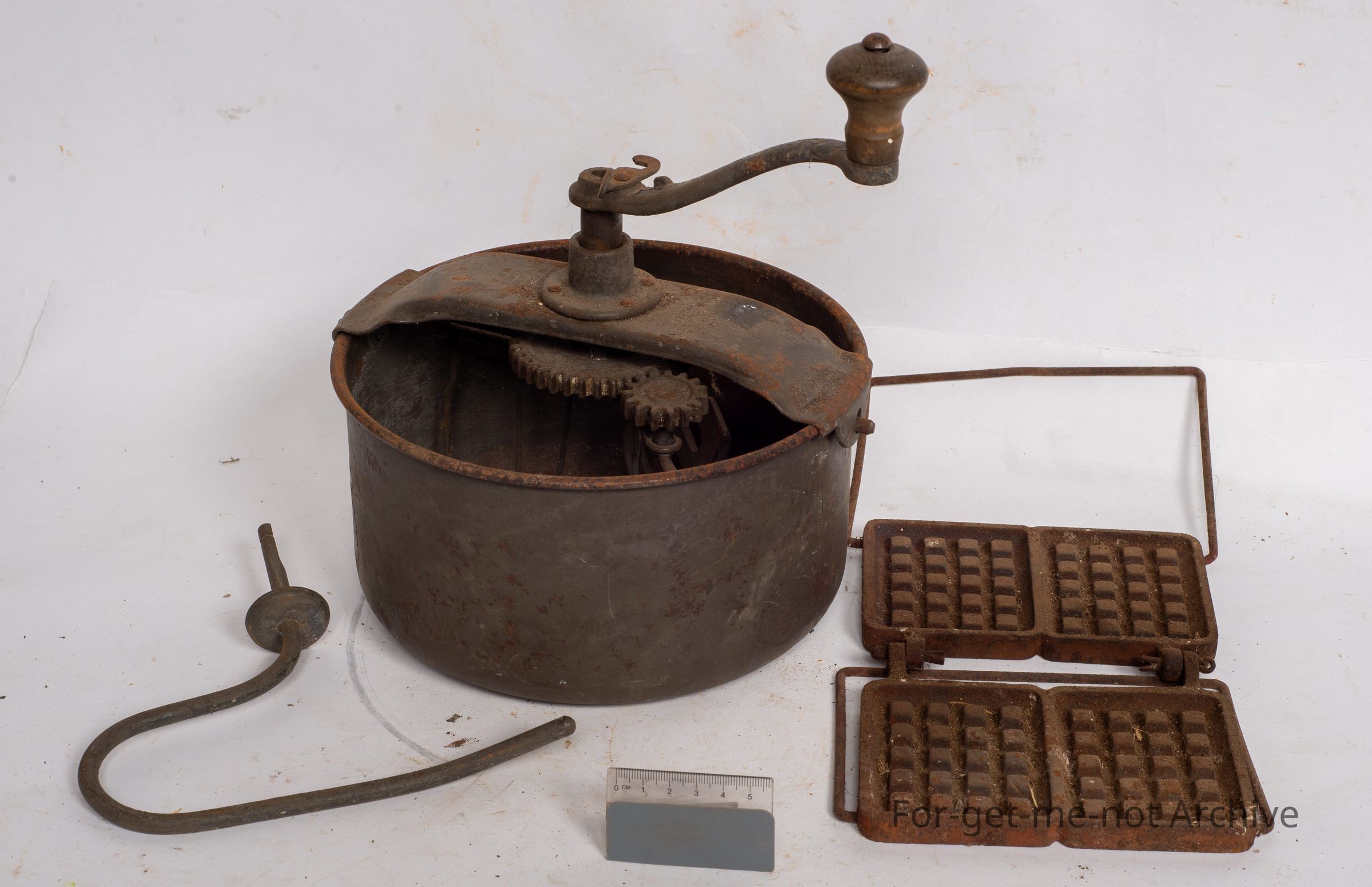 One is a tin cake mixer. These were clamped to a table. All the parts are there, including the clamp somewhere else. The second piece is a little, waffle maker, made of cast iron for 2 small waffles.Collection