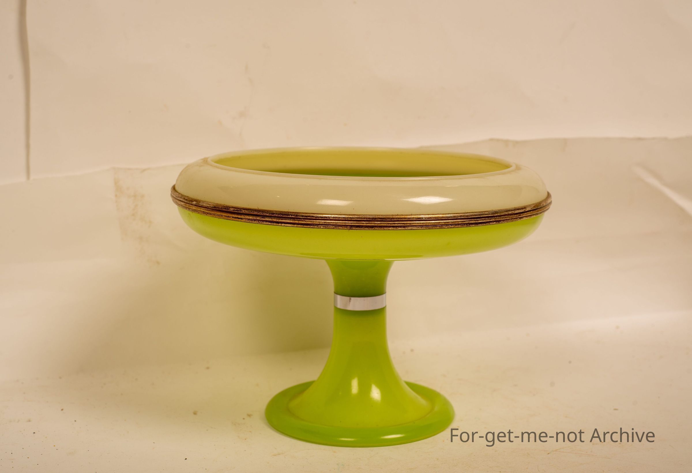 Plate with metal ring around the outer perimeter on a pedestal. No obvious makers name anywhere.