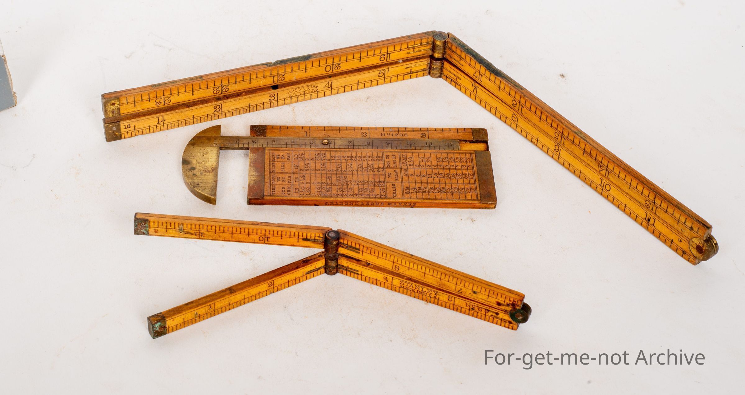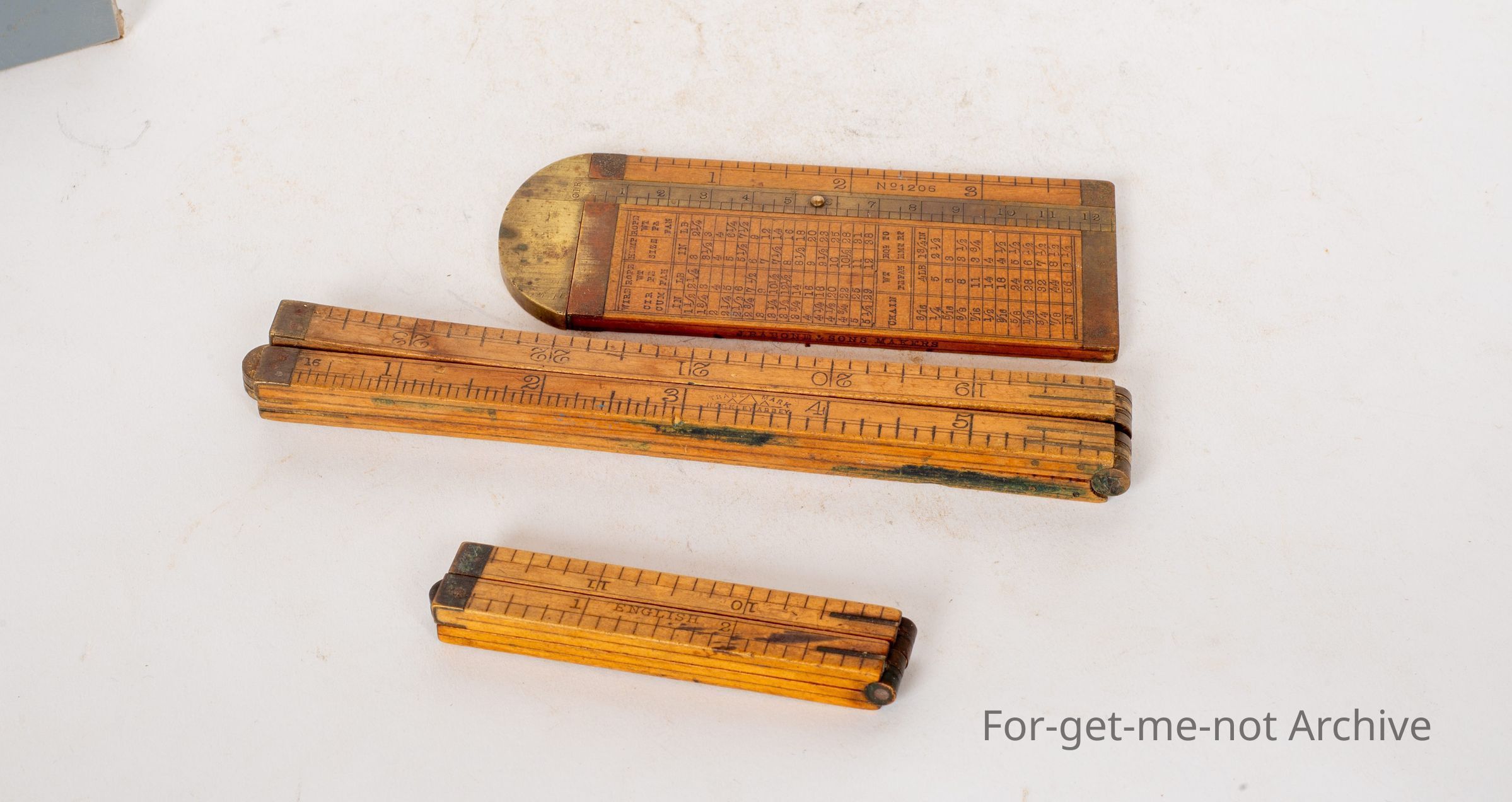First one, a multi calibrator of various, materials made by Rabone and Son Birmingham. Beautiful condition. A slide rule is incorporated in this. It's fitted into the frame. Fabulous piece of workmanship. Second one is a small, fold out ruler made by Hockey Abbey, probably English, still in good condition. The third one is a very hard one to find. The smallest of the fold out rule is made by Stanley USACollection