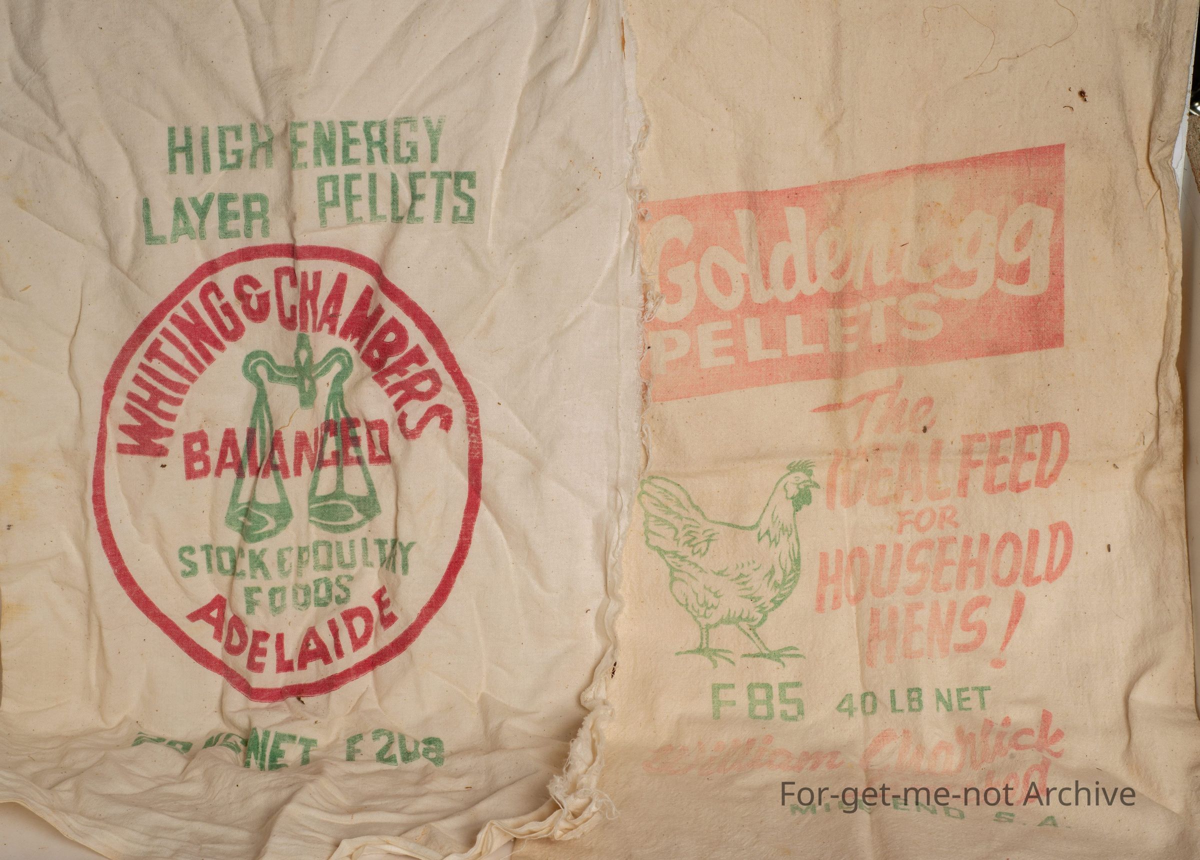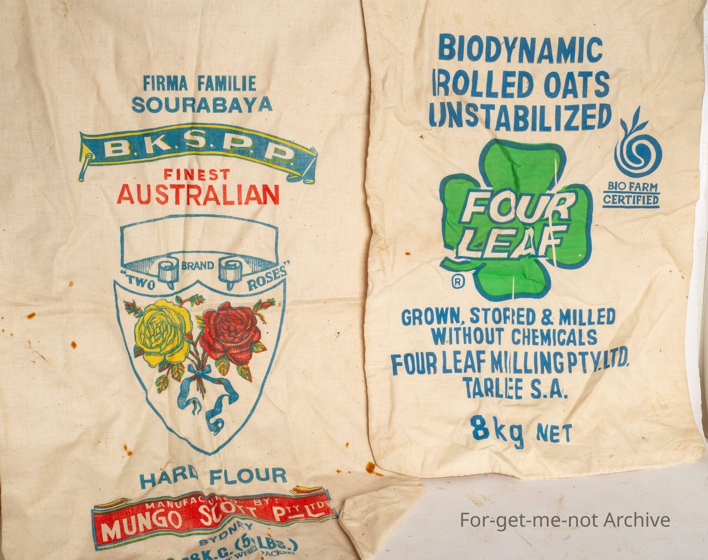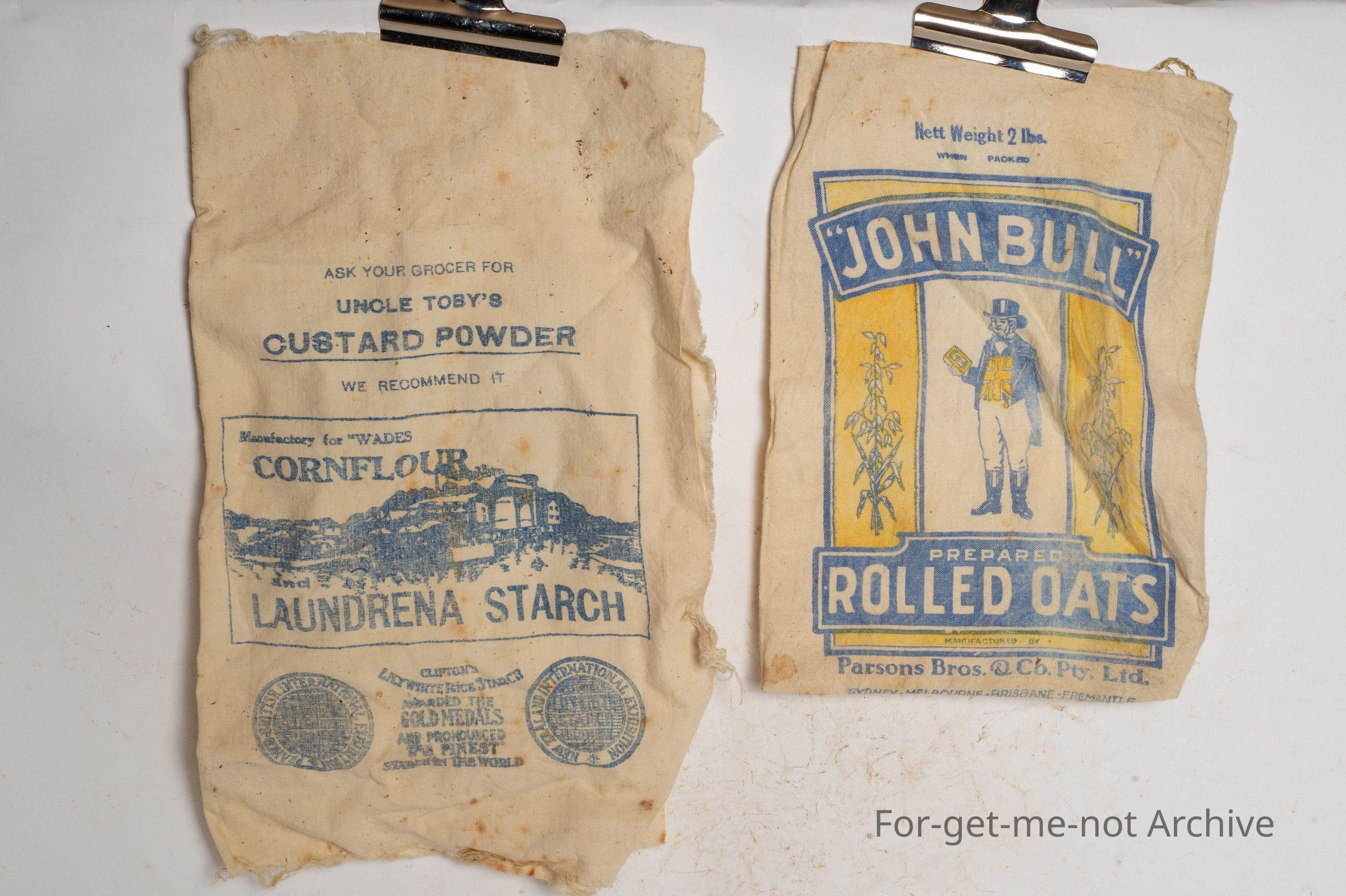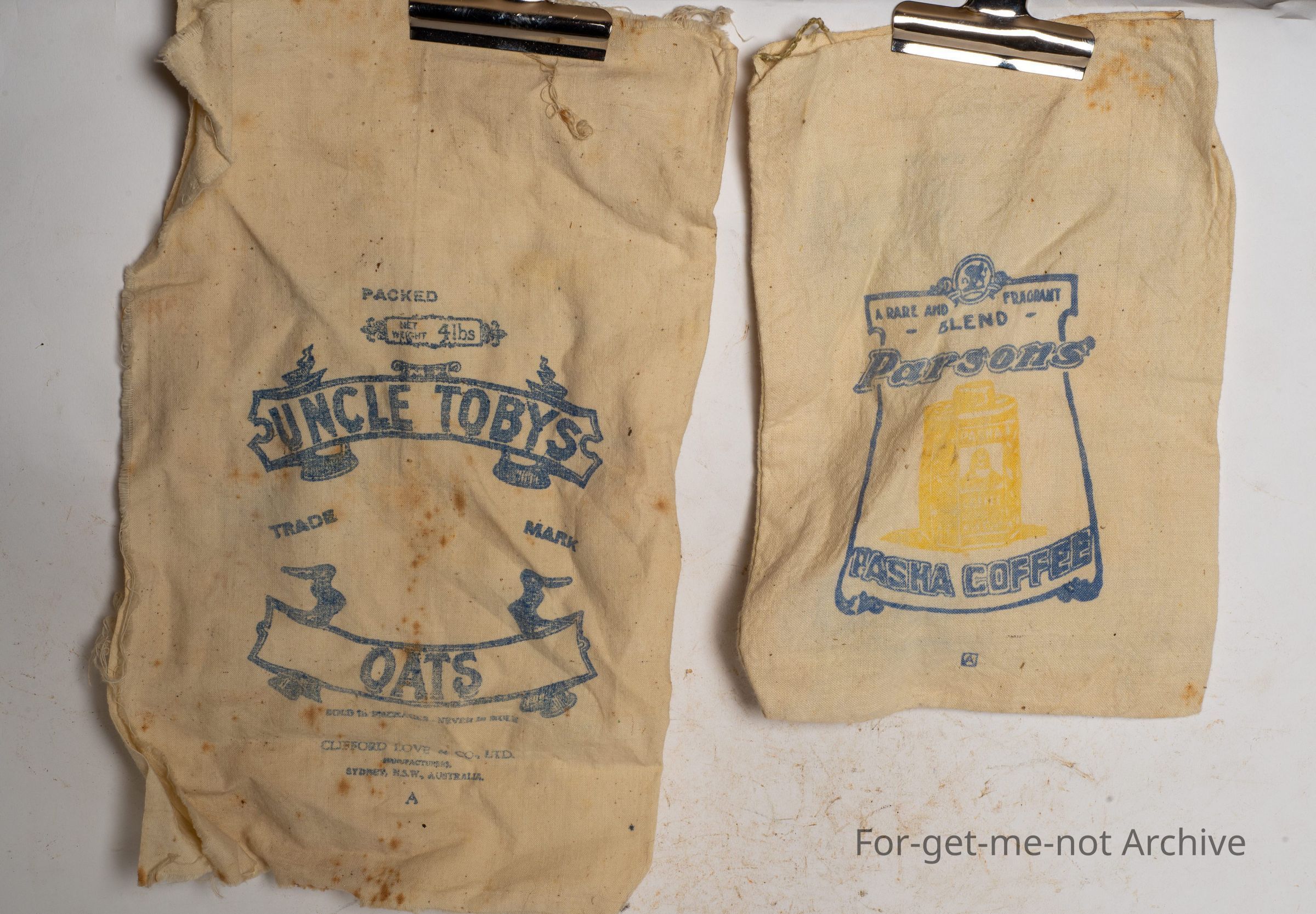 These are various calico bags for produce such as chook food, flour, porridge, all sorts of products from the period when everything was put into calico bags to market.
