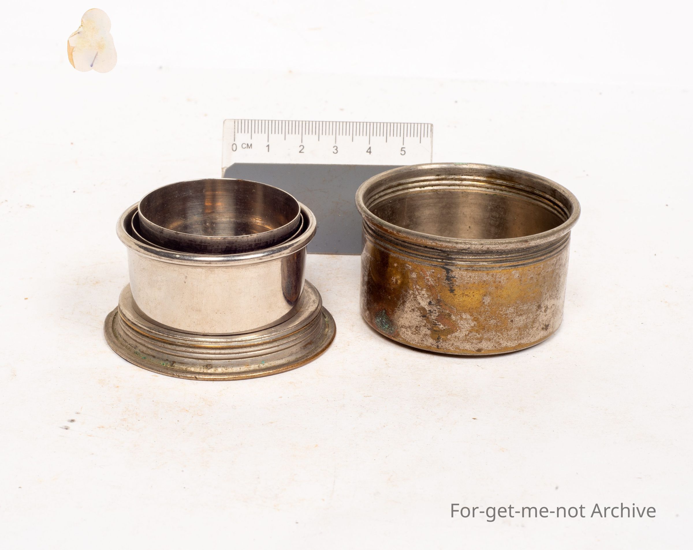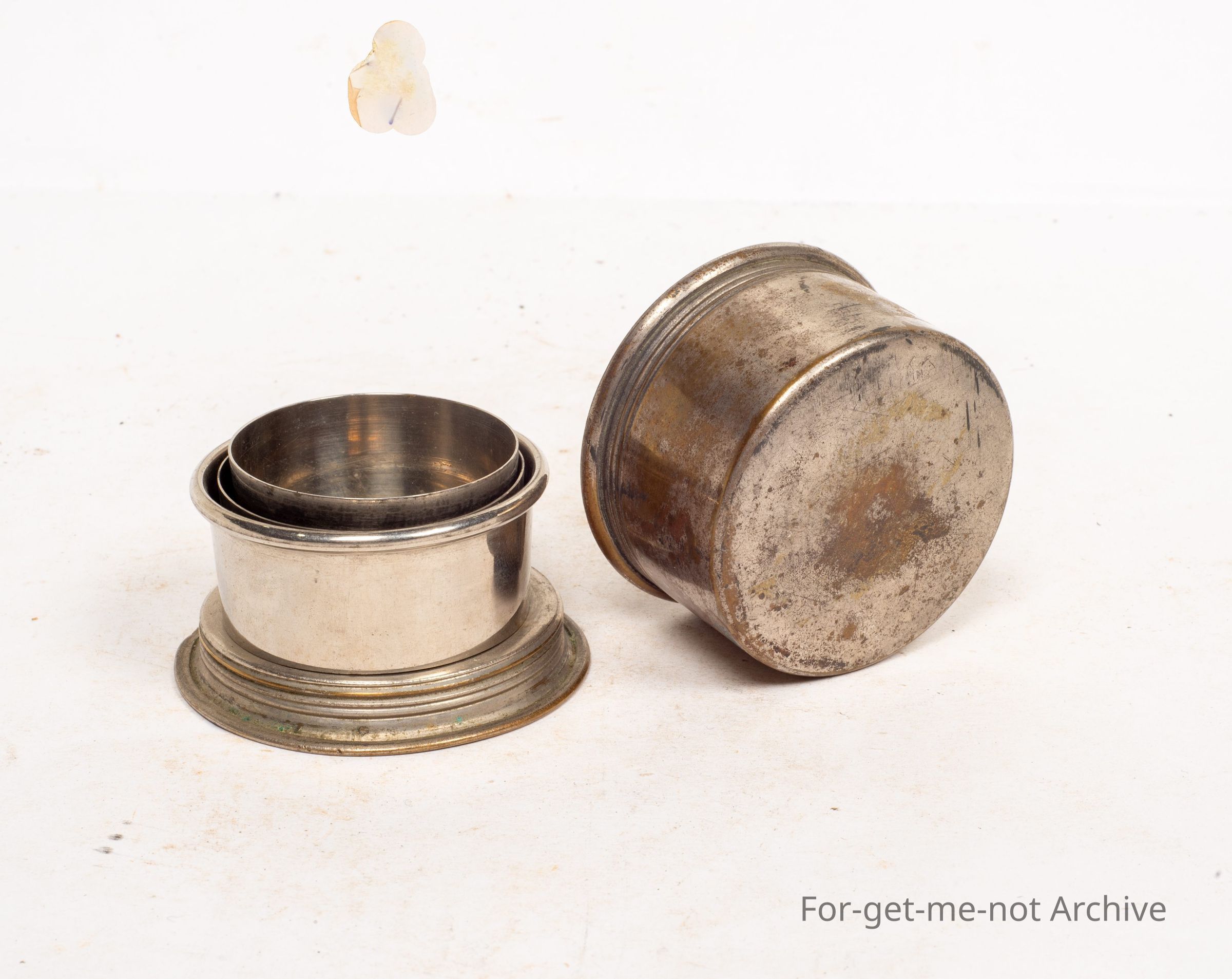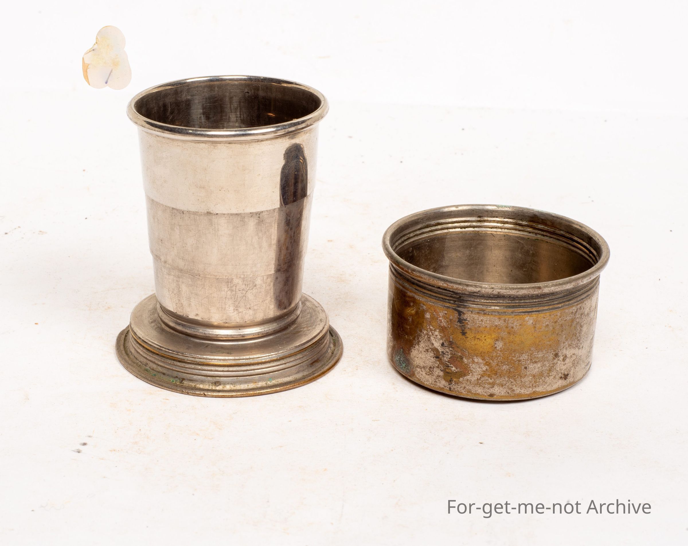 A metal, concertinaing campers cup. This has the top, the base, the whole thing works. No information on it. Beautifully made, could still be used,
