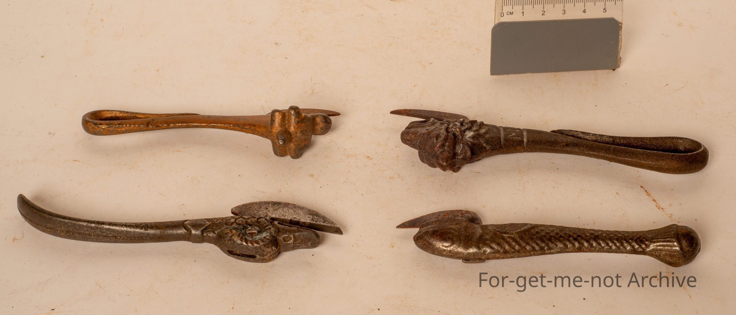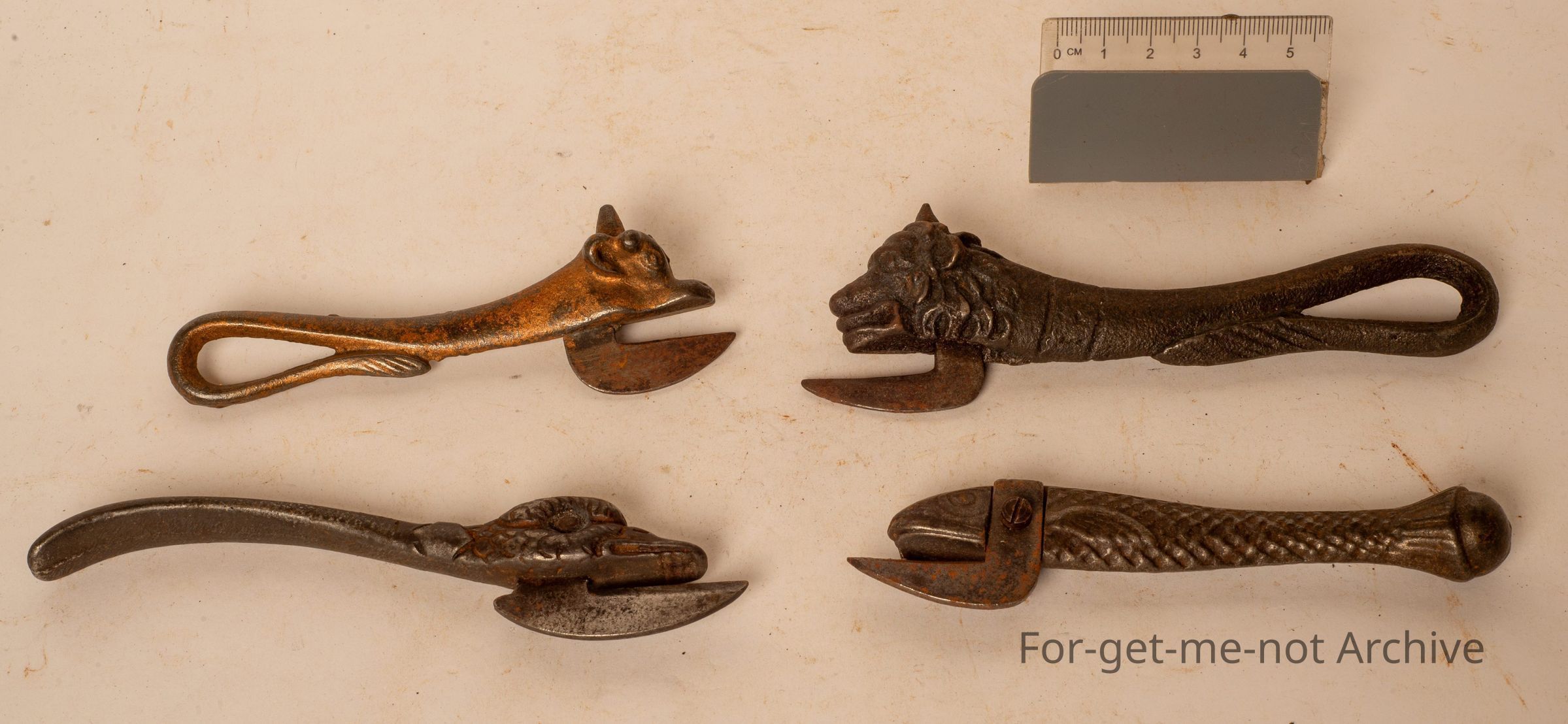 Lion's head can opener, is very rare, lovely condition, still got the poncho point to, open the can at the top. The next one is a fish, Fish can opener. The third one is the small one of the, ball can opener, in very good condition with its original bronzy coloured paint. fourth one is a very rare one, a duck's head opener. Missing the spike piece at the top, but still exceptionally rare.Collection