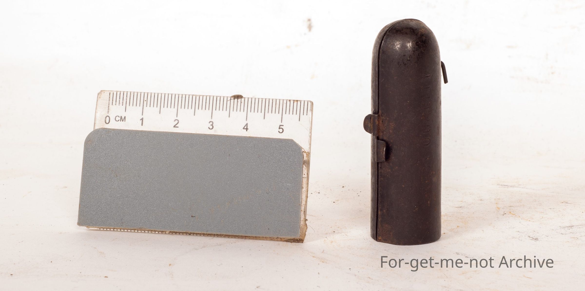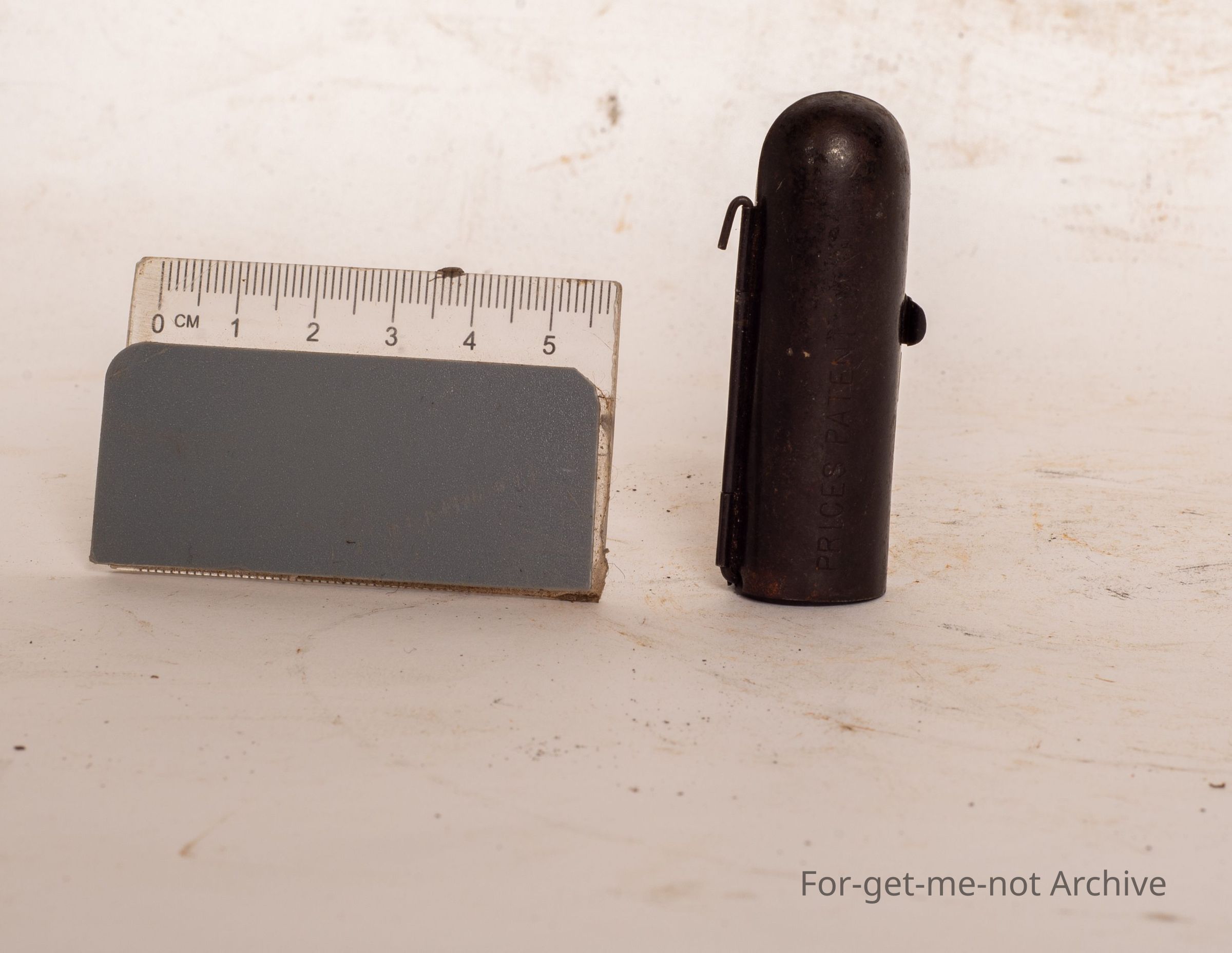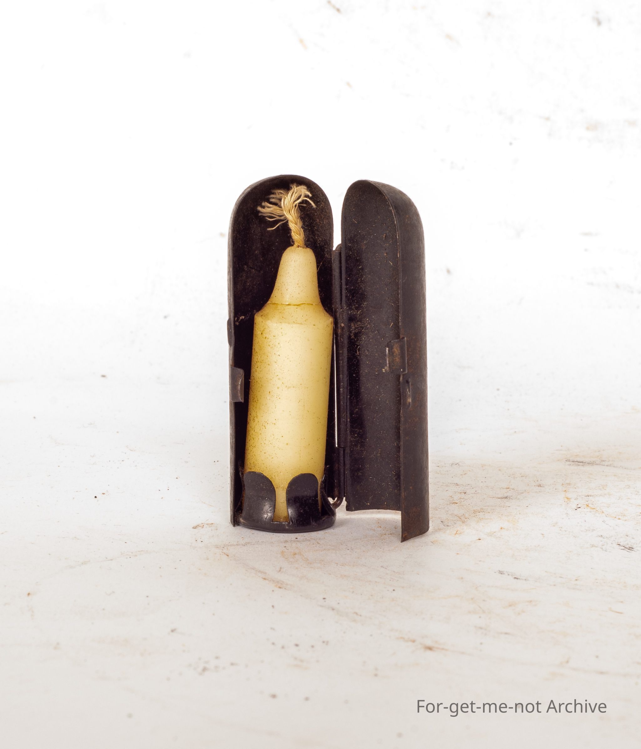This is a beautiful little, fold away, candle container from Prices Candles. The candle has never been lit. The original candle. The box the little tin, shaped like a cylinder that locks up in perfect condition, stamped, applied patent. And on the stamped in the side, prices patent candle. Best quality. Wonderful little piece. Ever large,Collection