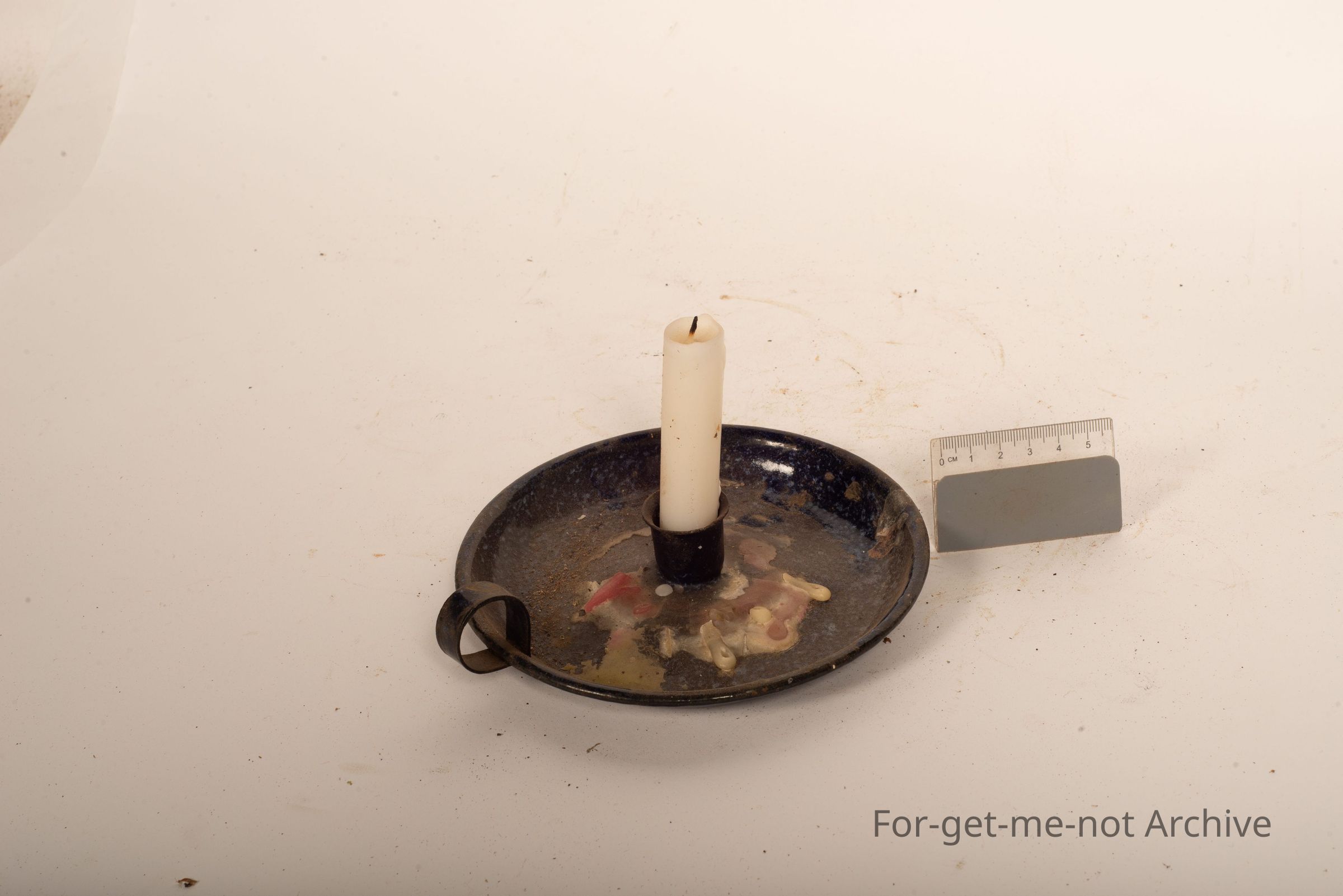 This is a little enamel, candle holder with a finger attachment. The enamelware is in very good condition, quite sweet
