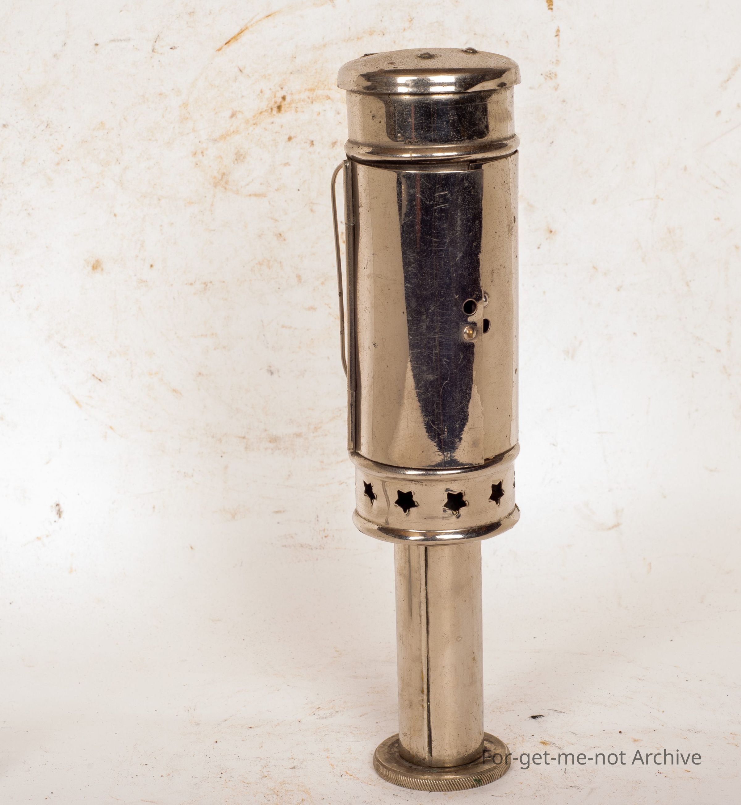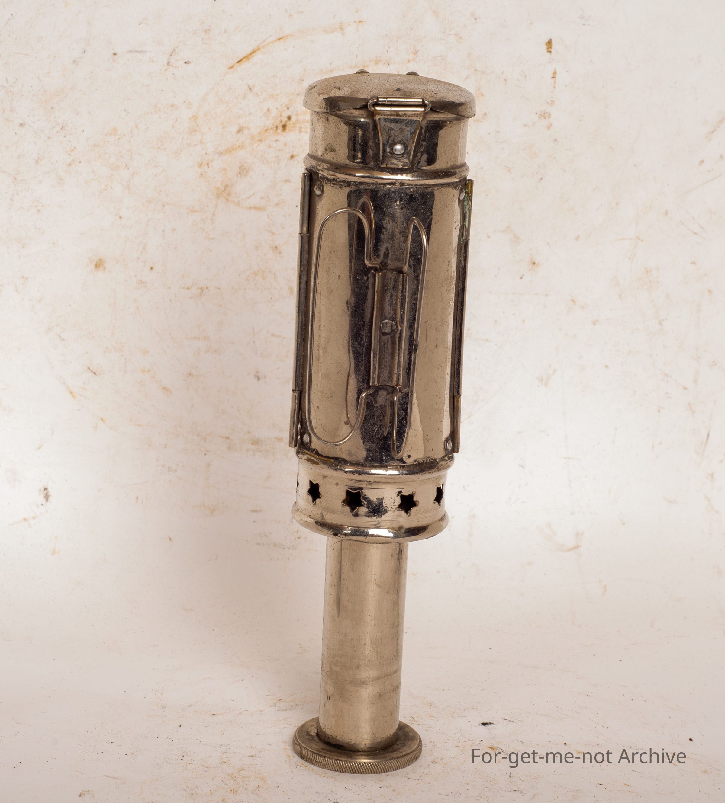 This is a beautiful little candle lamp with folding closing doors. It has an extendable base that comes out, to adjust the height of the candle. It has a catch on the top lid to help, hang it in any place. Hand grips on the back for carrying. Quite a dainty piece. Got the original mica lens in it. These are quite a rare lamp. Hard to find value.Collection