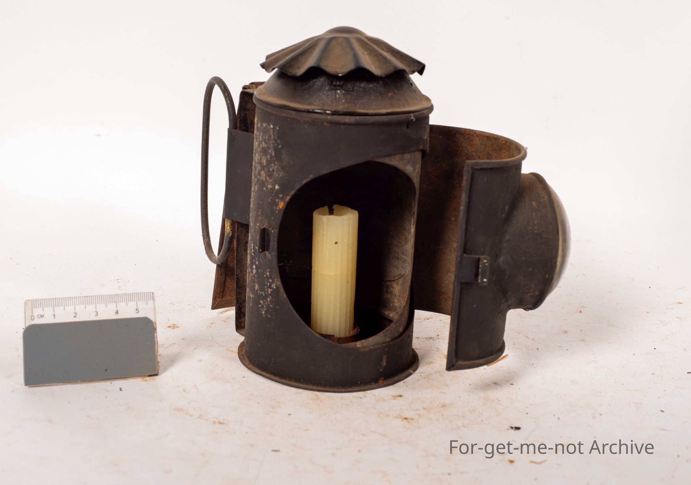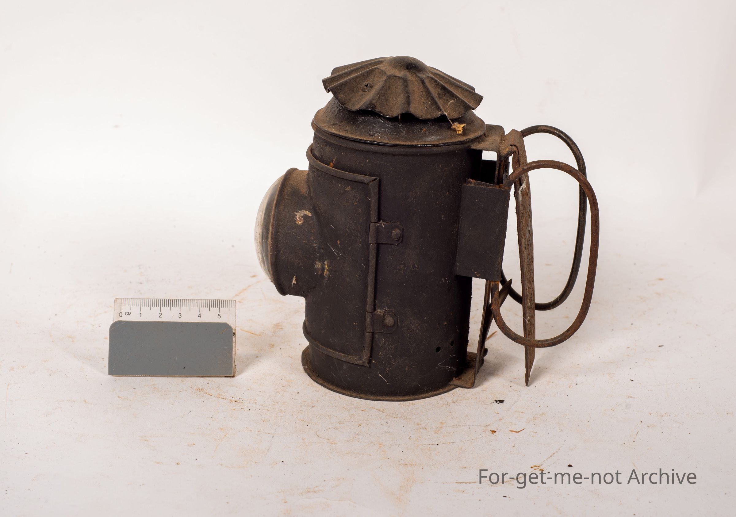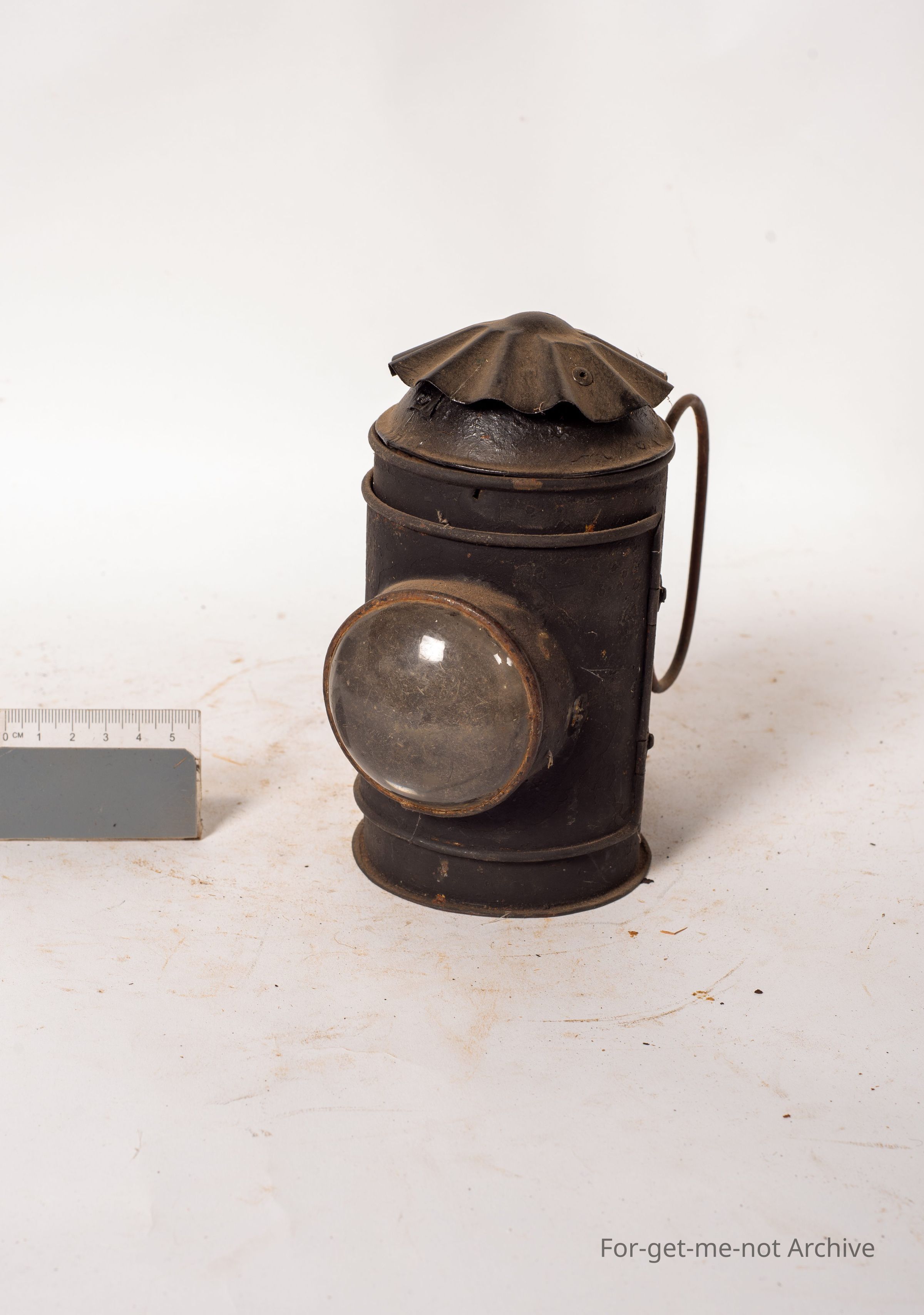 This small tin lamp is known as the bull's eye. This was a candle lamp. Very large, lens of thick glass to radiate the light. A beautiful fluted, tarp on it, handles, everything intact.Collection