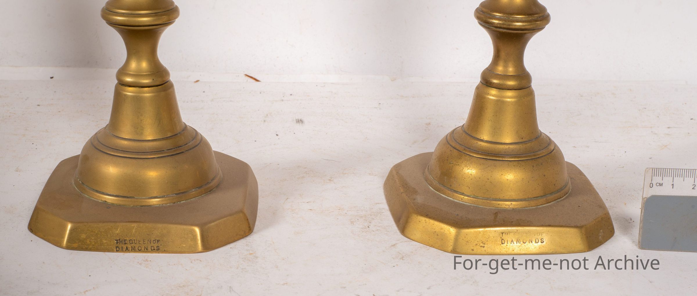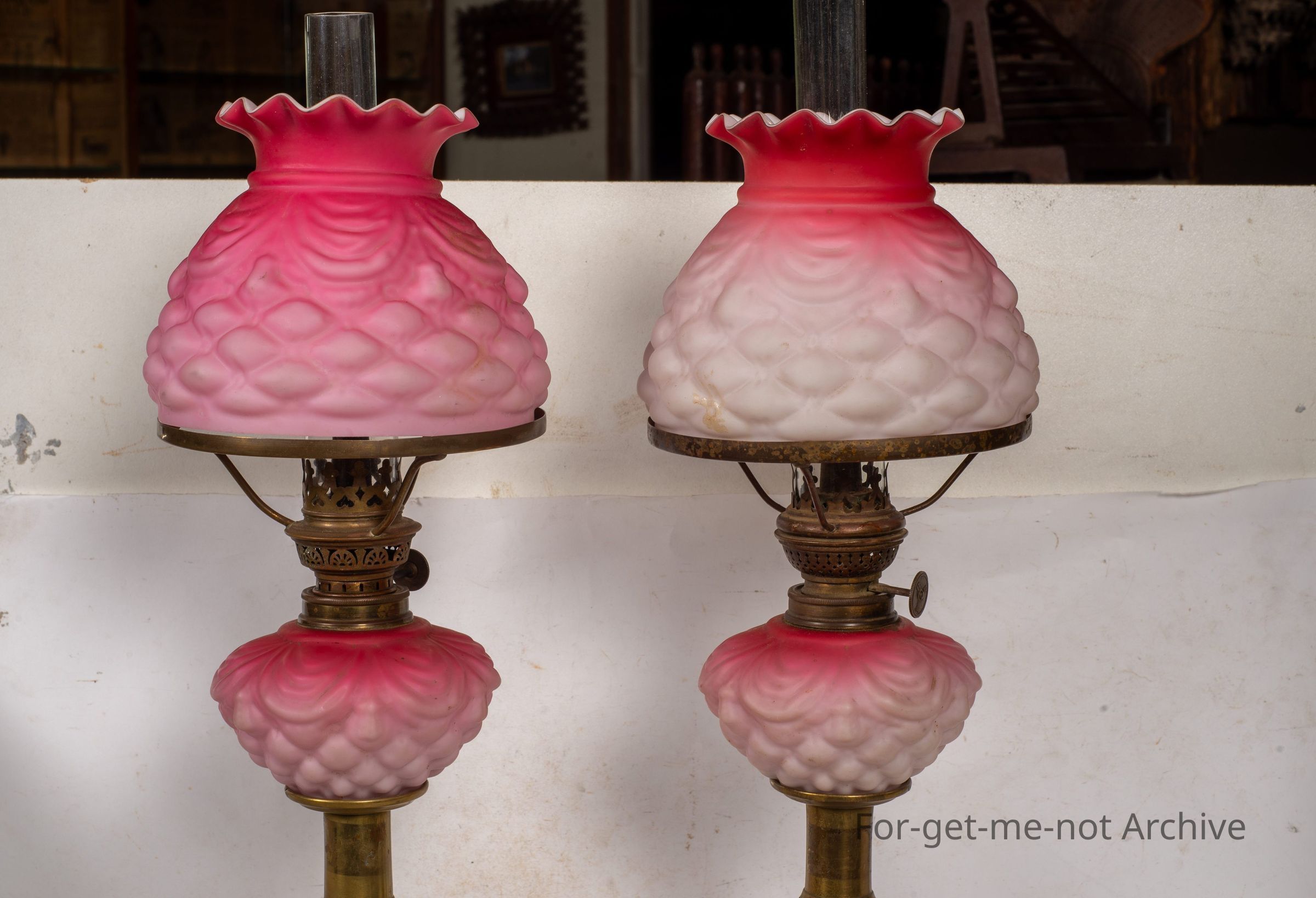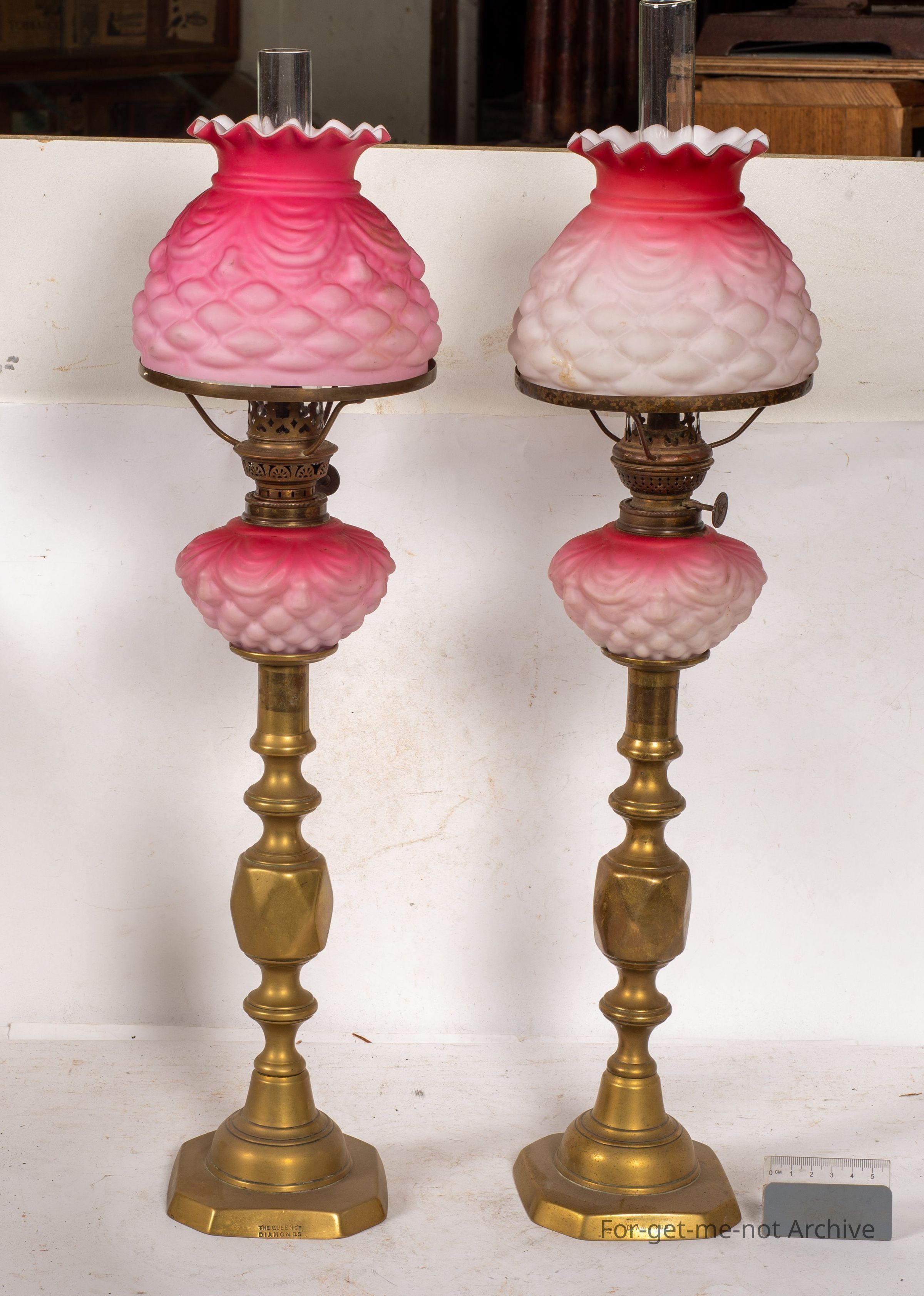 Sangeet Collection. This is a pair of the Queen candlesticks which is stamped into the base of each stick. These are a matching pair of sticks with a matching pair of, peg lamps with the Blushed, shade and font, all in wonderful working order. Original burners. These are a very special pair of peg lamps together.Collection