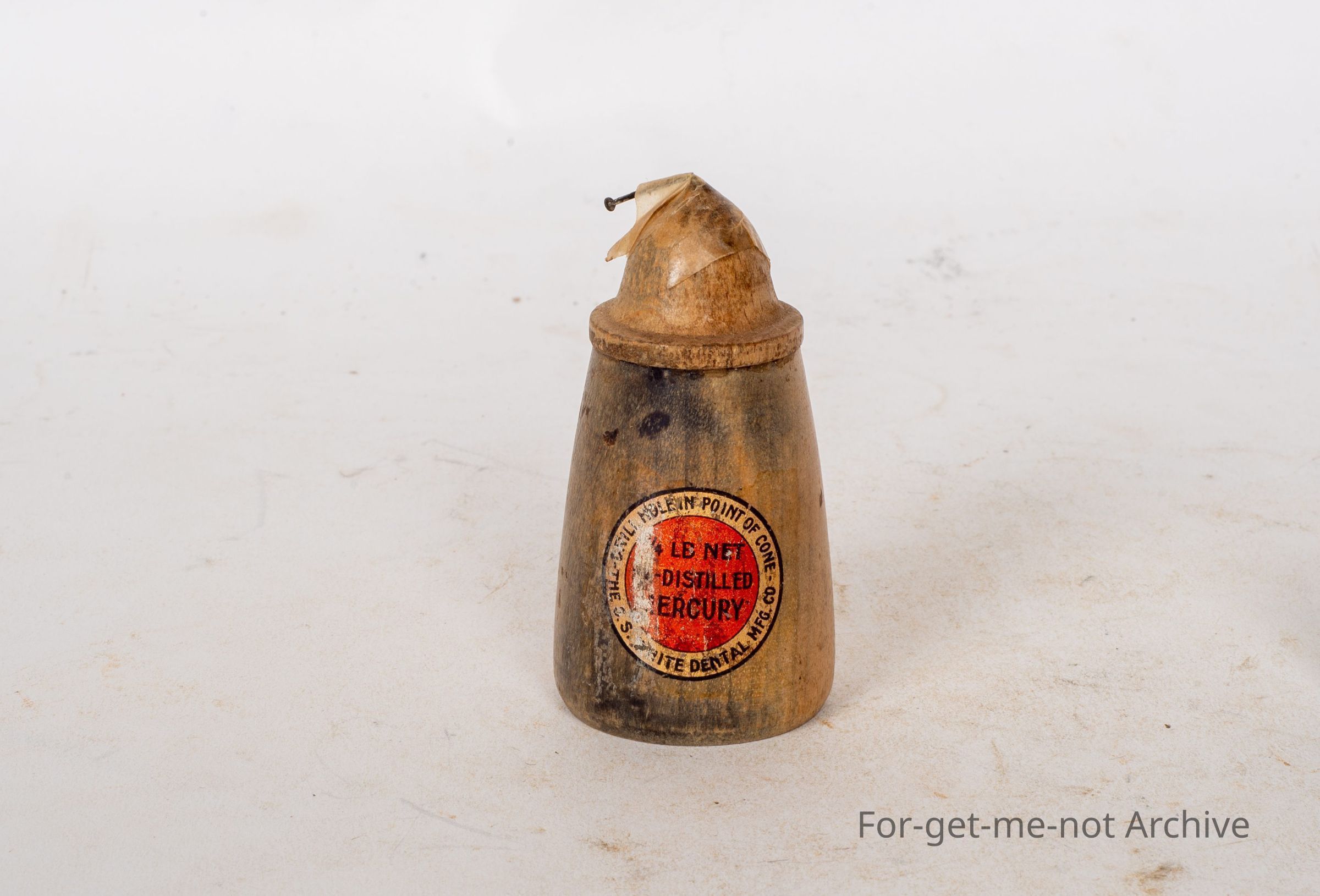 This is a wooden canister of distilled mercury for dental use. Quite an unusual piece. They're usually in ceramic containers. This one's in wood, never been opened properly. You can feel the liquid mercury in it.Collection