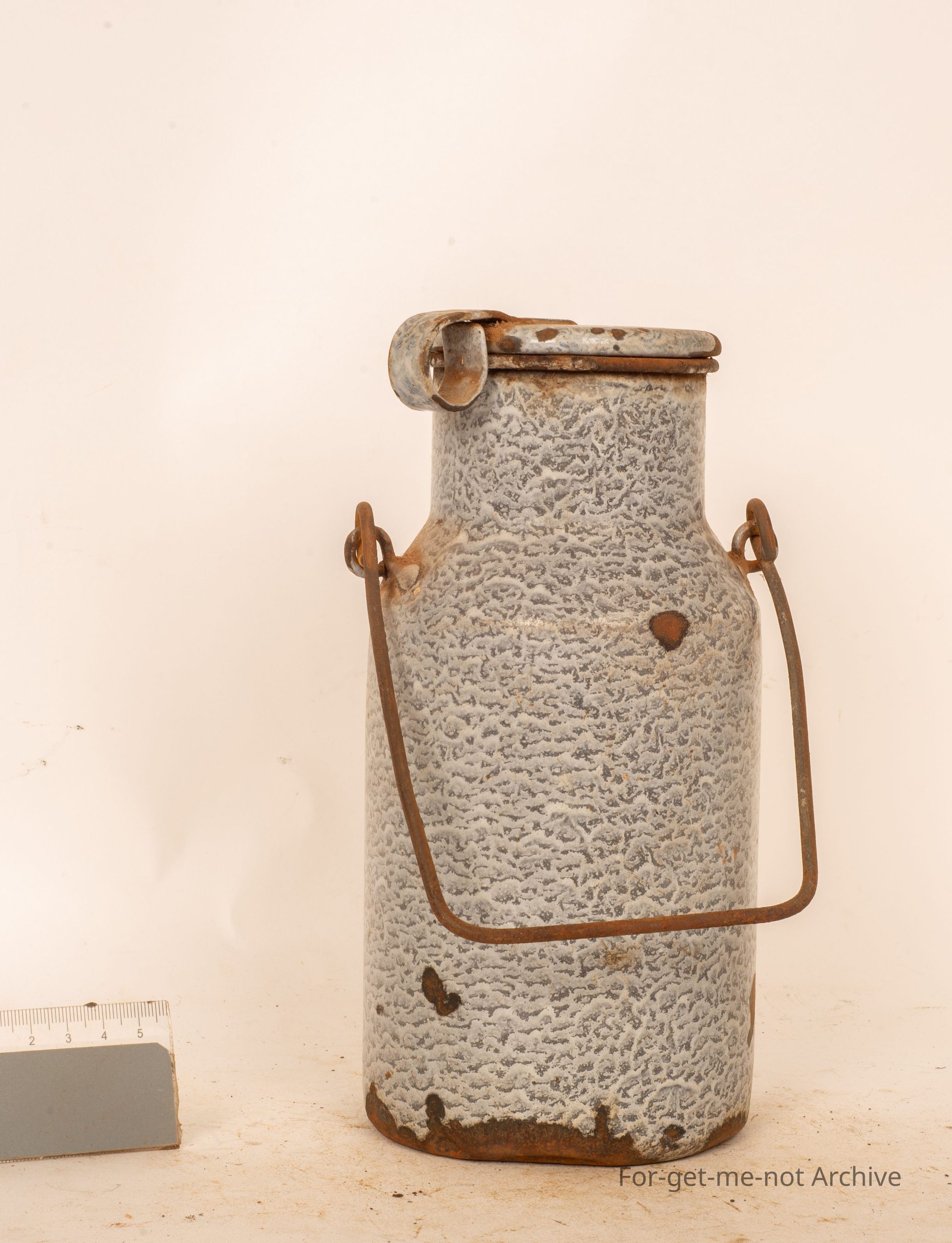 Enamel lid with a finger grip to lift it off. Little handle, a larger size than the other. Has a stamp on the bottom with maybe a lyrebird on it