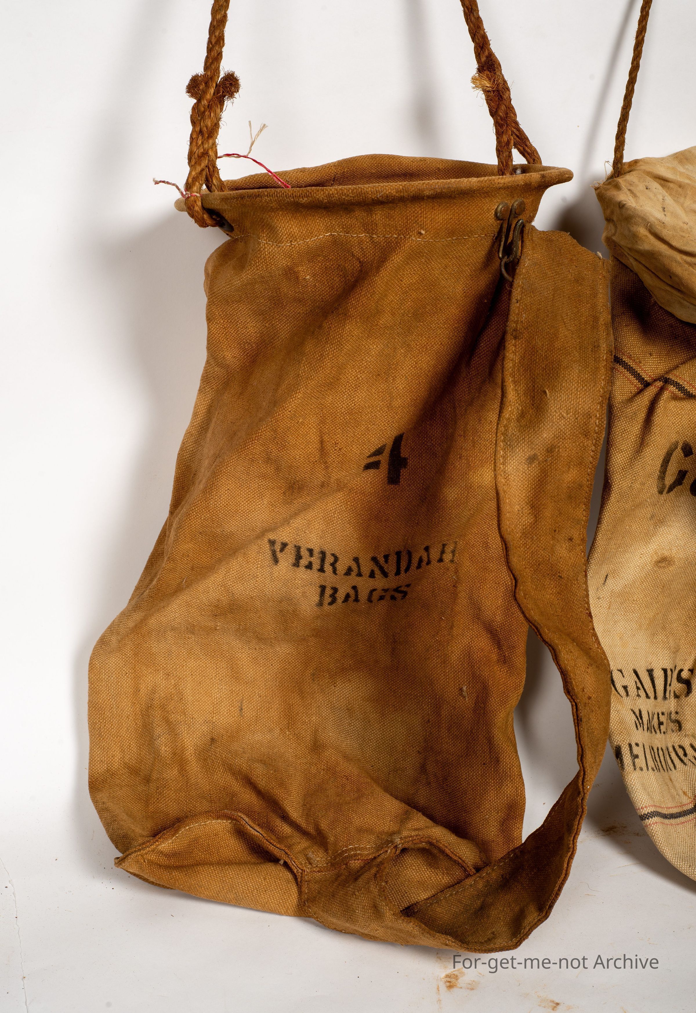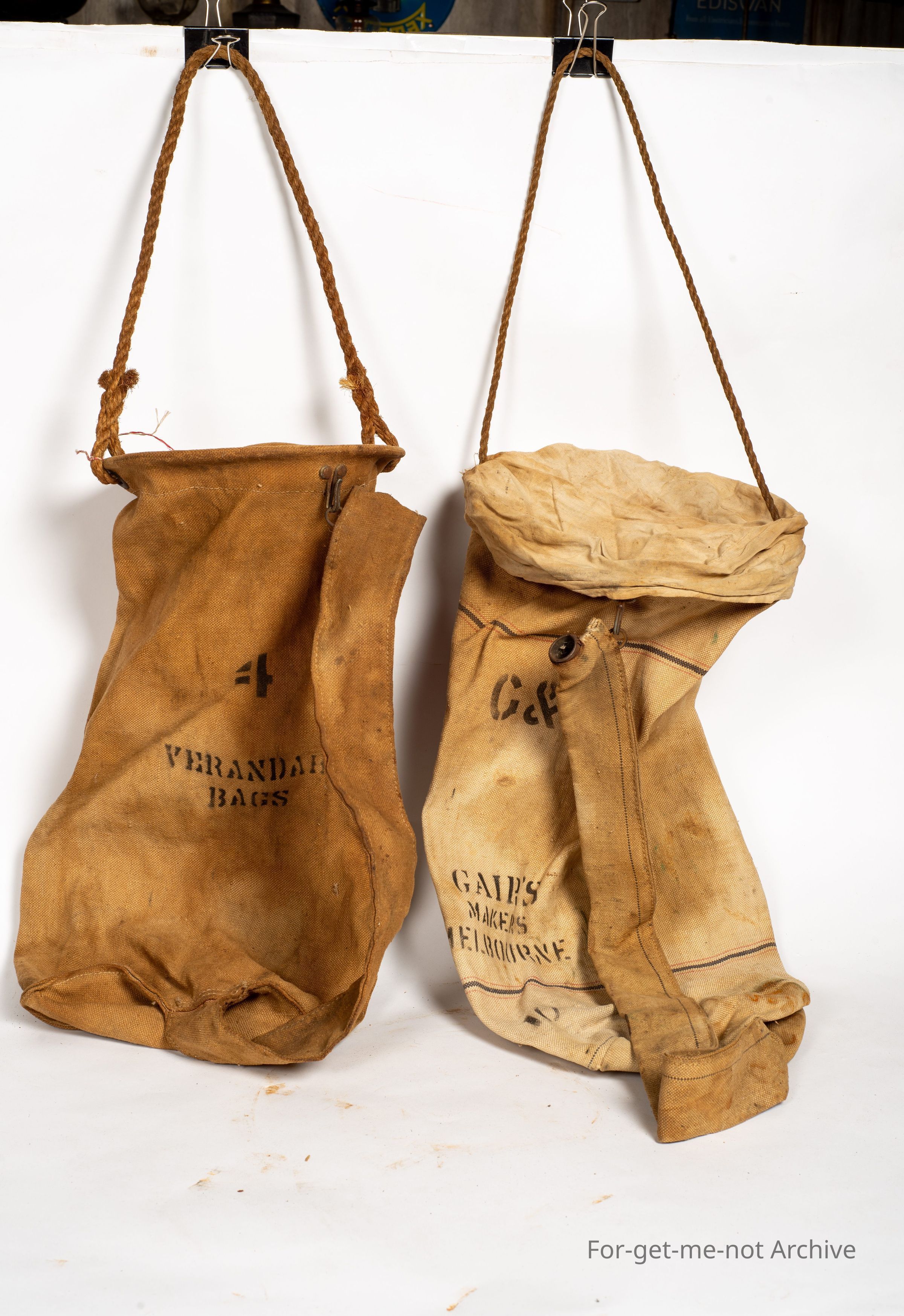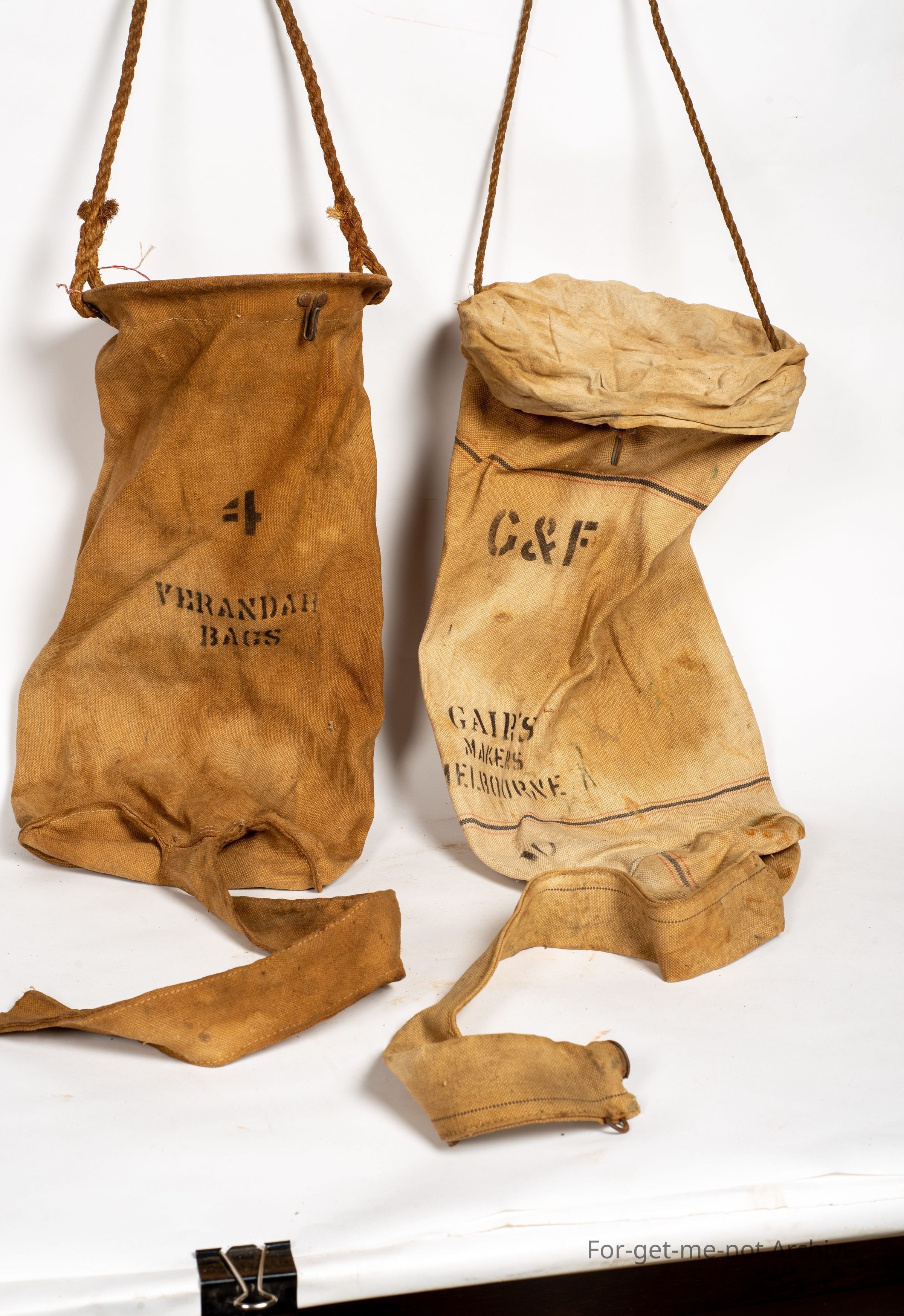 These are 2 glorious canvas veranda bags. One made by Gair's Makers Melbourne. These have double strainers in the top. The loose nozzle hangs up when you want the water. You put it down to fill up your, bottle or whatever. Both of them, considering the age and what they are used for, they're both in superb condition, they're very hard to find from an earlier time.Collection