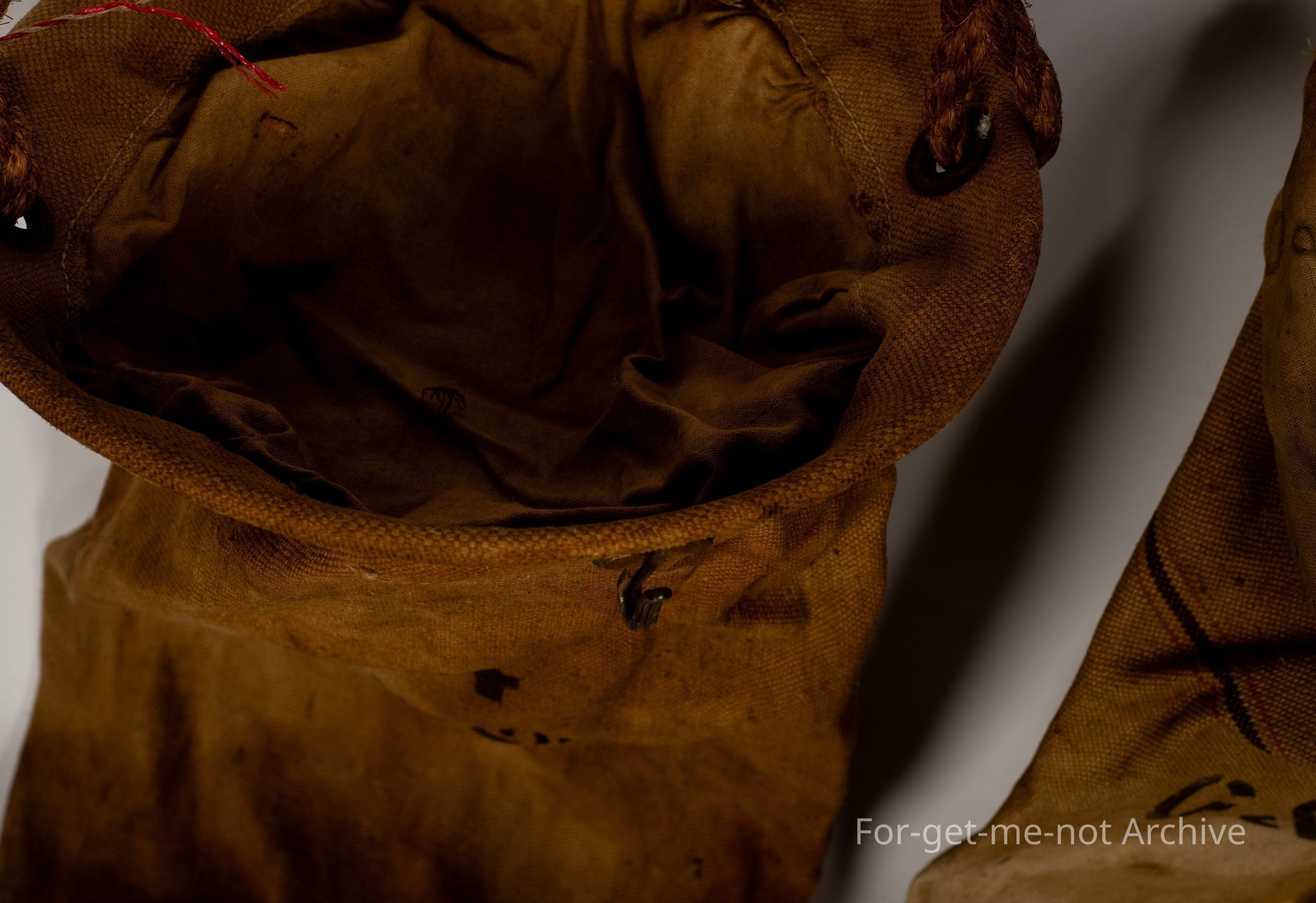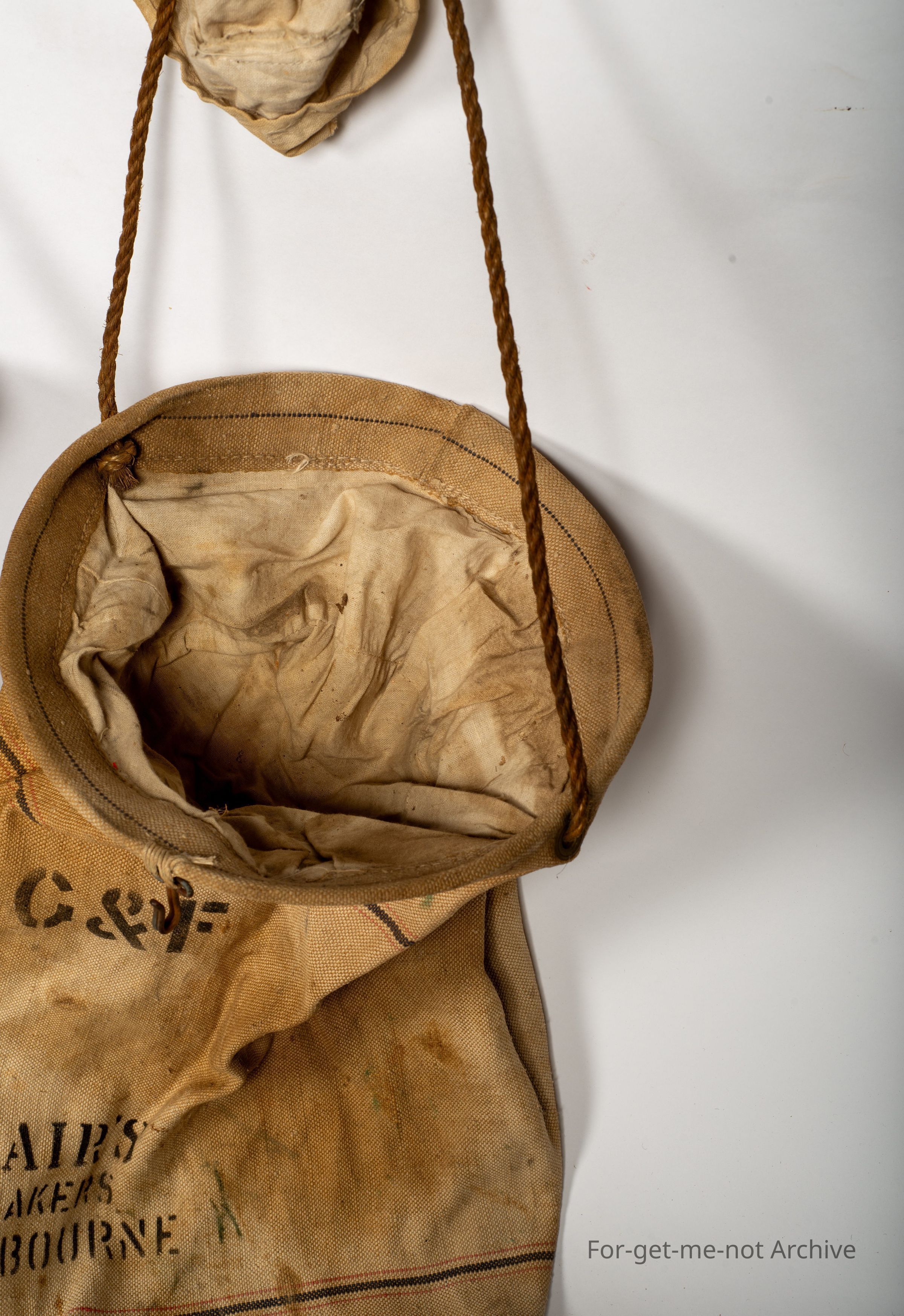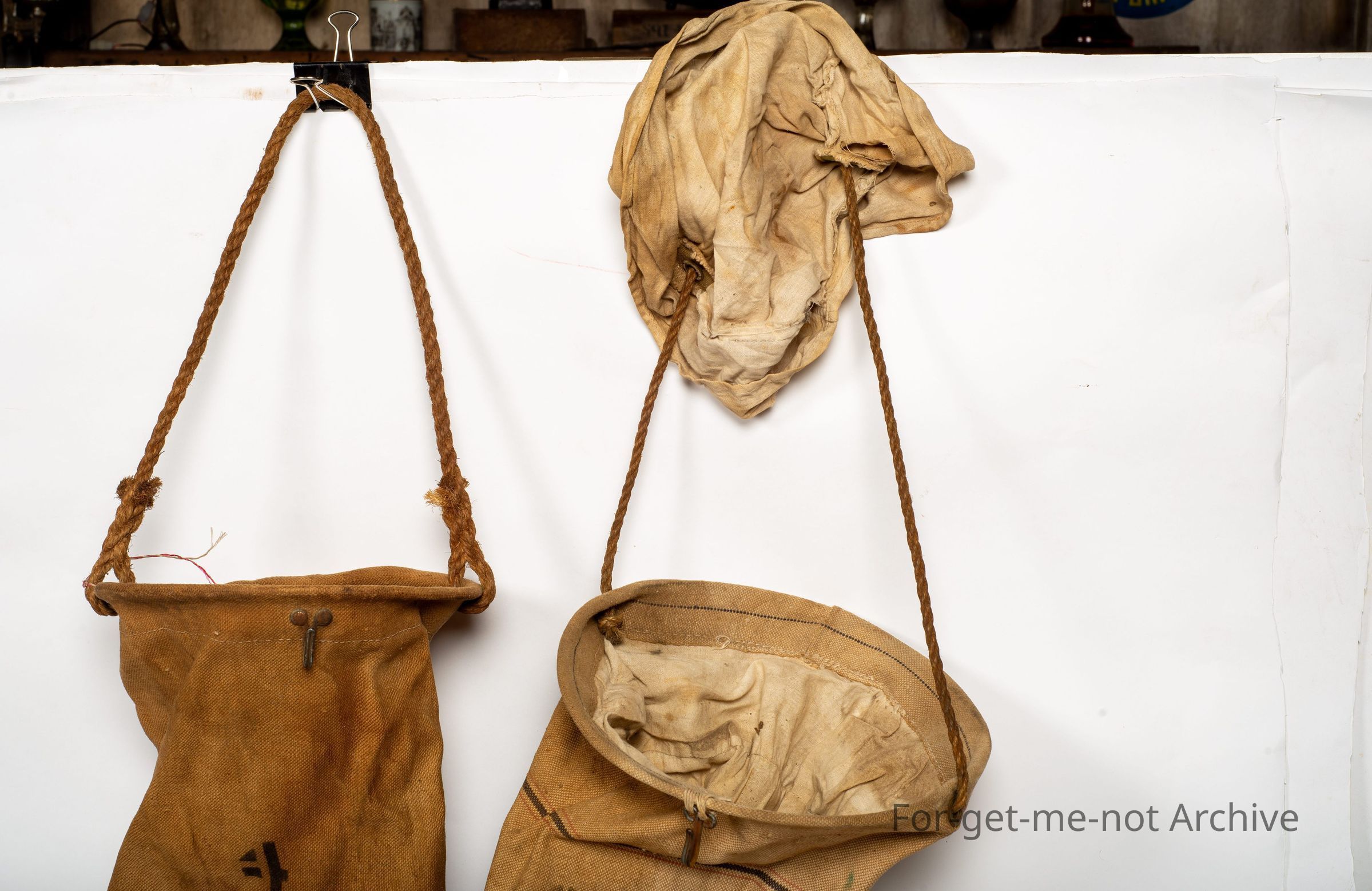 These are 2 glorious canvas veranda bags. One made by Gair's Makers Melbourne. These have double strainers in the top. The loose nozzle hangs up when you want the water. You put it down to fill up your, bottle or whatever. Both of them, considering the age and what they are used for, they're both in superb condition, they're very hard to find from an earlier time.Collection