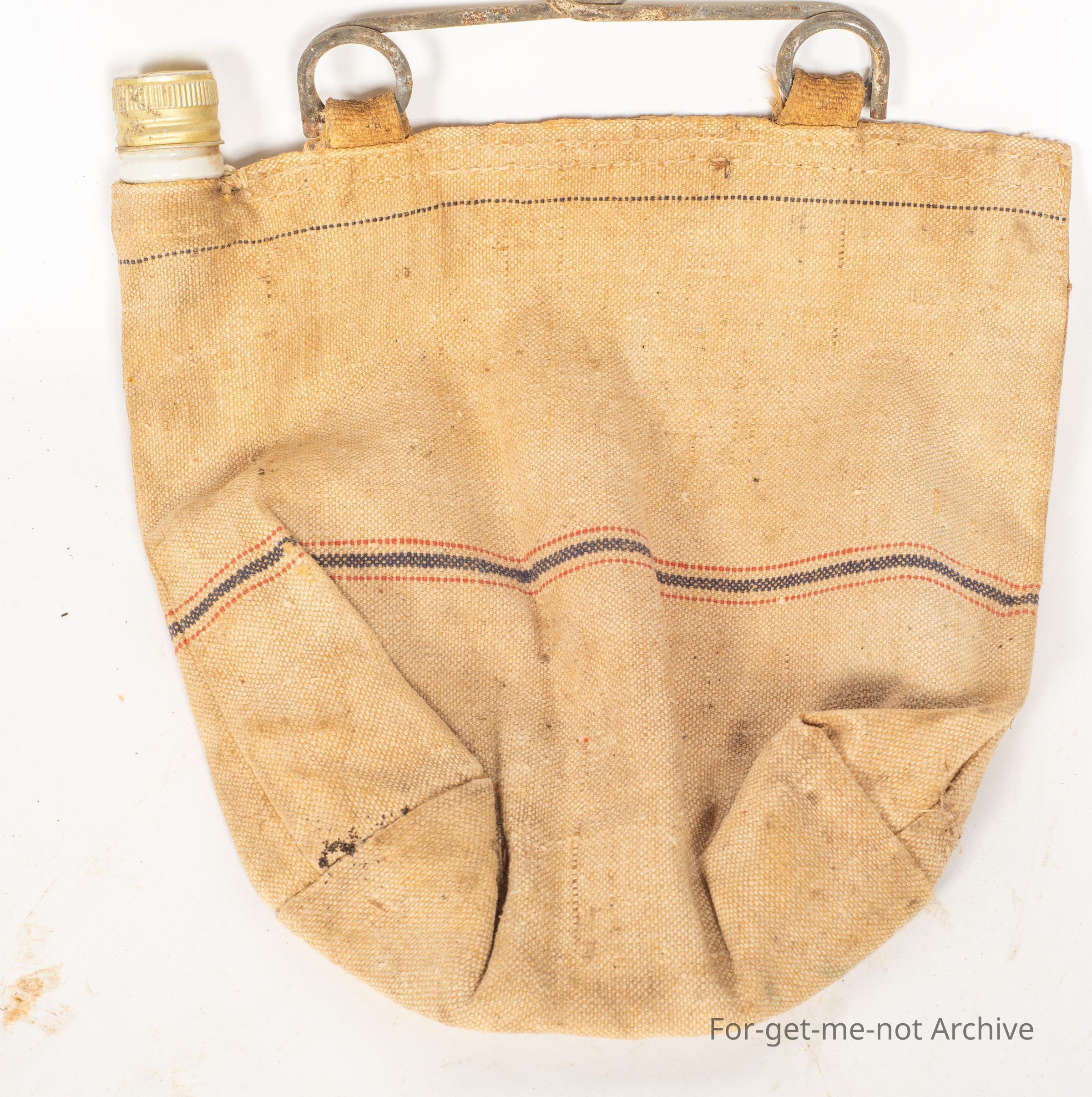 Another canvas flax water bag from the car. This one is a Pratts Special with a ceramic neck. The top from tomato sauce bottles fitted these necks perfectly. This one still has the lid screwed onto the ceramic neck. The wire attachment to put it on the front of the car is still there. Very good condition.Collection