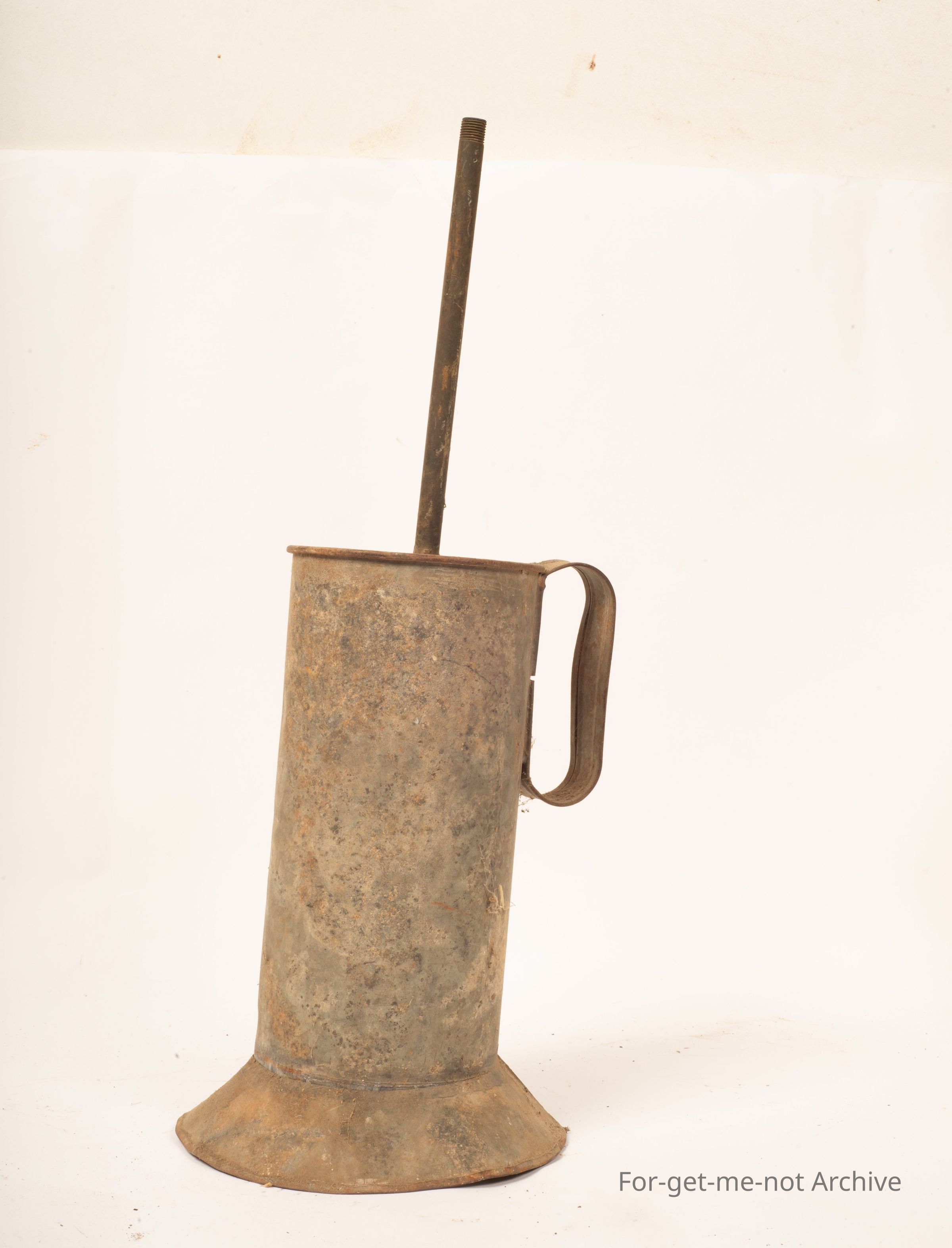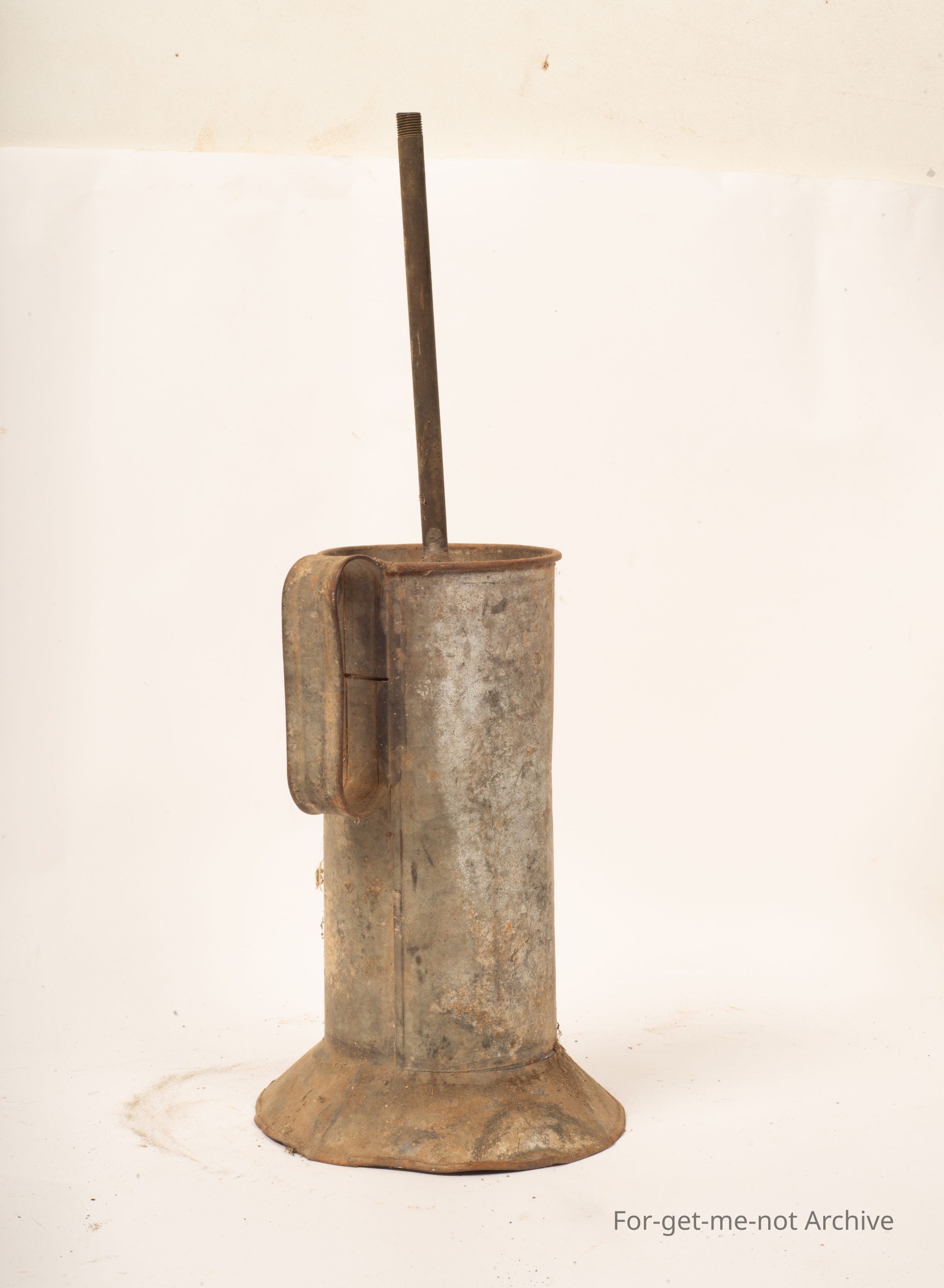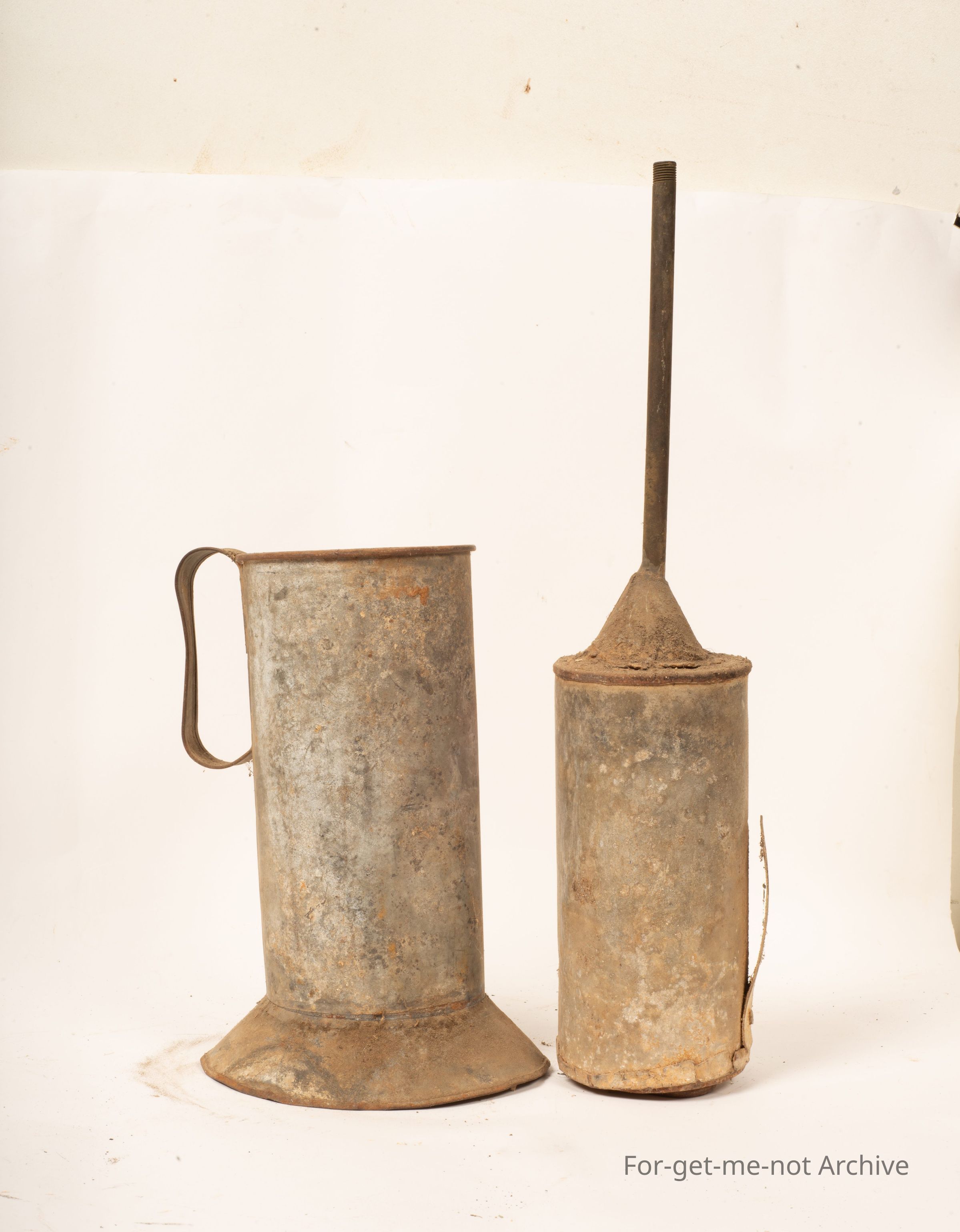 It's a classic piece of Depression era workmanship. A carbide light . This one is a complete unit, with the water sleeve, the copper funnel with the valve and the sleeve that fits inside with a handle. A lovely piece from an era gone by.Collection