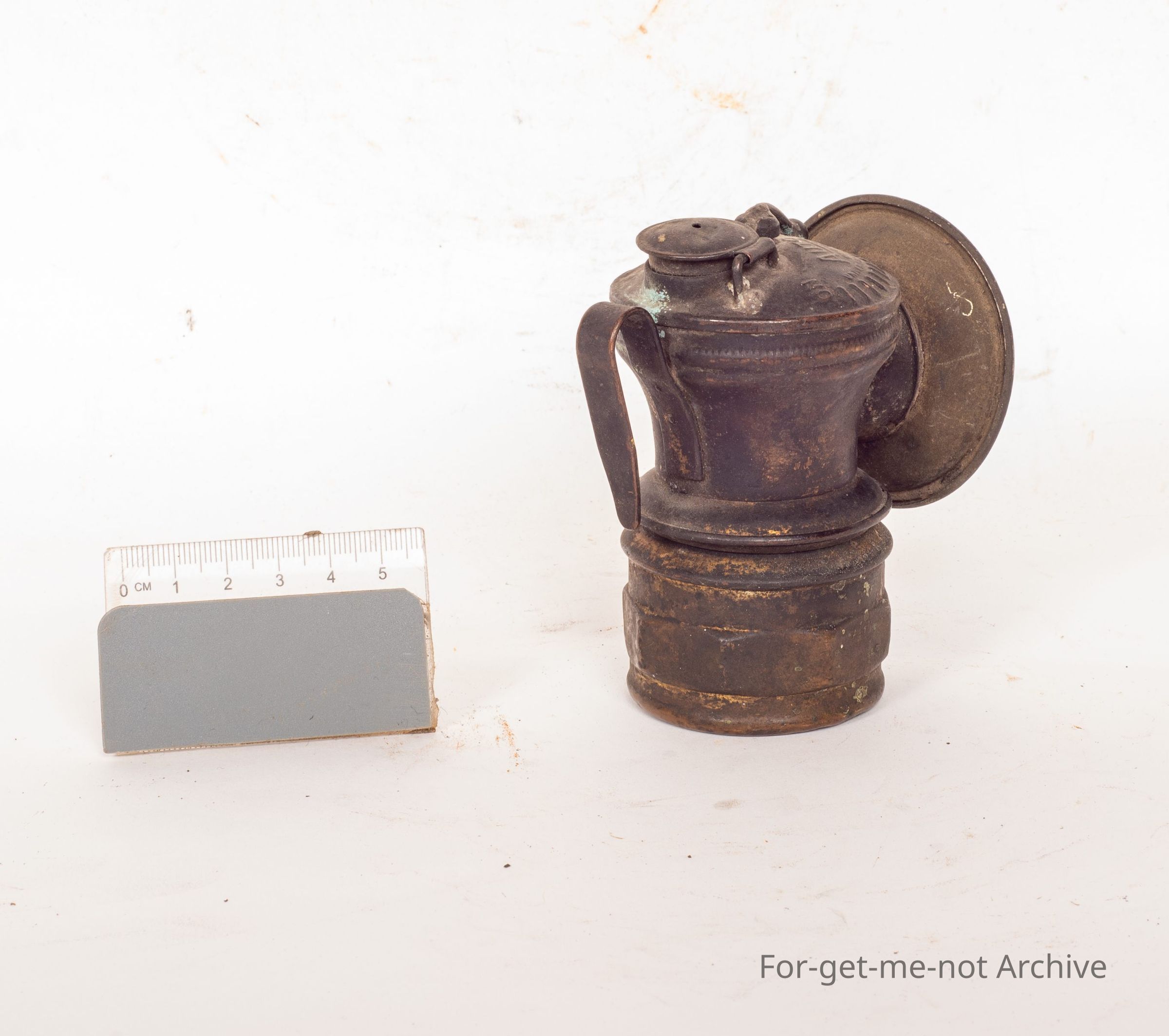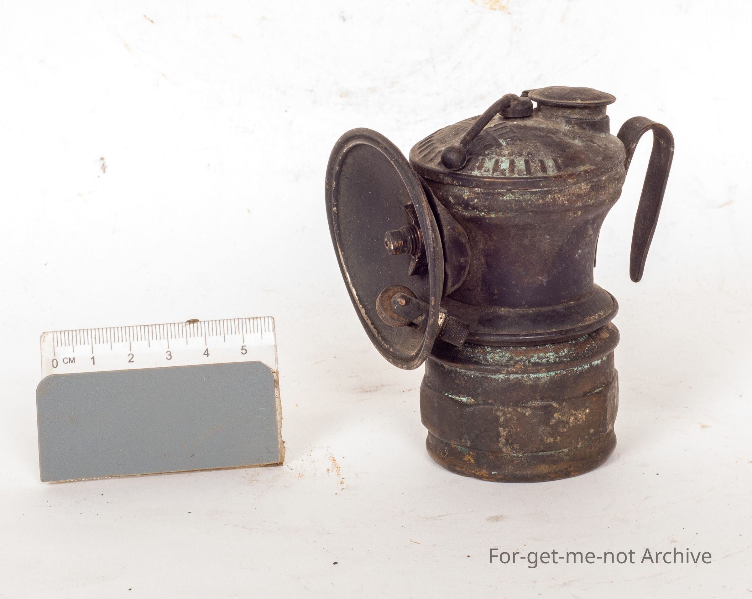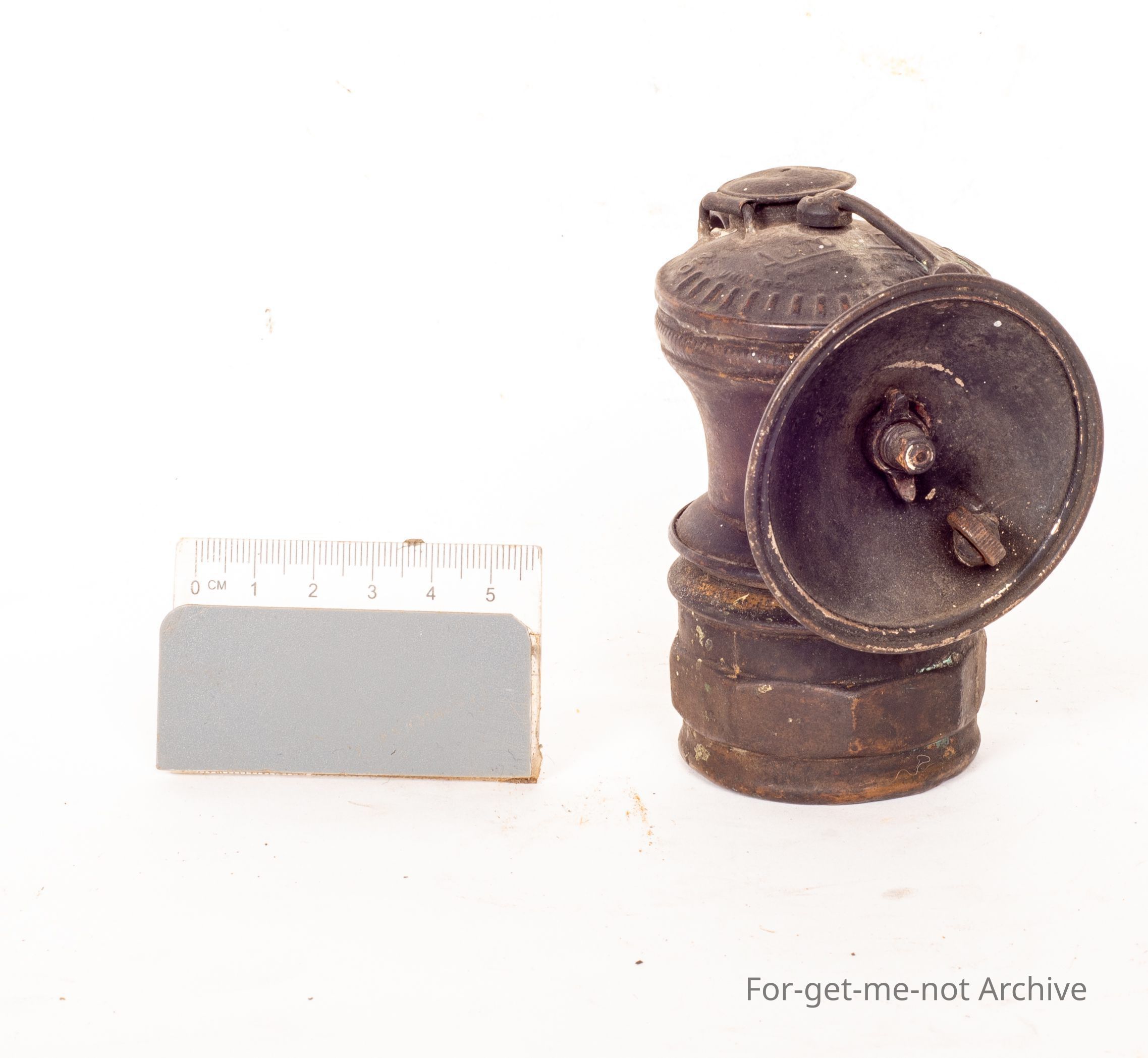 This is a very small carbide light. Made in USA called Auto Light Patent Universal Lamp Company. Smallest carbide light I've seen. Looks to be fully equipped with a flint, spark lighter, fuel tank, very tarnished.Collection