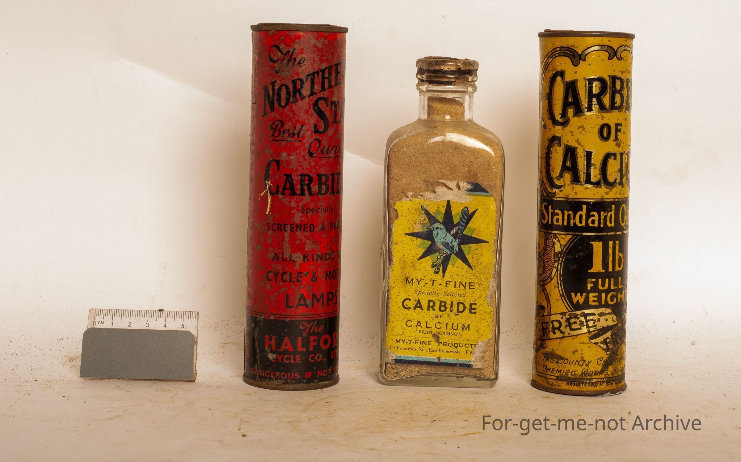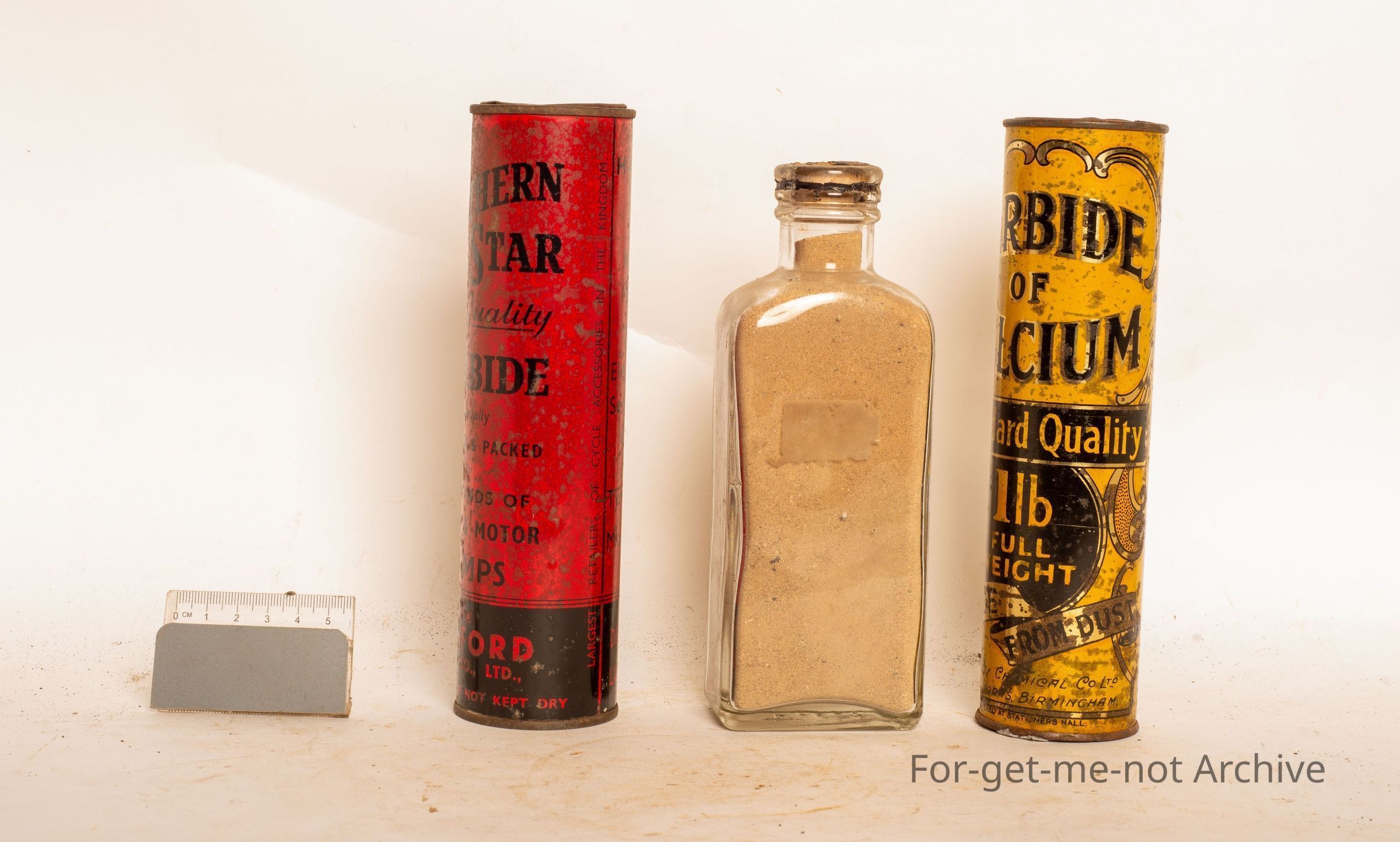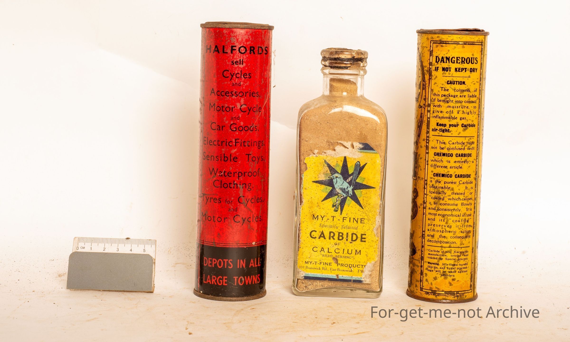 This is a bottle and 2 tins of carbide. Quite decorative tins. These are hard to find these days. The carbide in the bottle "My-T-Fine" has gone to powder due to moisture ingress, so useless.Collection