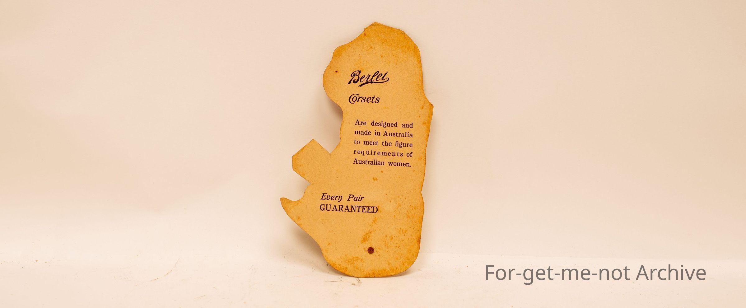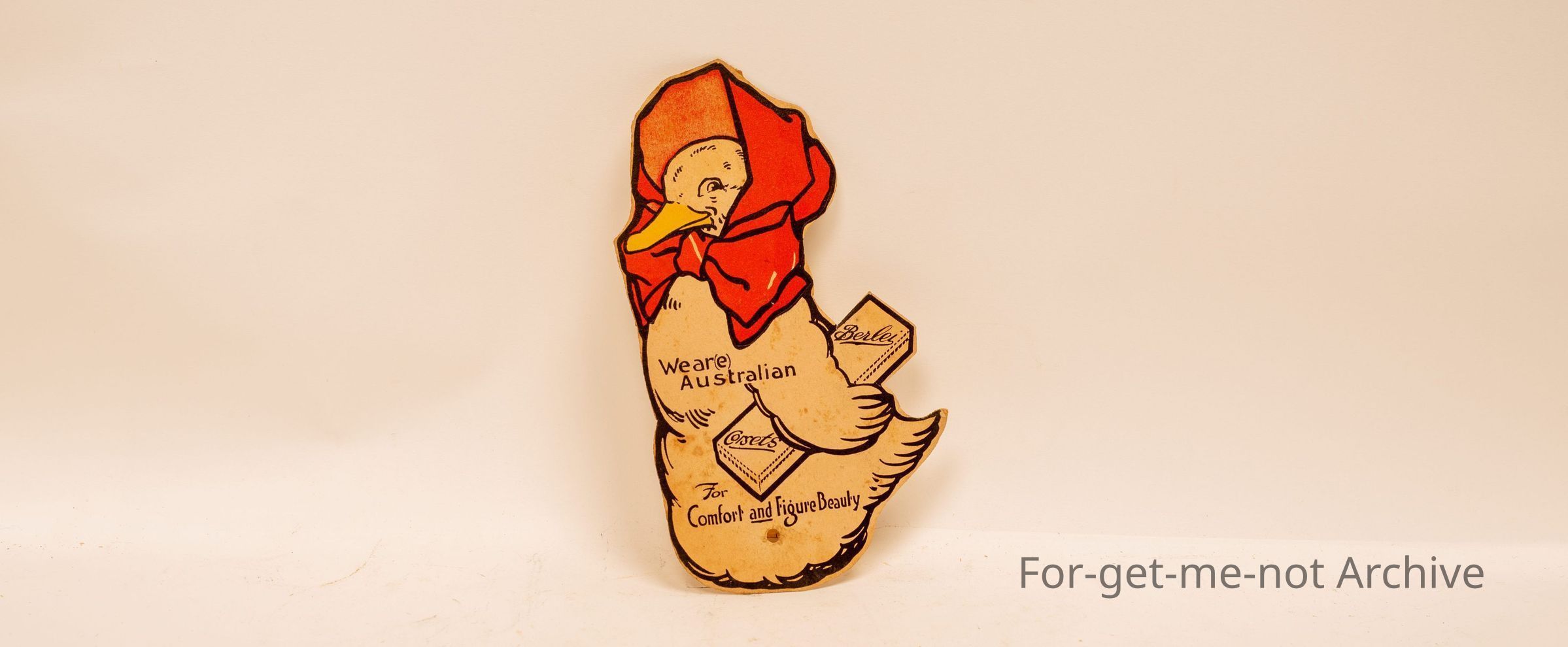 Cardboard "Wear Australian corsets from Burley Comfort and Figure Beauty" in the shape of a duck.